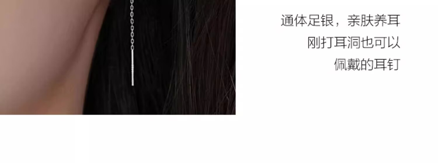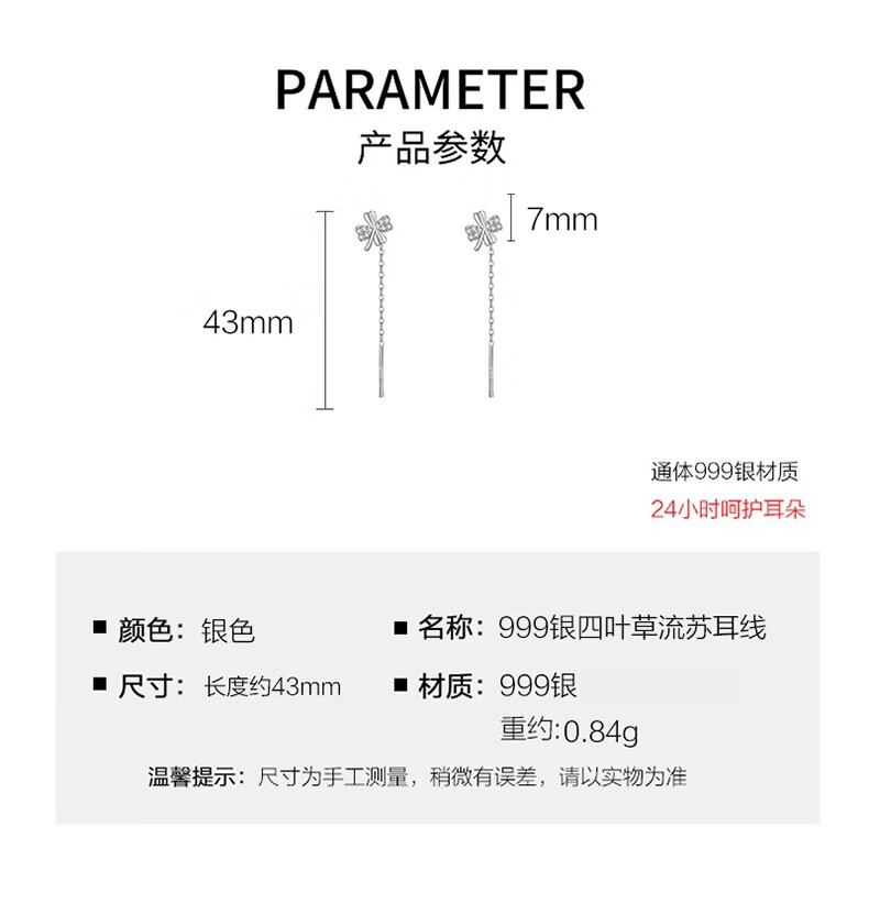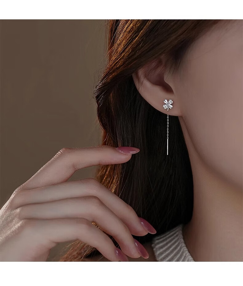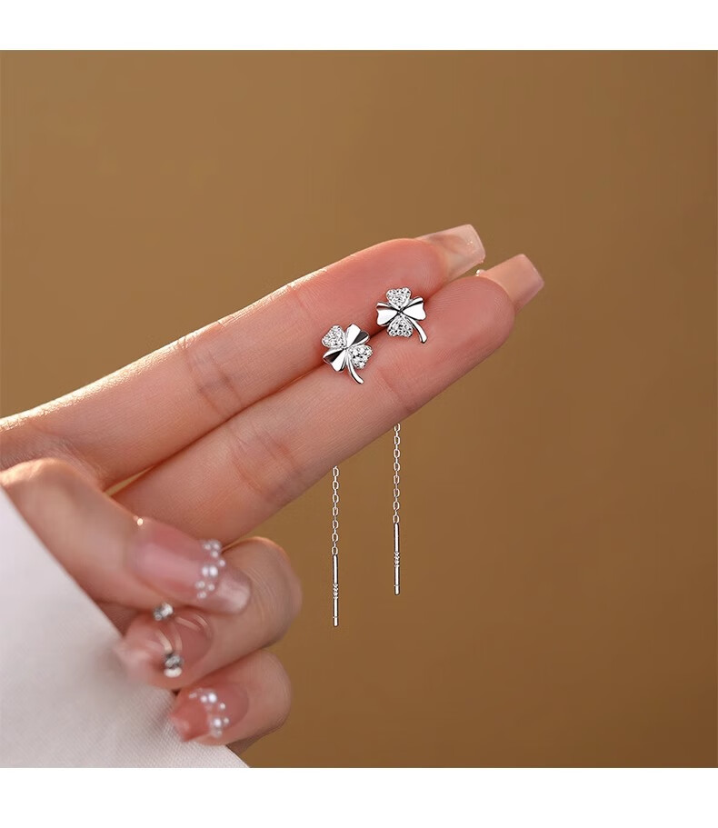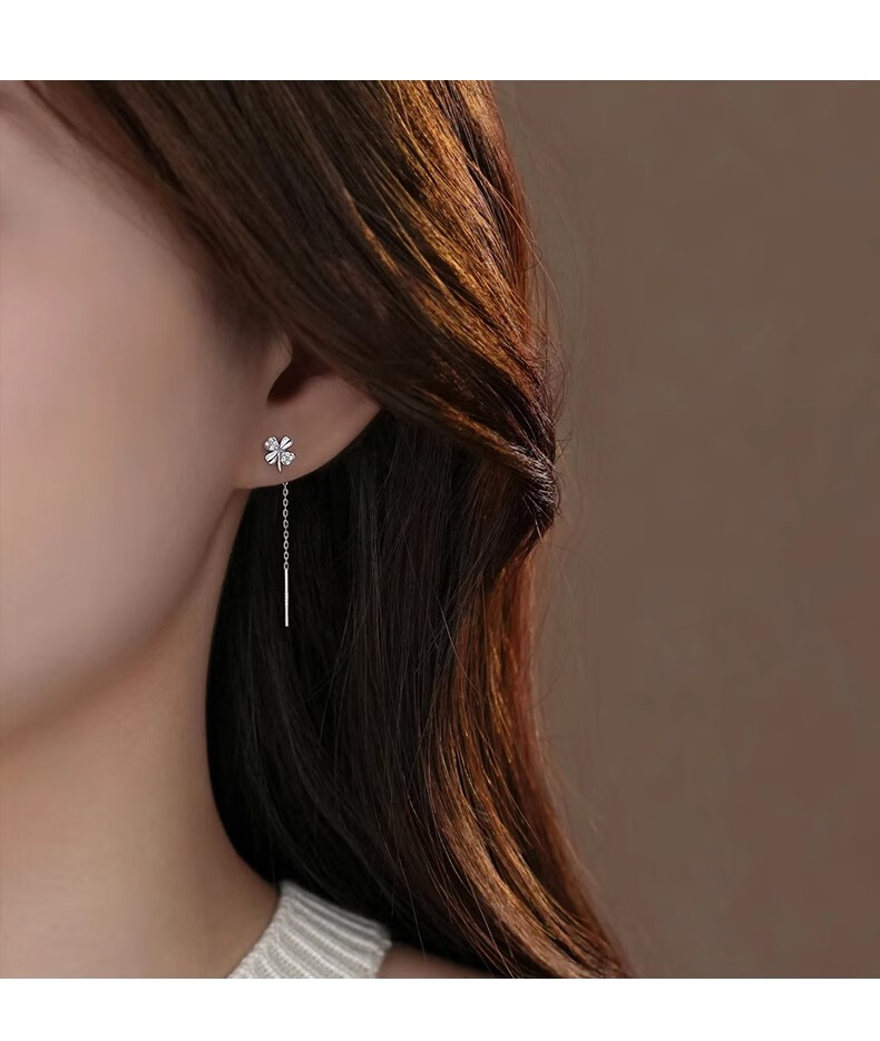 BJYLS999 pure silver four-leaf clover ear wire for women, long style, no need to take off sterling silver earrings, earrings, earrings, earrings for women, S999 pure silver four-leaf clover tassel ear wire (pair)