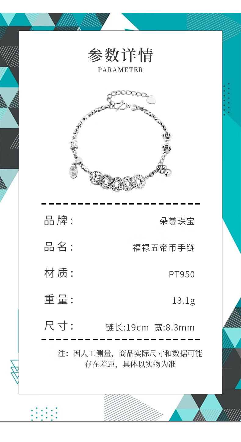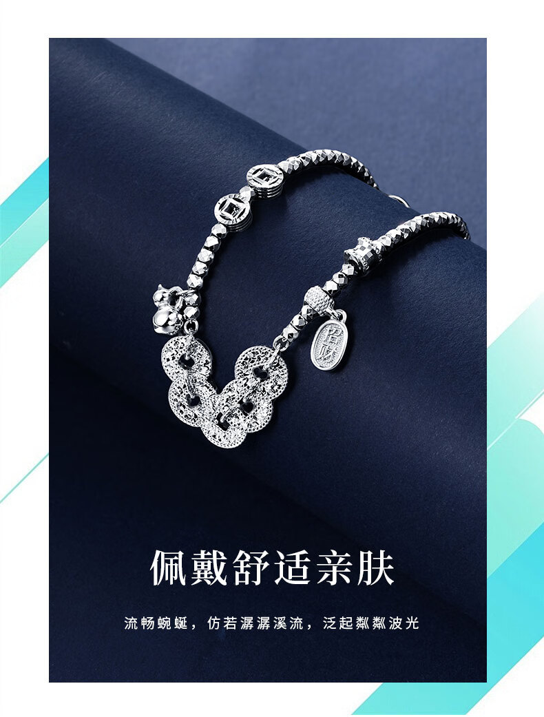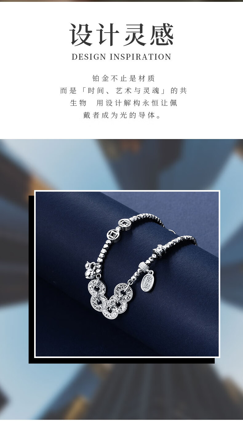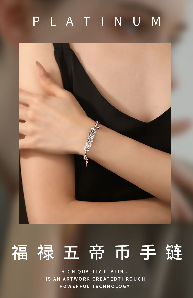 Pt950 genuine platinum bracelet for women with flashing platinum to attract wealth and fortune, Five Emperors coin bracelet, copper coin as a gift, 13.93g/length 16-19cm adjustable