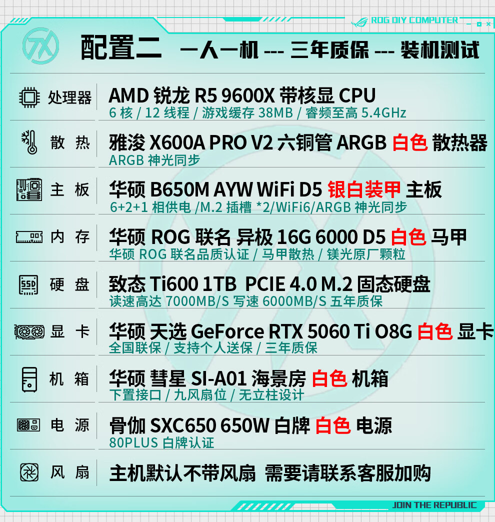 ASUS Tianxuan family bucket AMD 9600X/RTX5060Ti host white sea view room RTX5070 graphics card desktop assembly computer e-sports game design AIDIY complete machine with one 9600X+RTX5060 Tianxuan