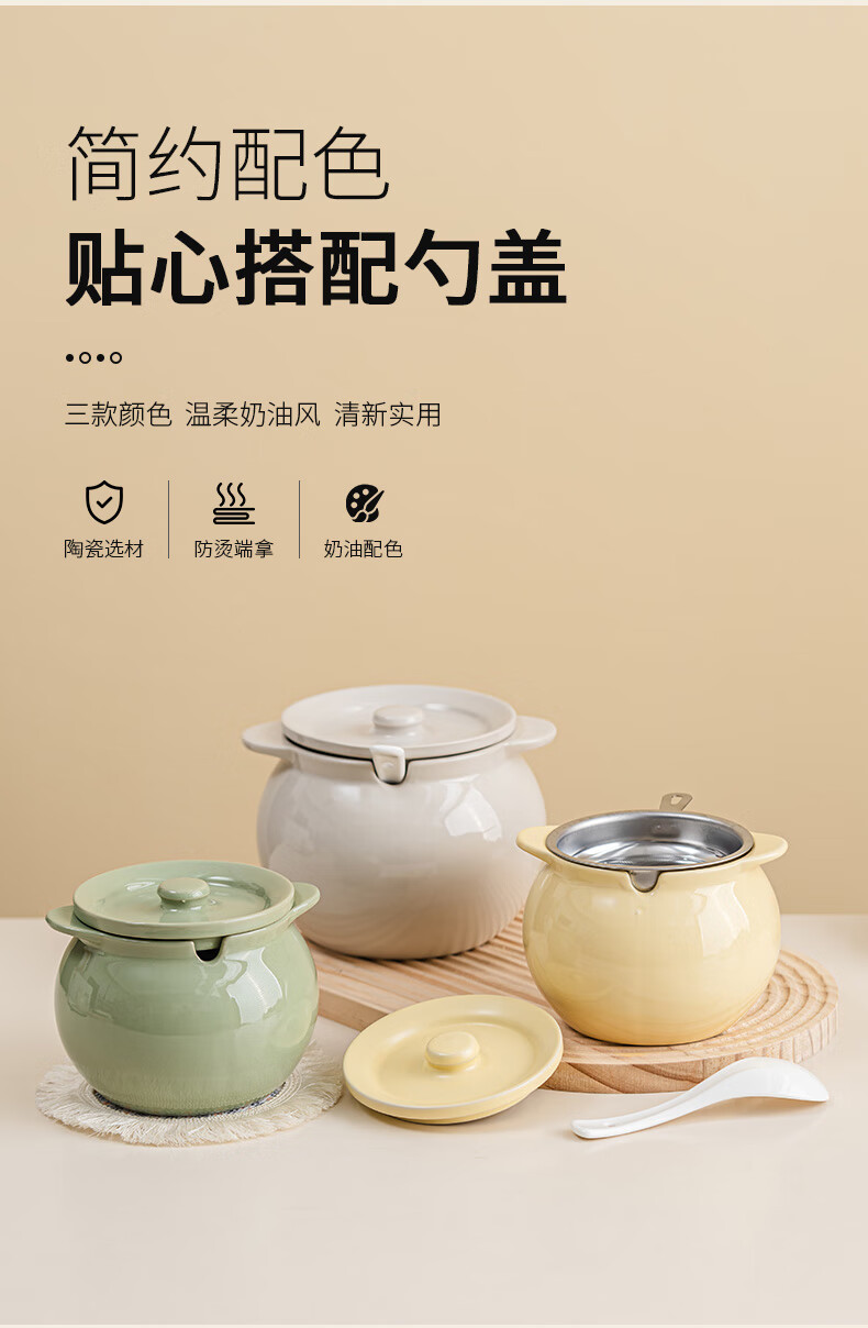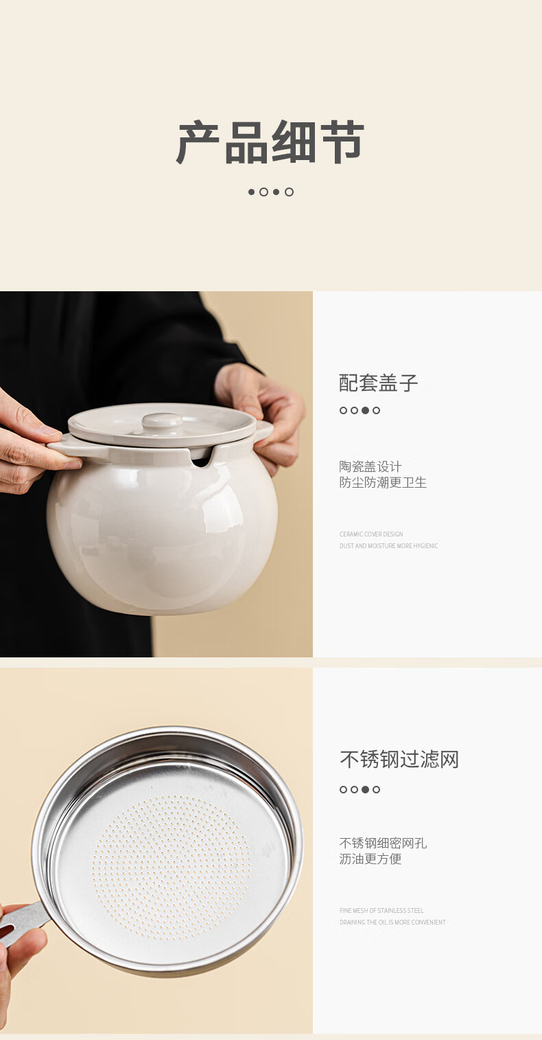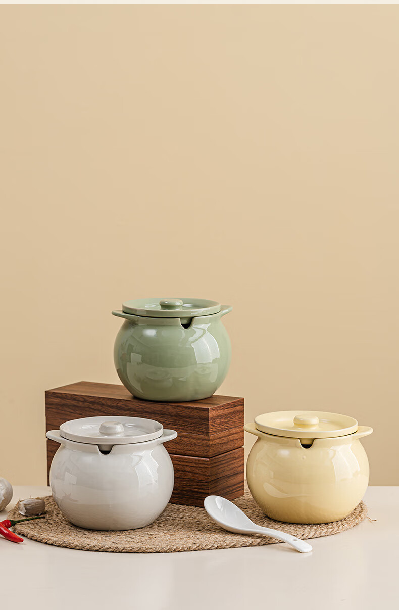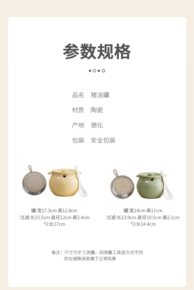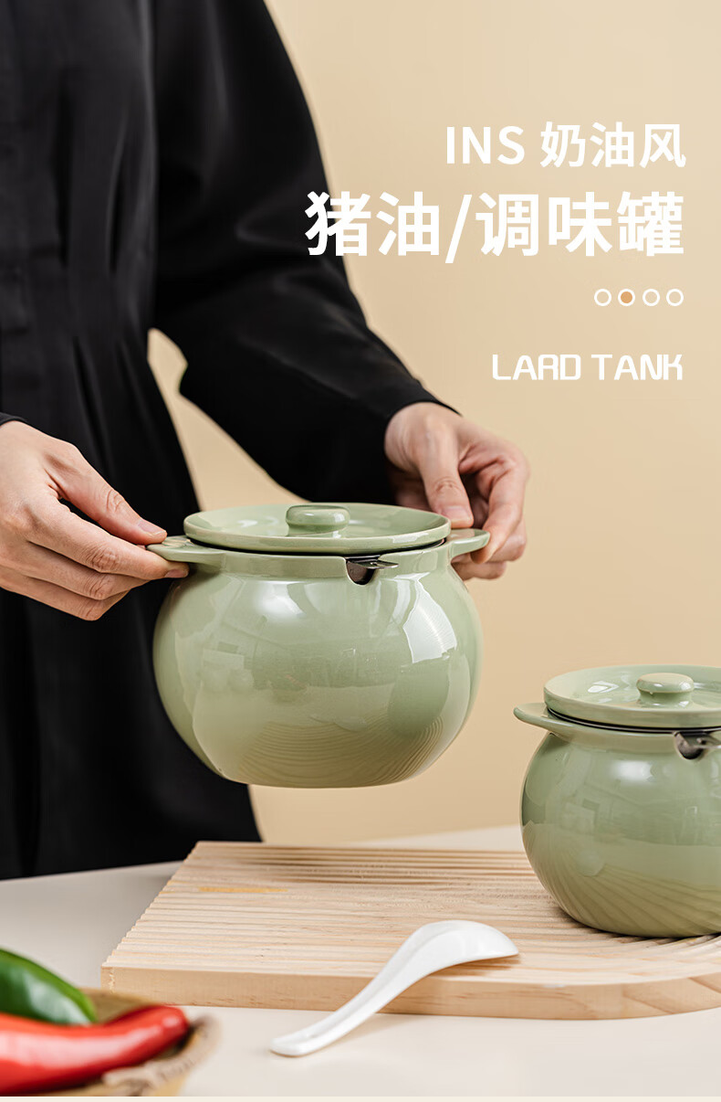 Yundi lard tank kitchen household high temperature resistant ceramic with lid spoon filter red oil filled meat oil chili oil tank storage tank 700ML lard tank (with spoon) milk white (2 pieces) as shown in the picture