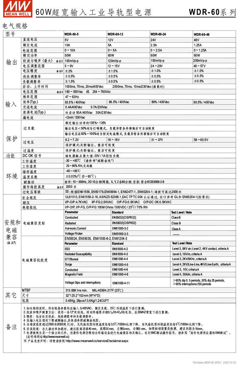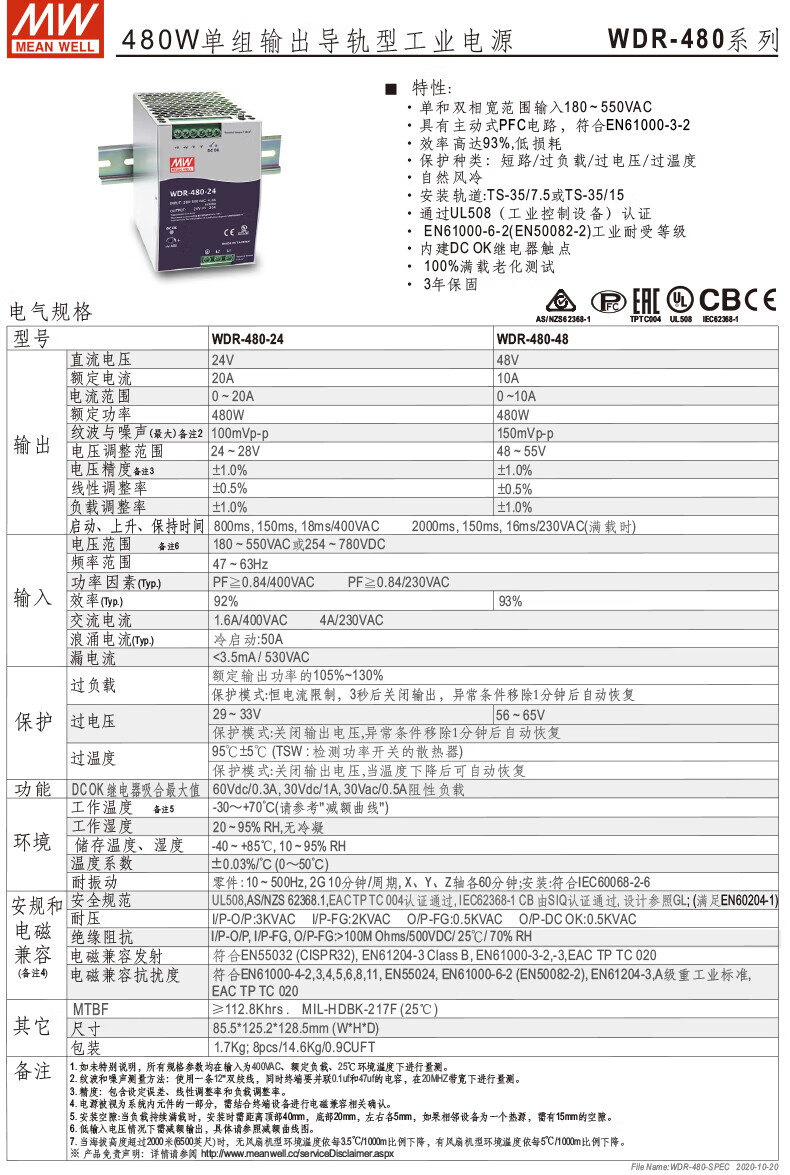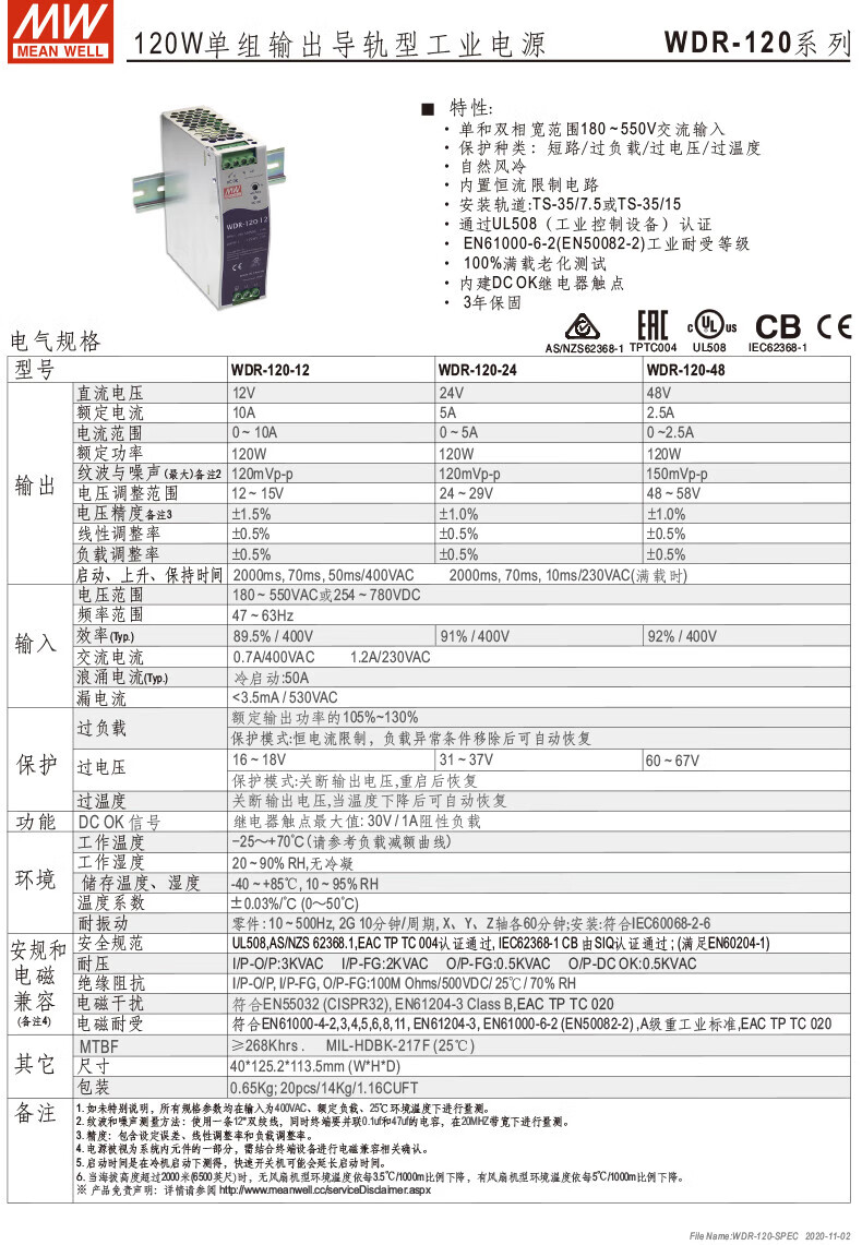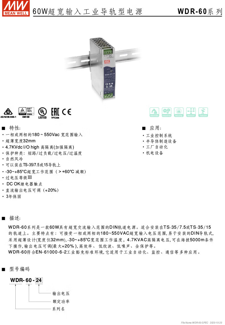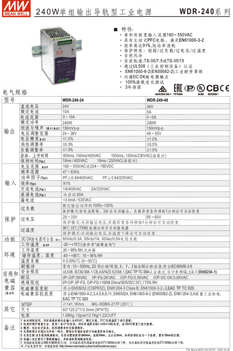 MEAN WELL guide rail 60/120/240/480 switching power supply 5/12/24/48 ultra-wide voltage input WDR-240-24