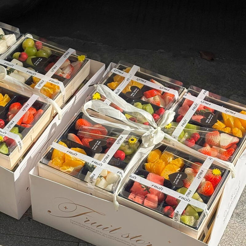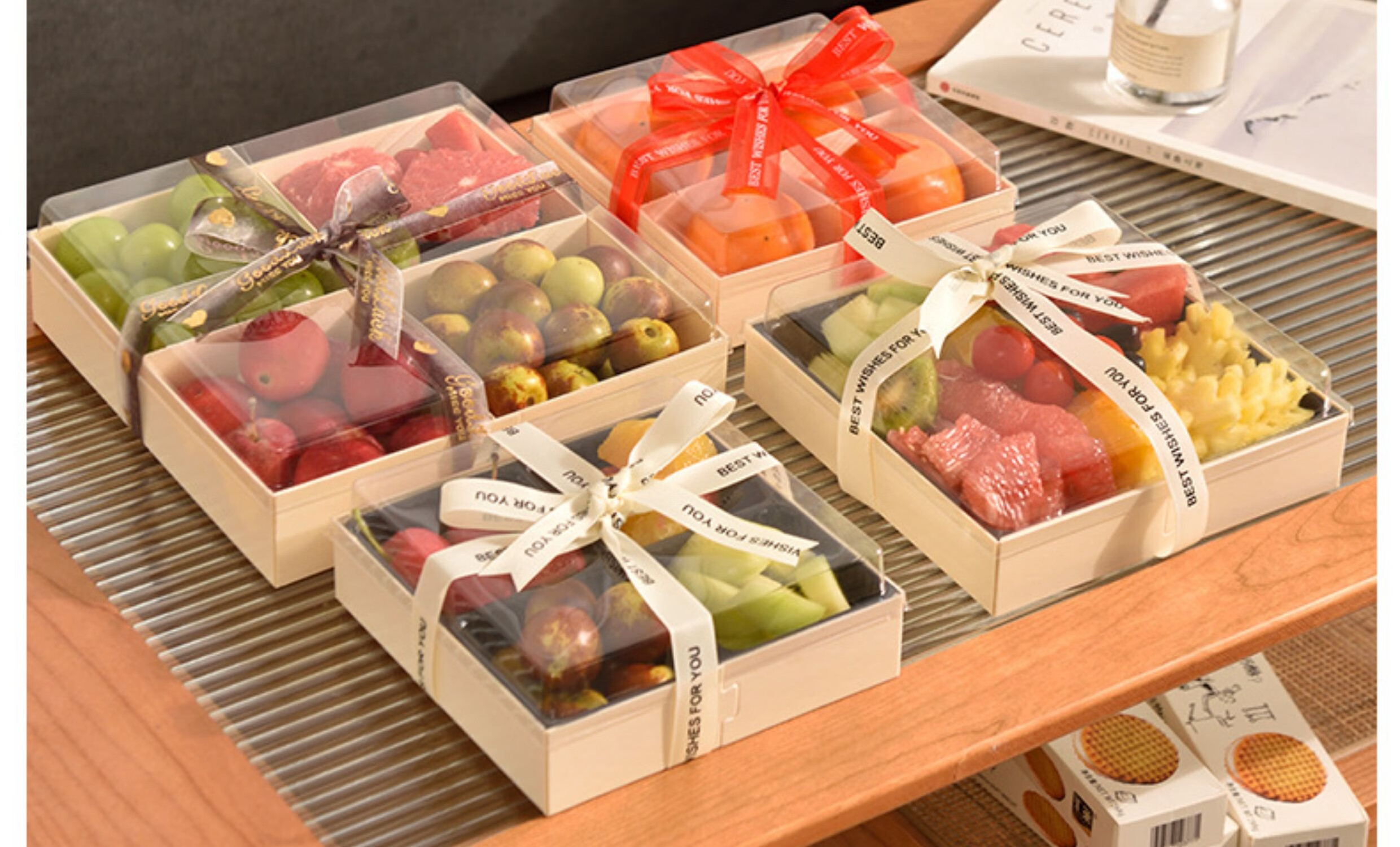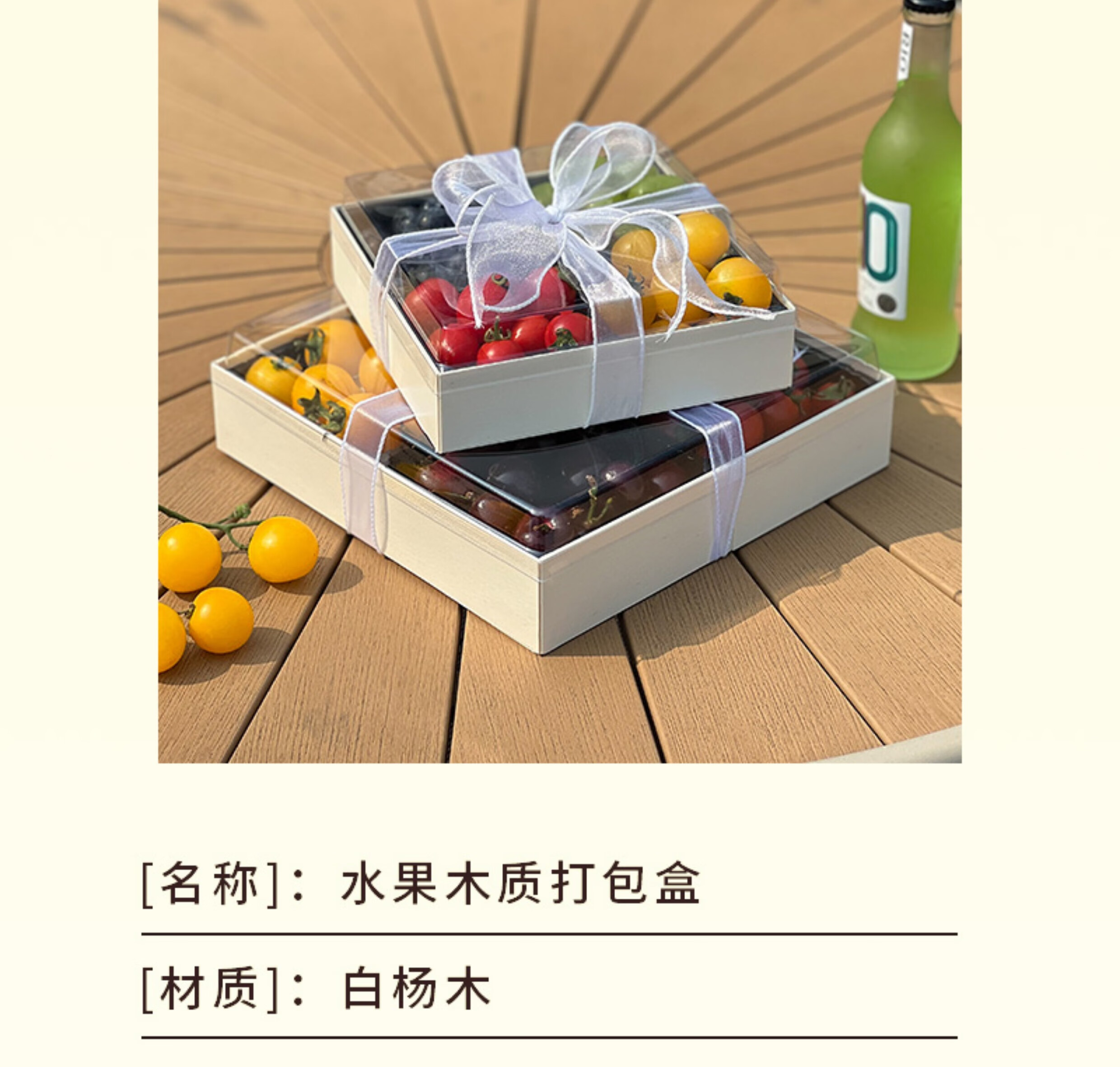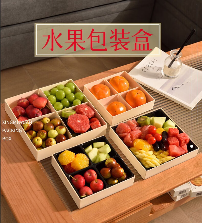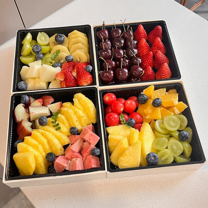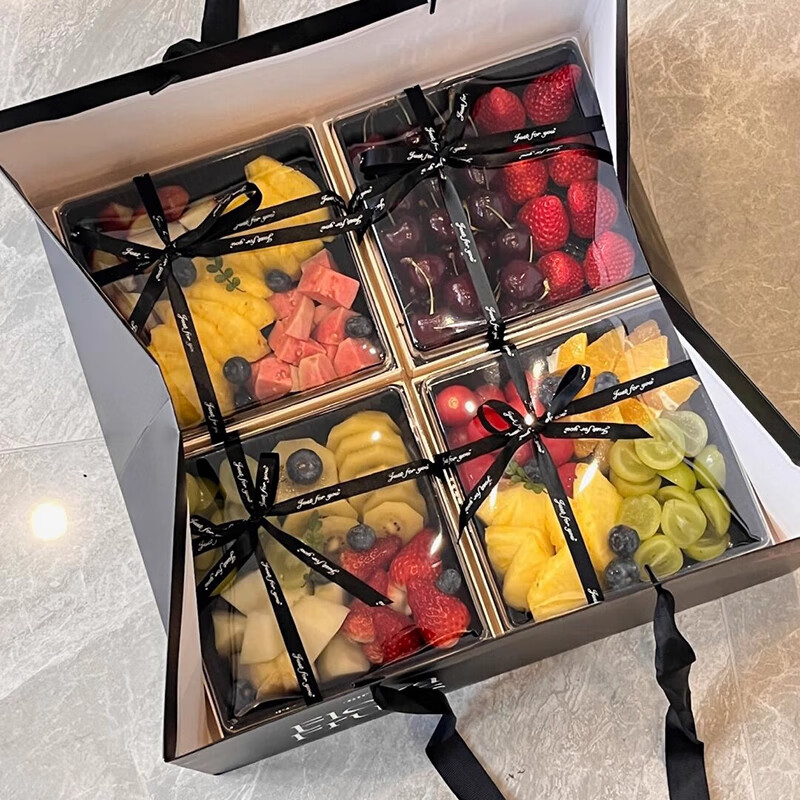 Le Xicong disposable fruit cutting packaging box dessert four-grid wooden paper high-end packaging box sushi sashimi packaging box four-grid wooden packaging box 18cm 10 pieces with ribbon