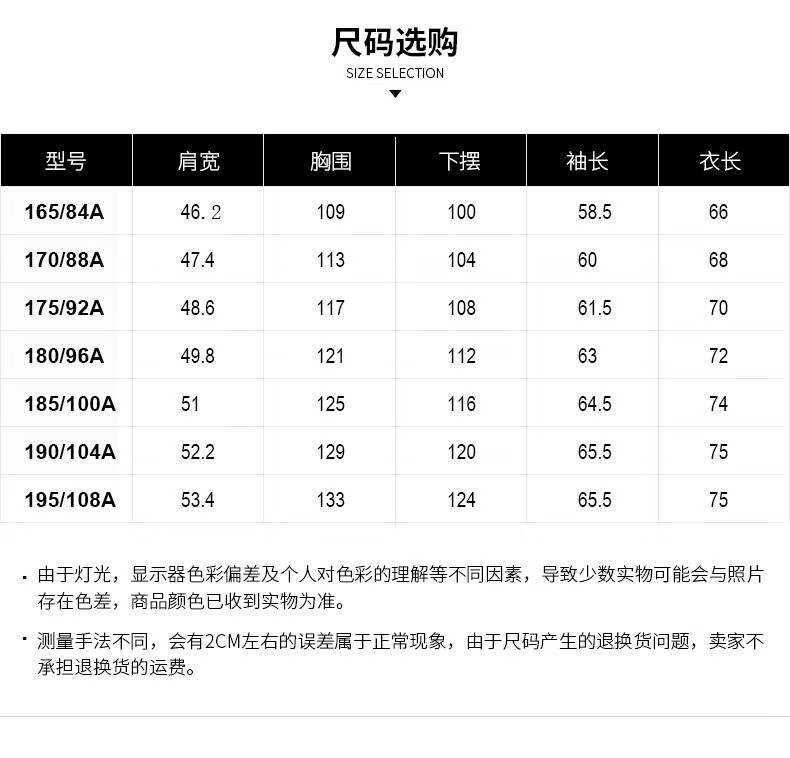 China (cm) 165 / 88-90 170 / 96-98 175 / 108-110 180 / 118-122 185 / 126-130