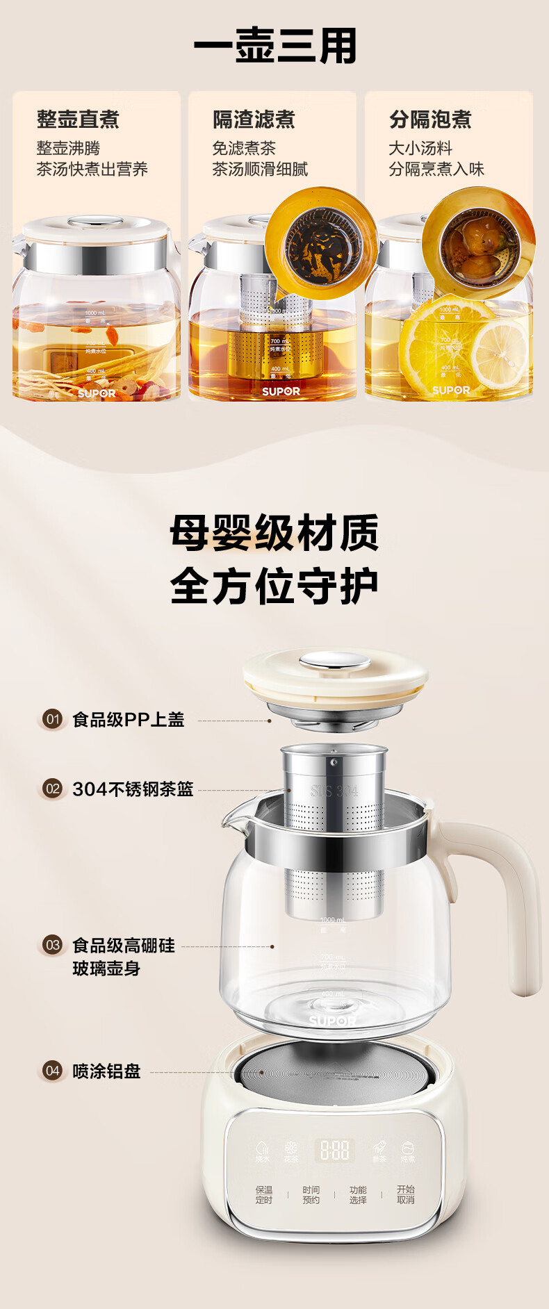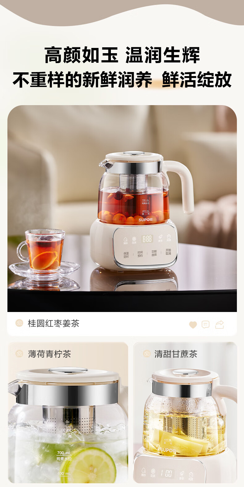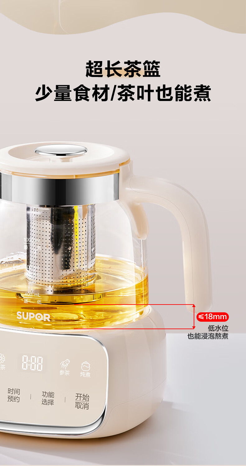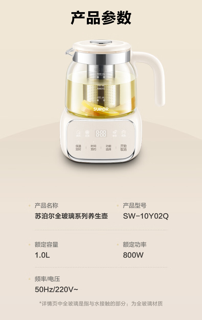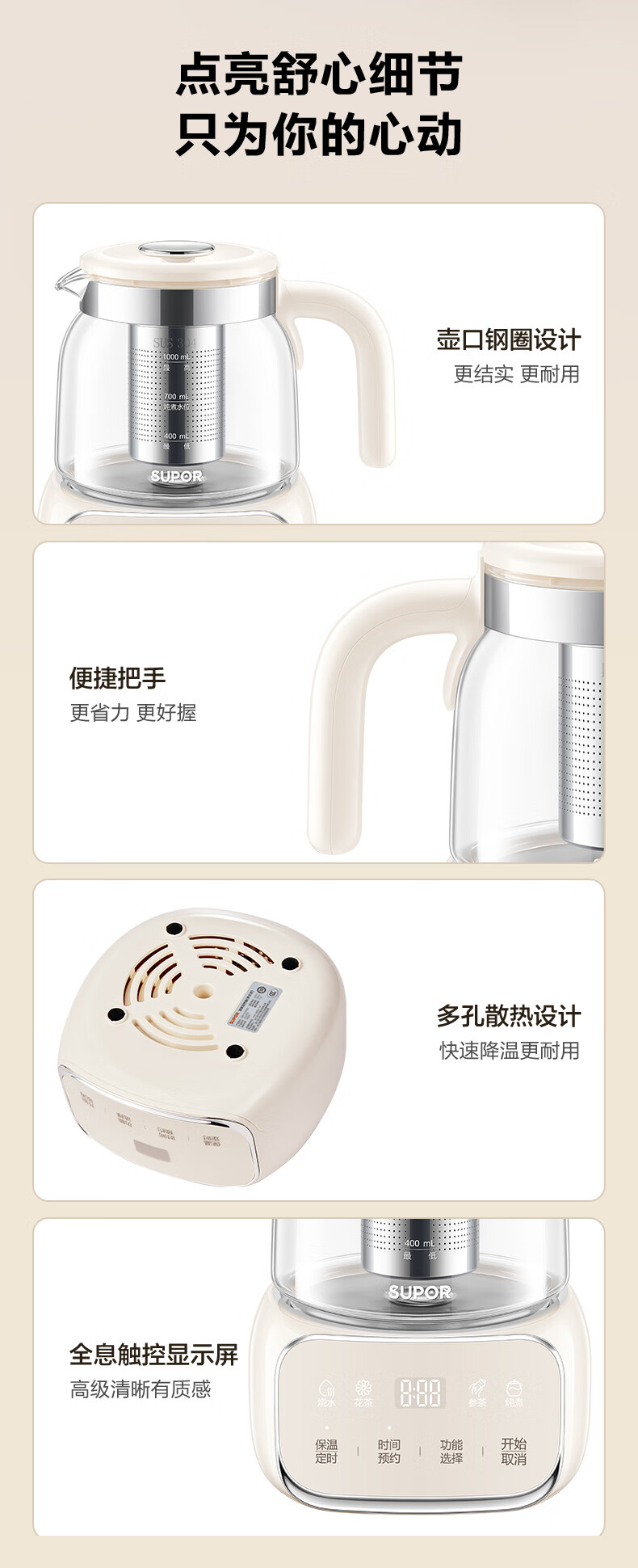SUPOR health pot all-glass kettle office mini tea maker stew all-in-one teapot household flower teapot small thermostatic pot 0 glue health electric kettle touch + 304 stainless steel filter 1L 10Y02Q