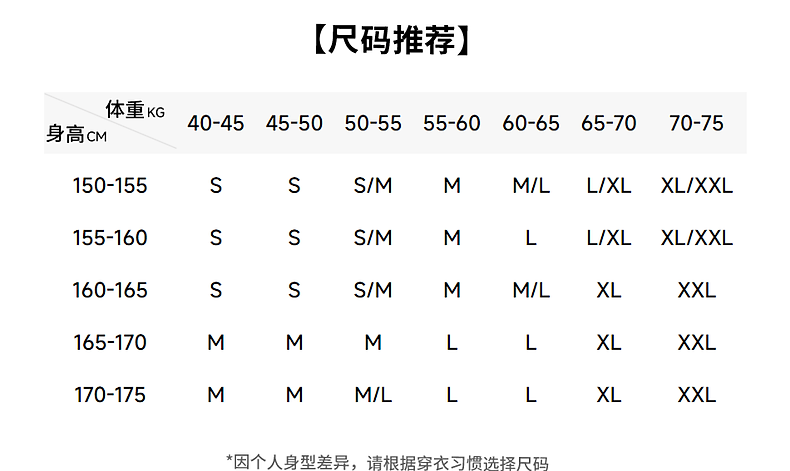 China (cm) 160-165/84-86 165-170 / 88-90 167-172 / 92-96 168-173 / 98-102 170-176 / 106-110