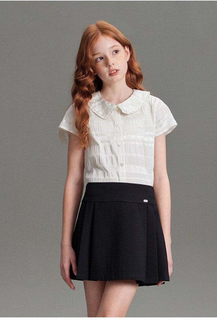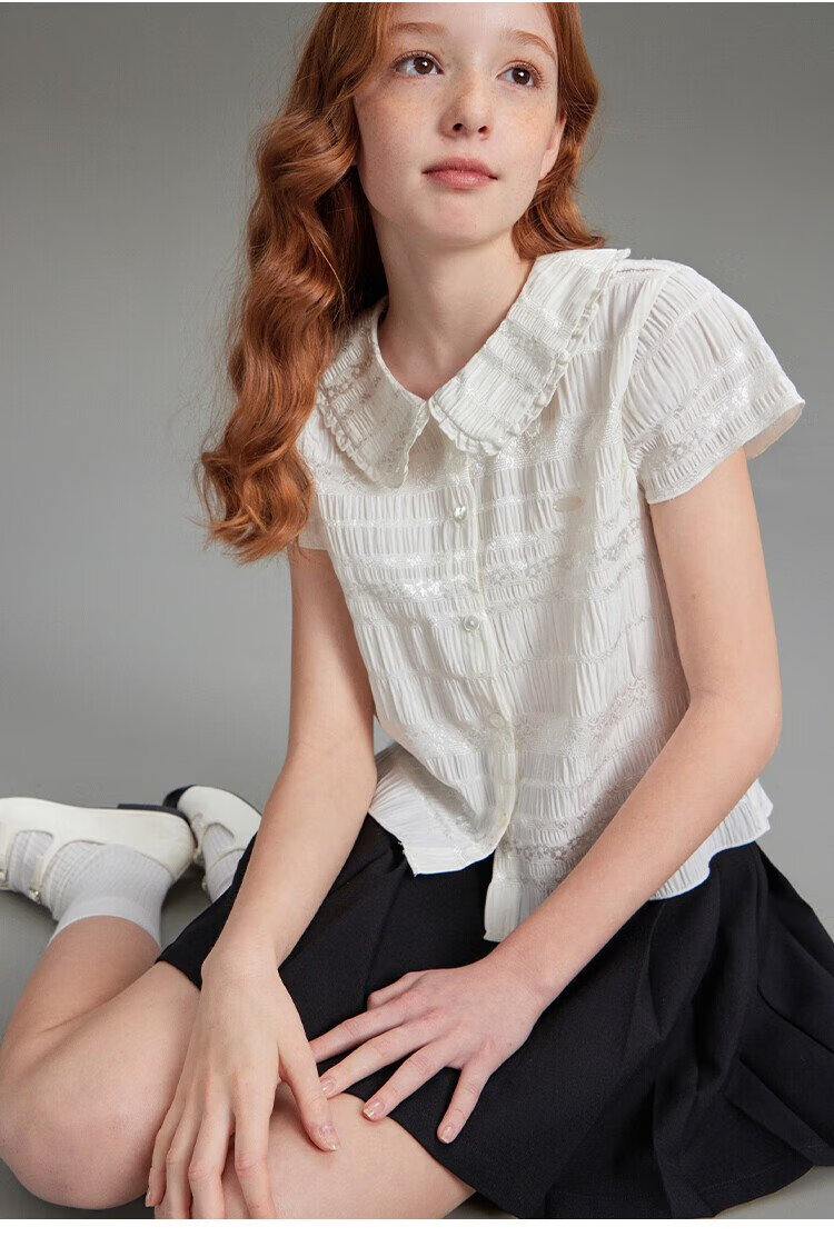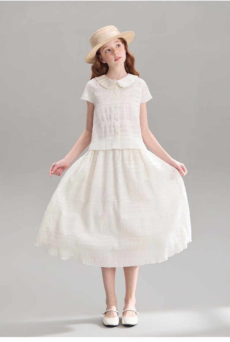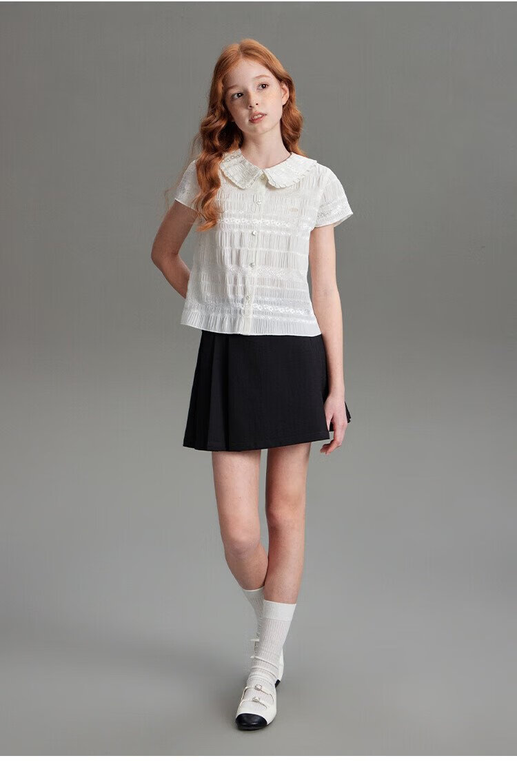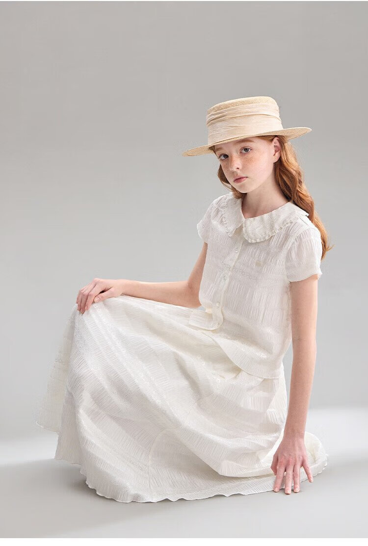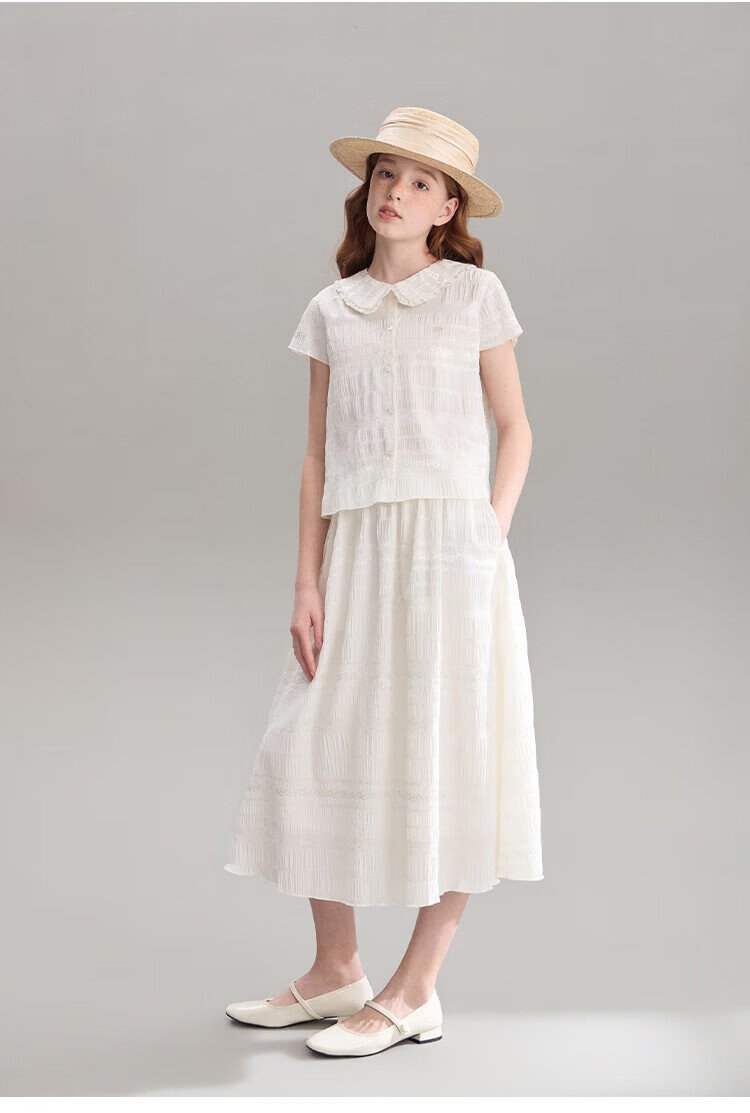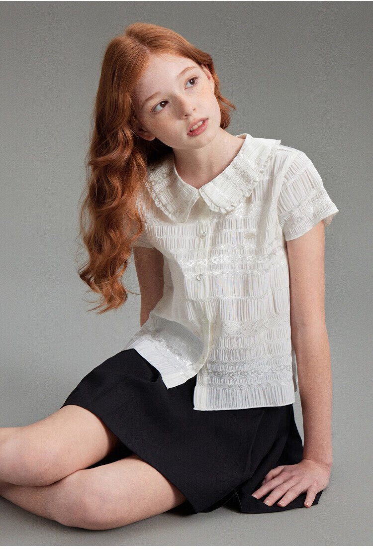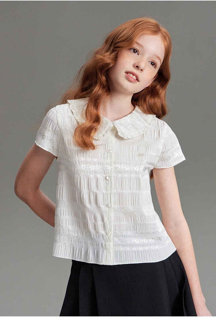 ELLE KIDS children's clothing floral jacquard short-sleeved shirt girls summer new French elegant resort style top pearl white 165 (M)