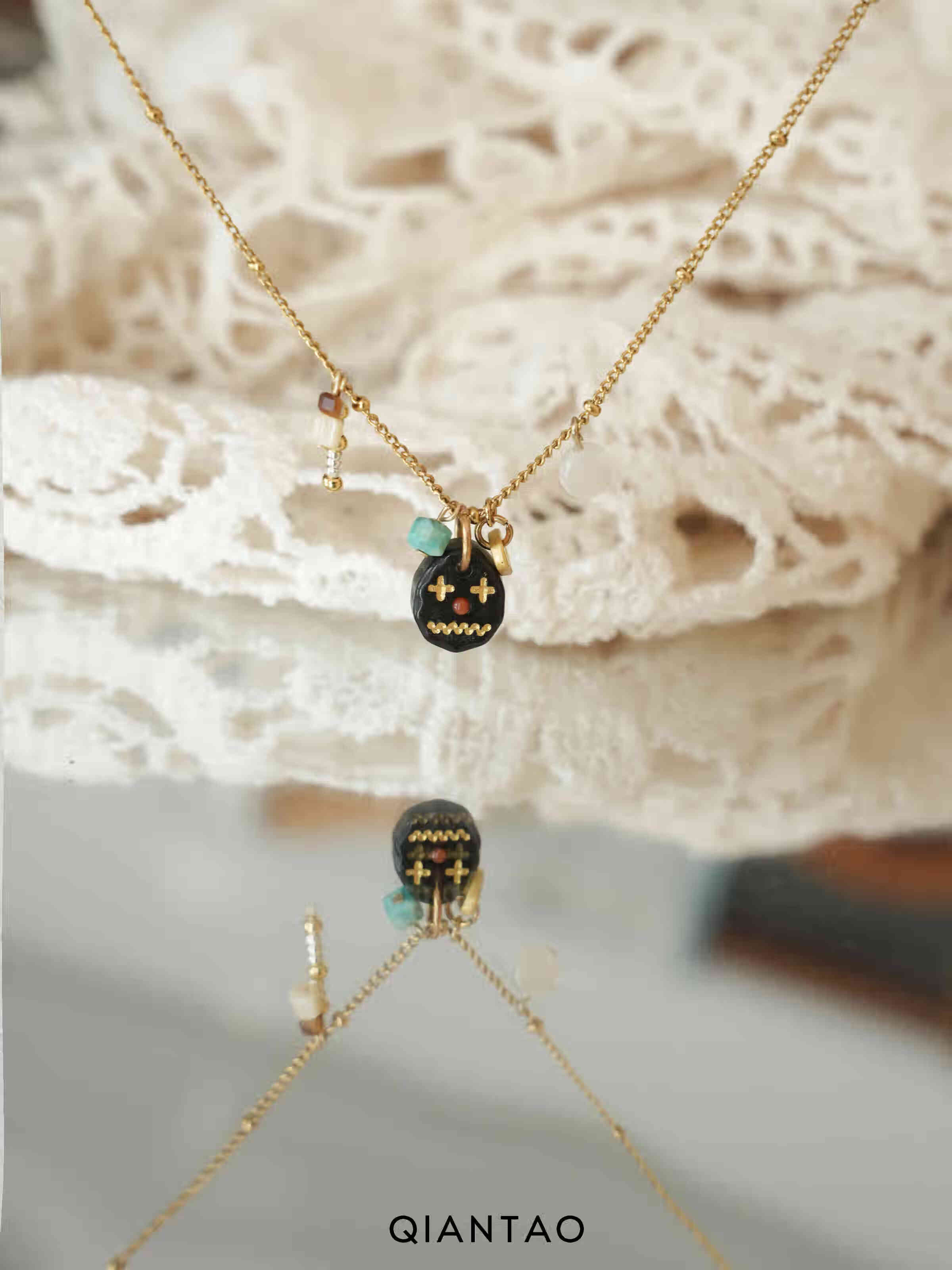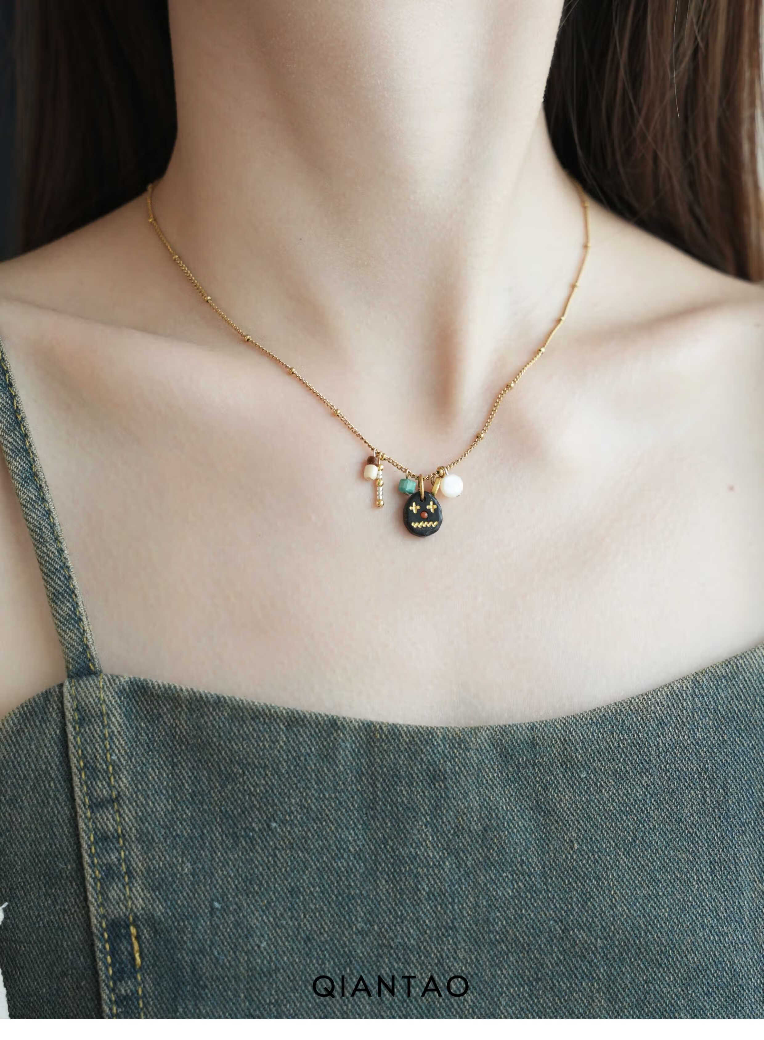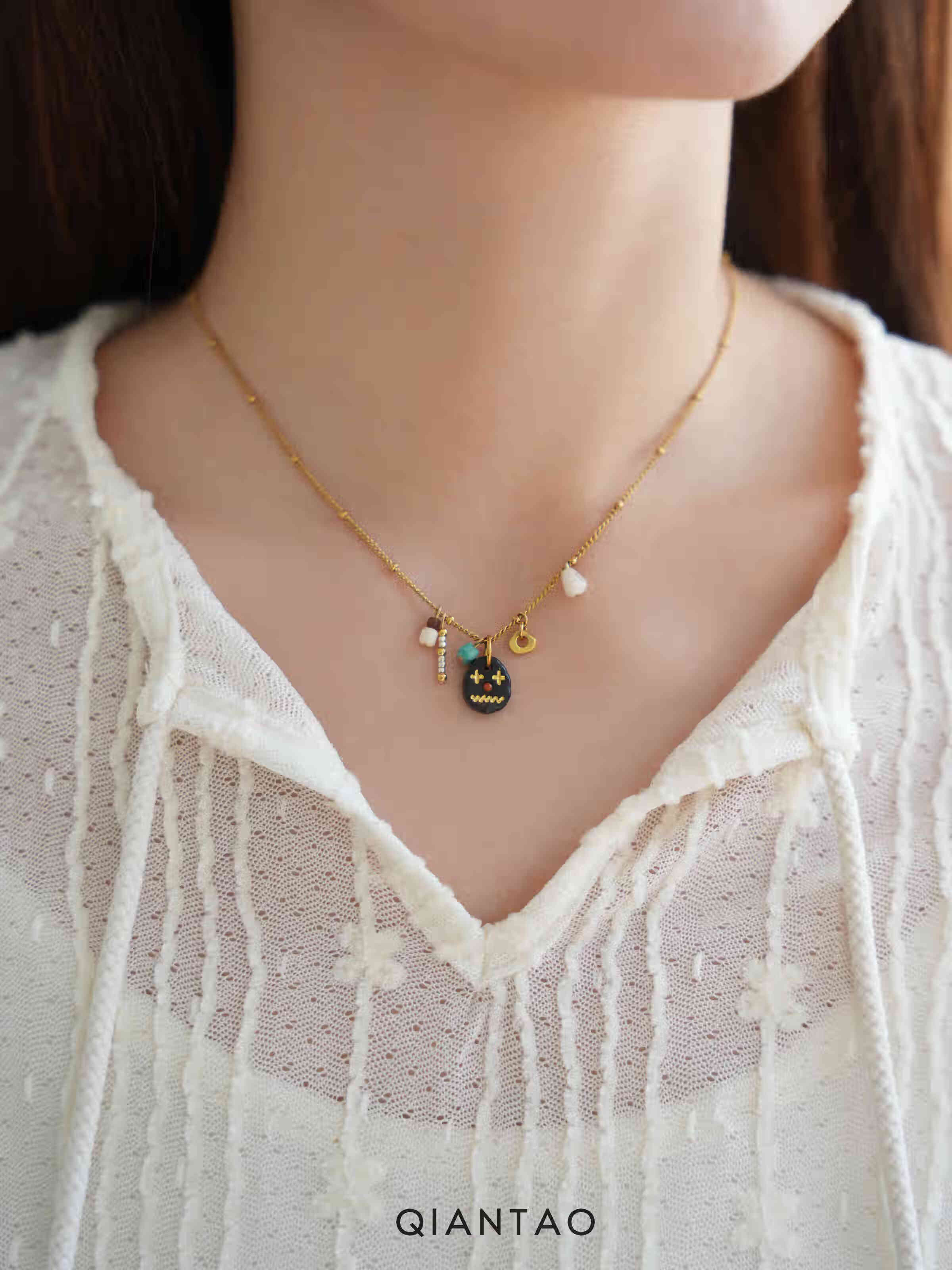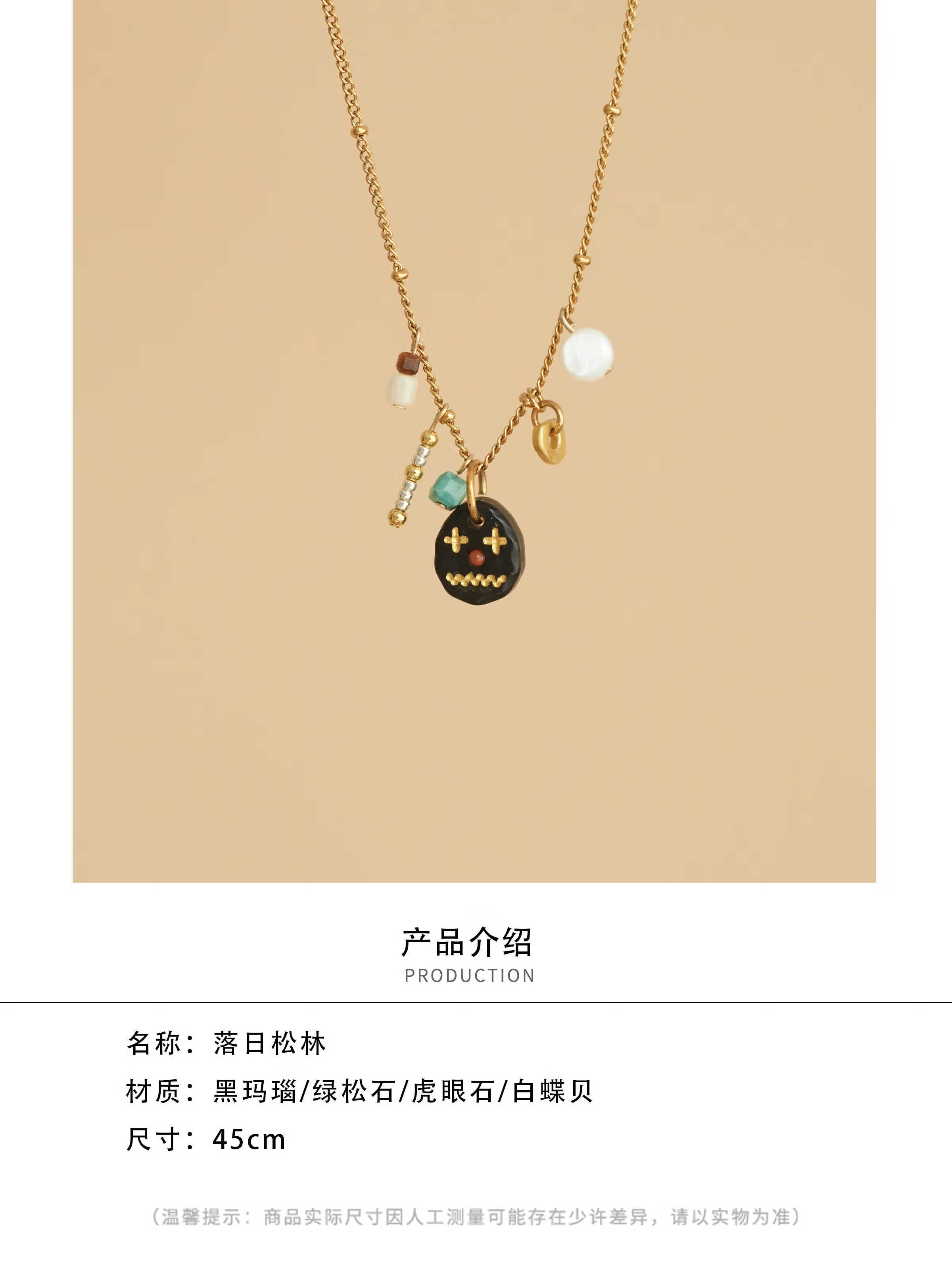 Only pair of QIANTAO Sunset Pine Original Natural Black Agate Necklace Simple Versatile Turquoise Pendant Women's Gift 45cm Imported Medical Steel Plated with 18k Gold Sunset Pine