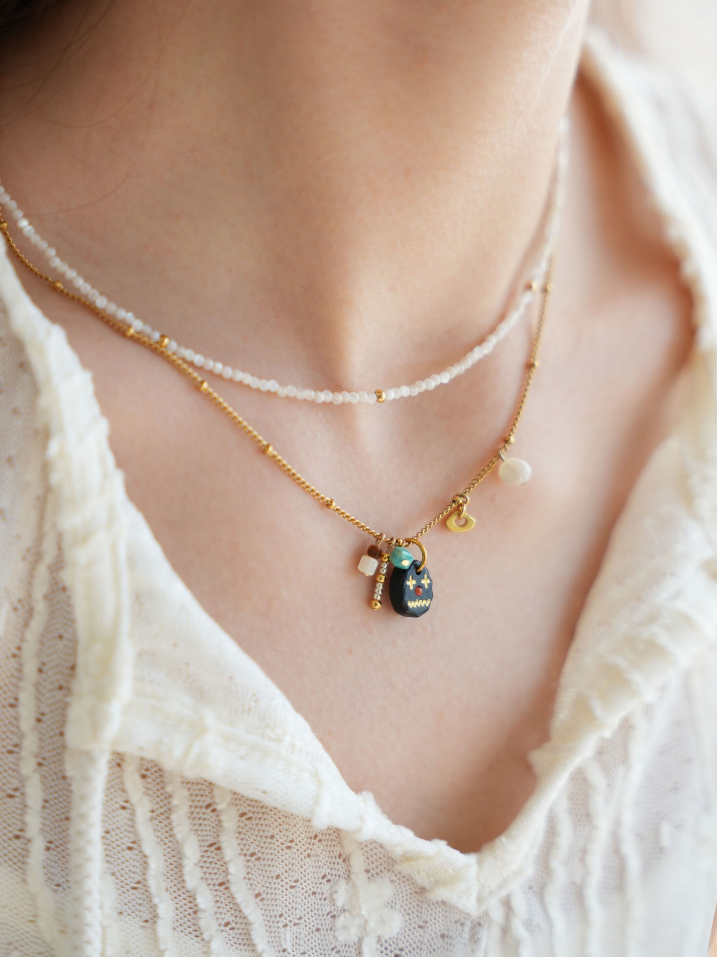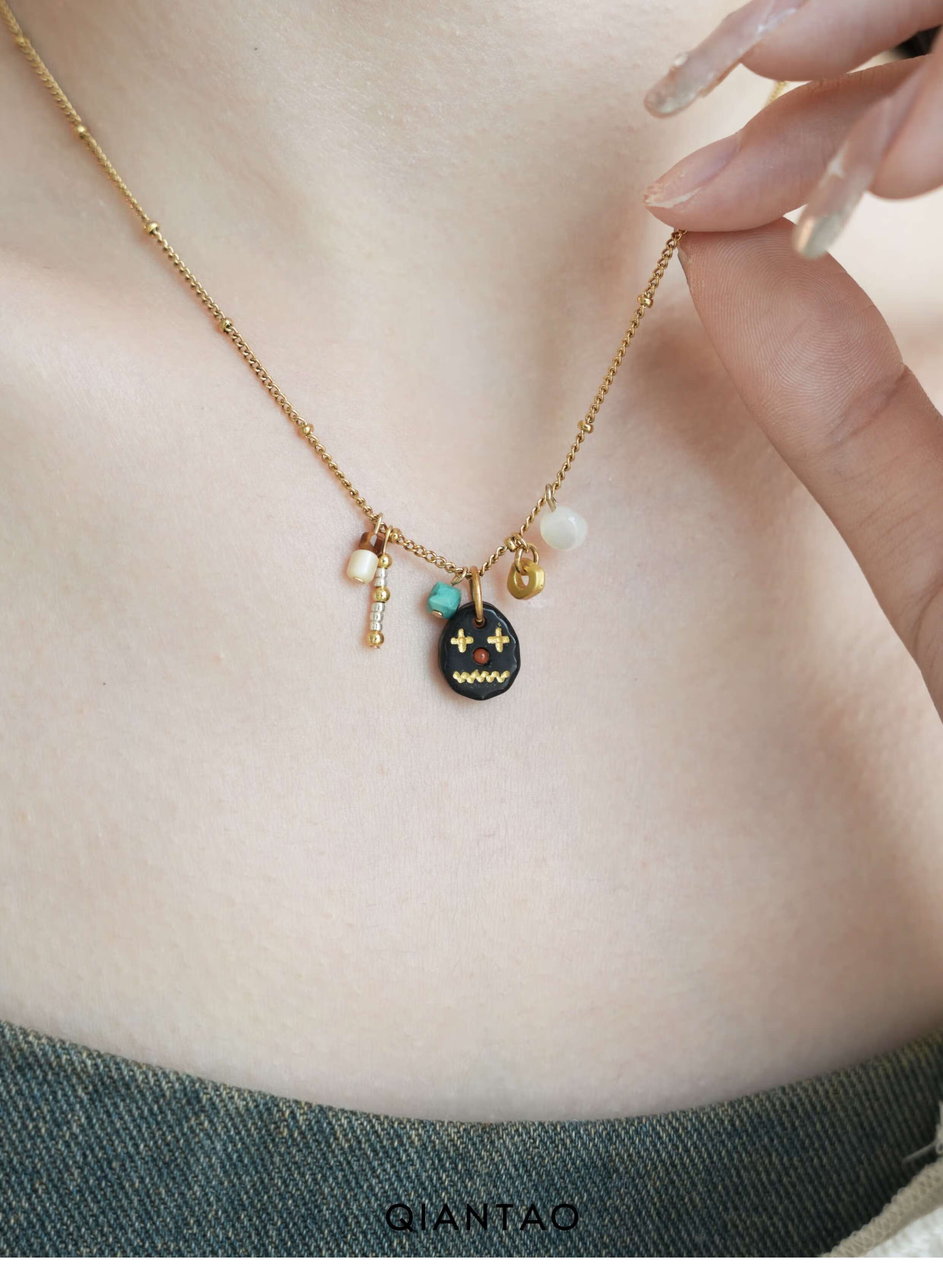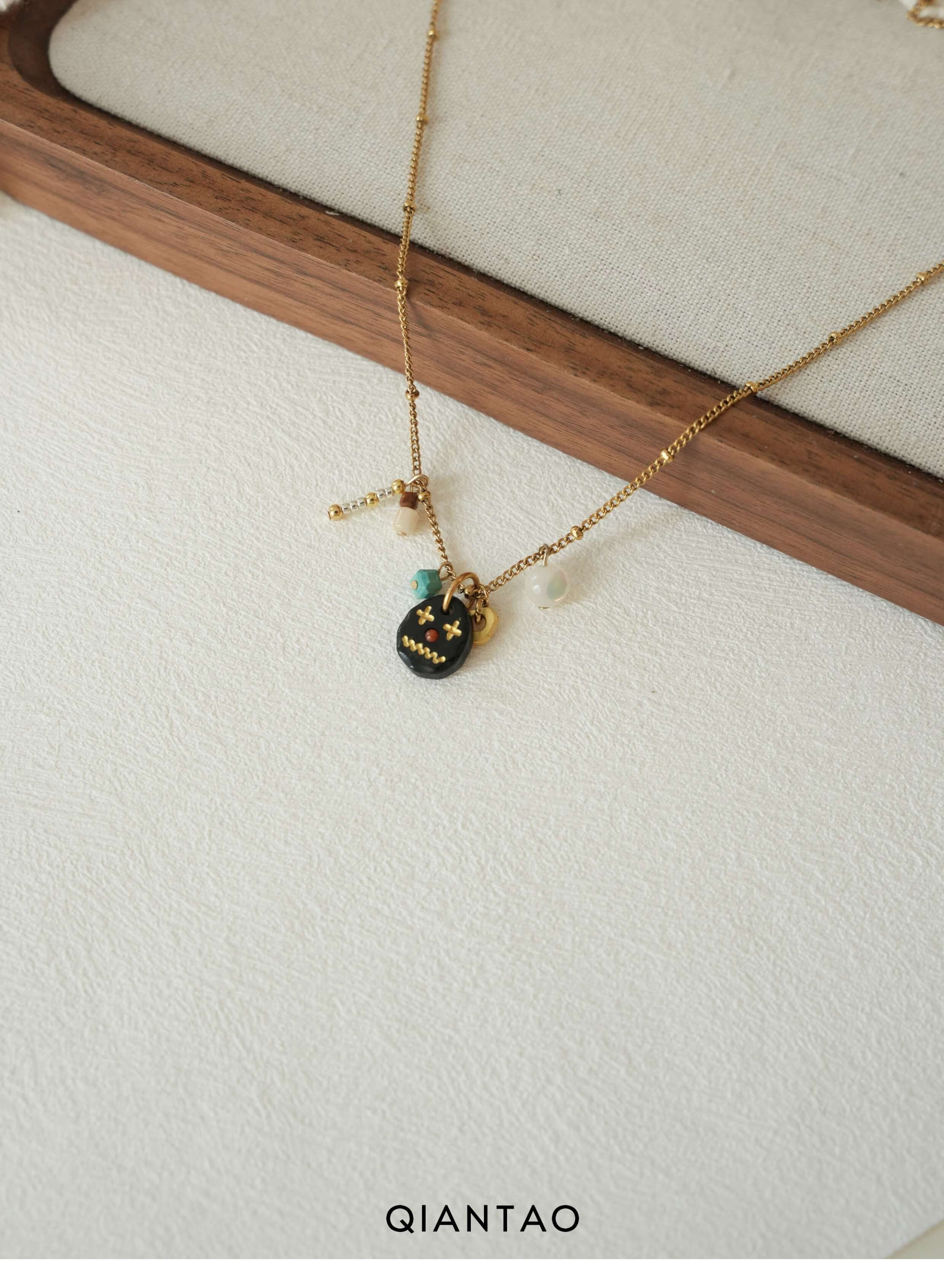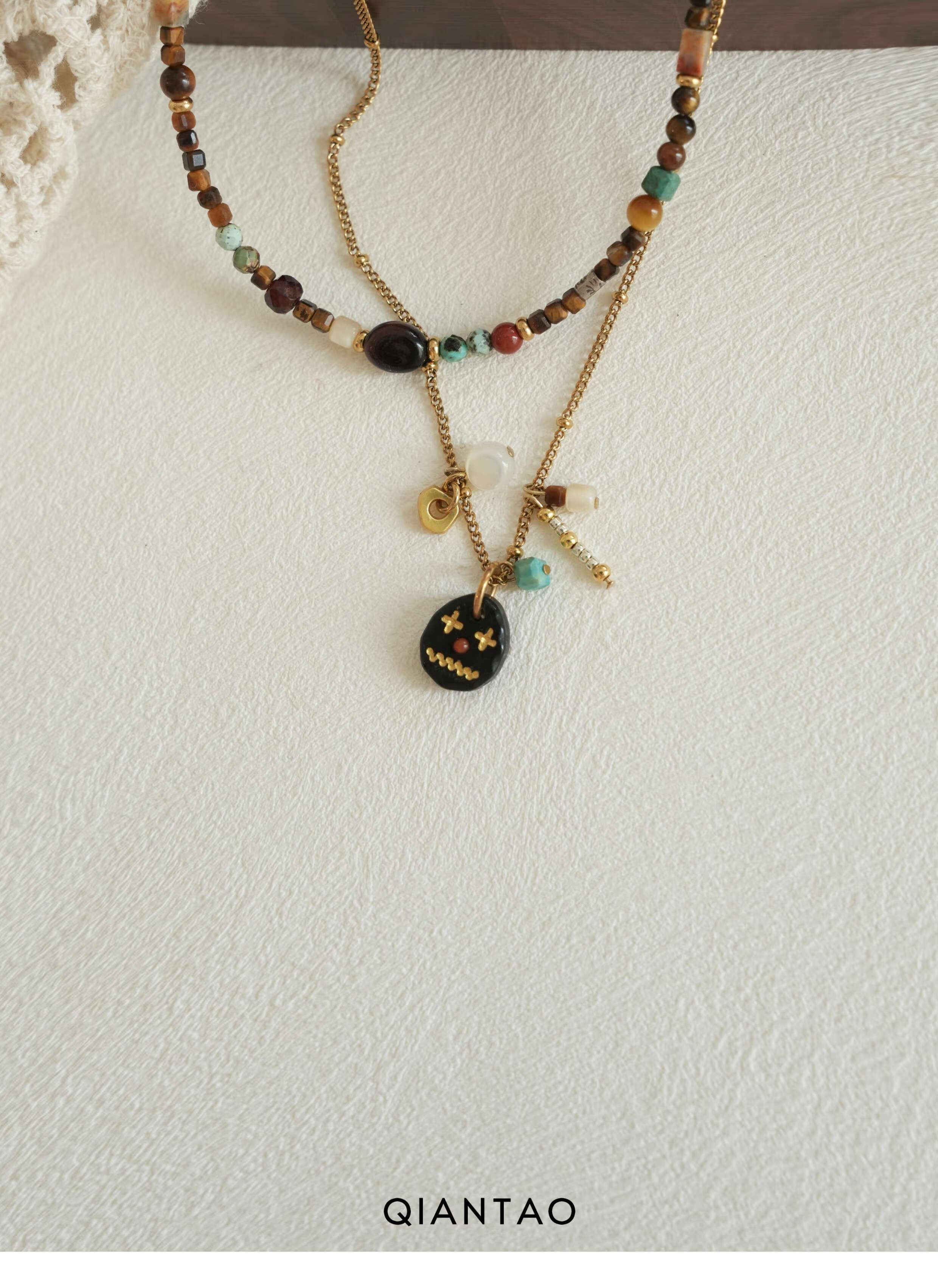 Only pair of QIANTAO Sunset Pine Original Natural Black Agate Necklace Simple Versatile Turquoise Pendant Women's Gift 45cm Imported Medical Steel Plated with 18k Gold Sunset Pine