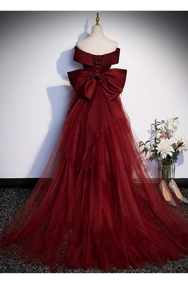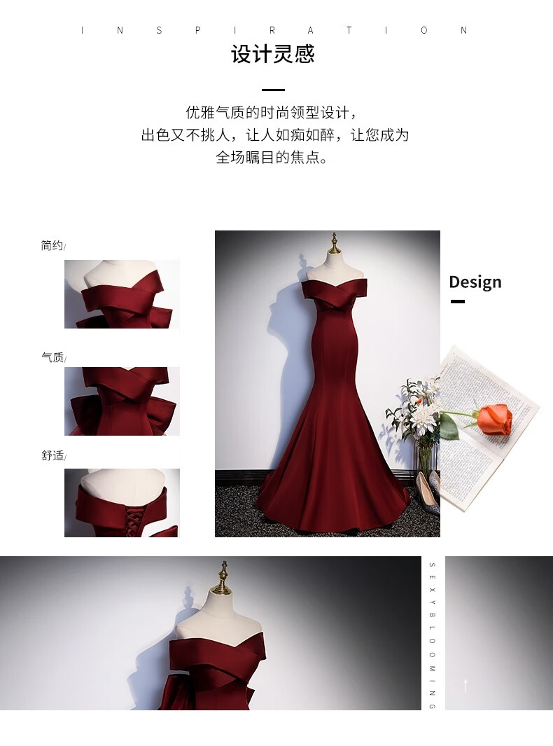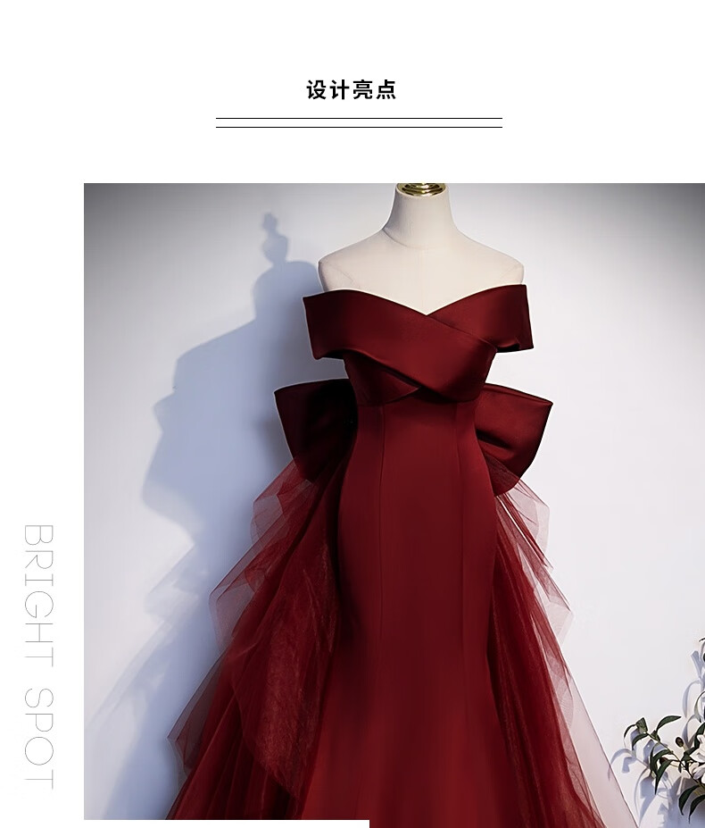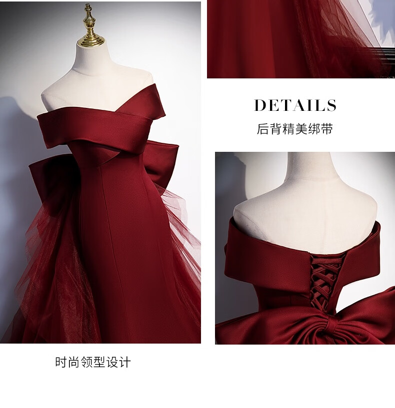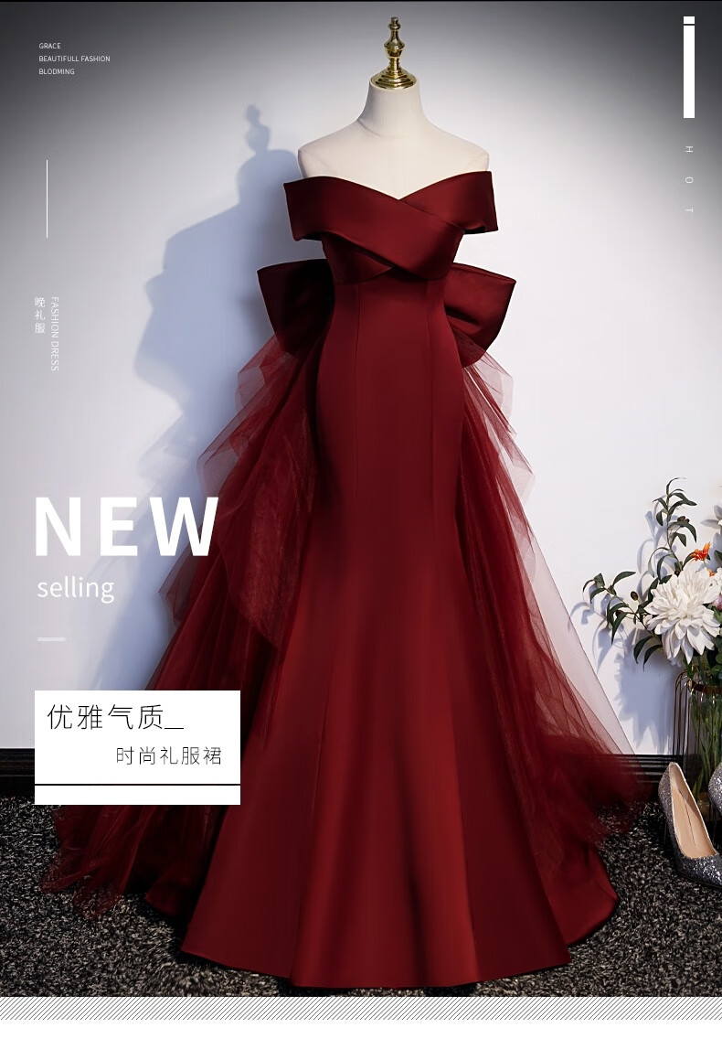 Zhenji burgundy fishtail evening dress female bel canto solo vocal art test toast annual meeting host one-shoulder light wedding dress burgundy M