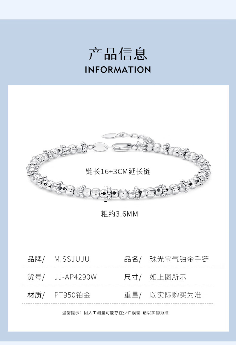 Miss JuJu pt950 platinum starlight bead bracelet for women, new platinum sparkling poppy bead bracelet, weight 8.7-8.9g, length 16+3cm+ blue silk gift box