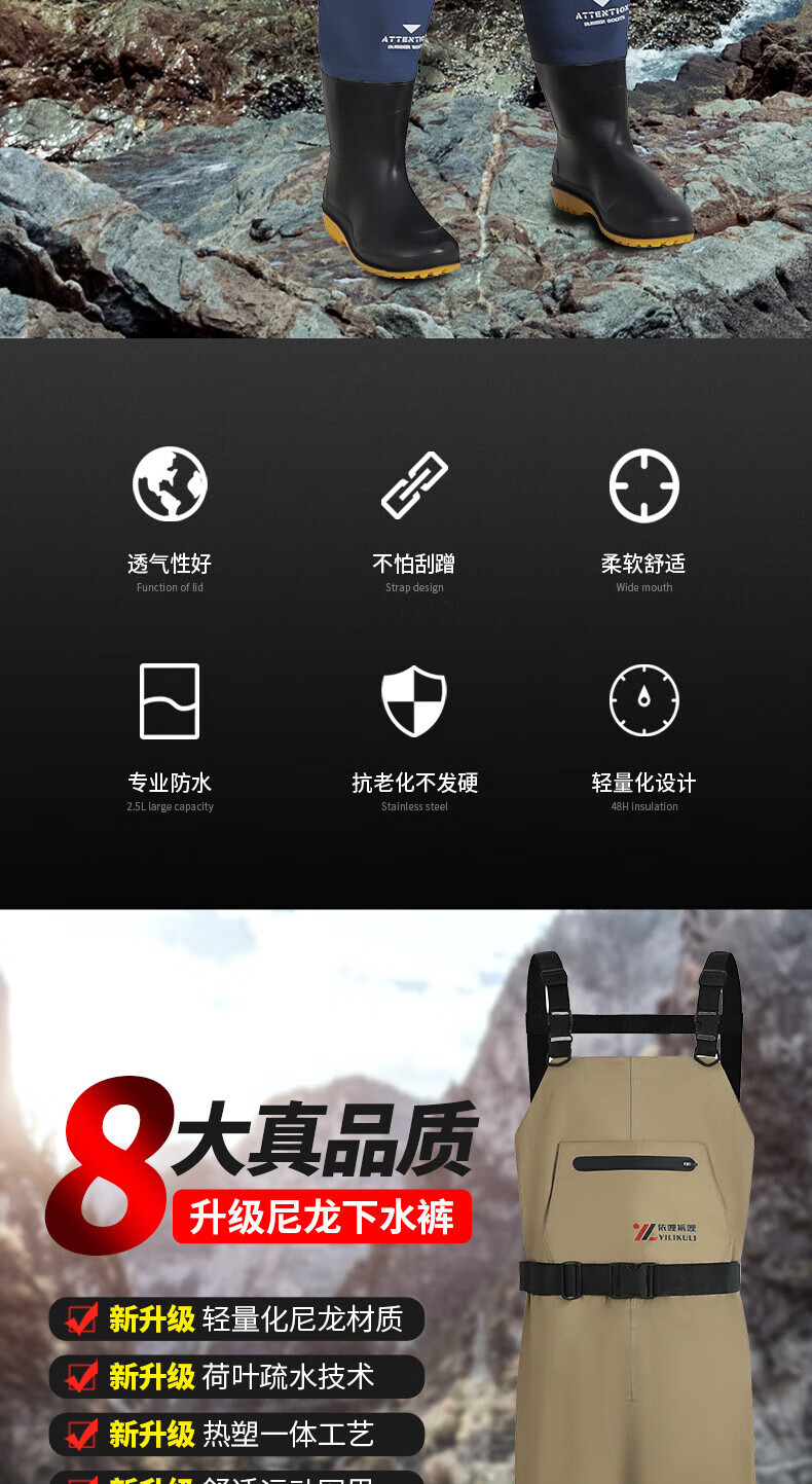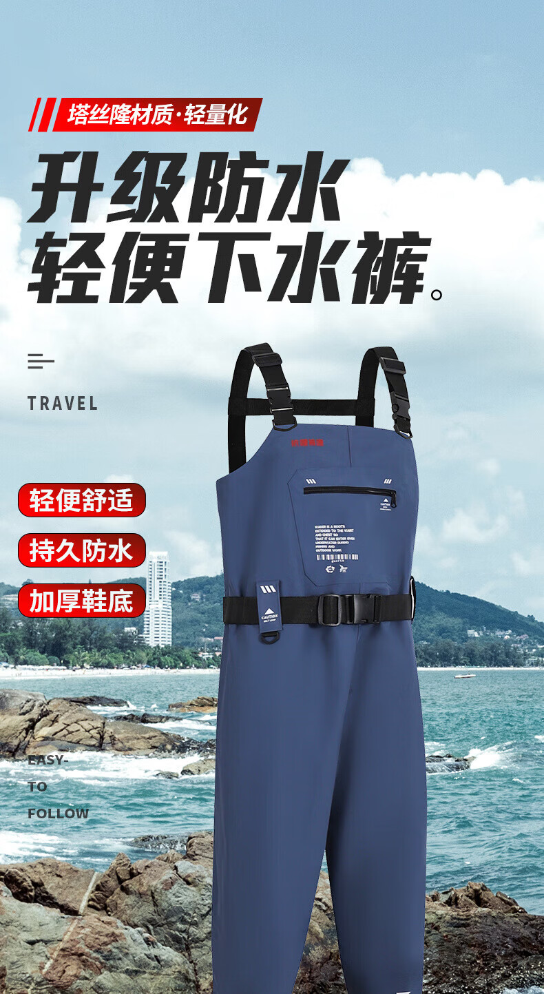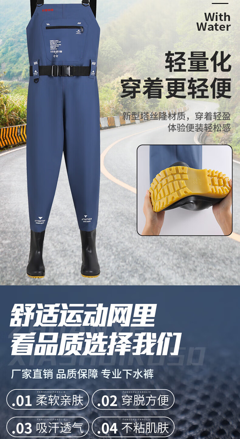 Water trousers, water shoes, half-length one-piece waterproof clothes, rain pants with rain boots, leather crotch trousers for fishing, reservoir water shoes, thickened blue Taslan upgraded model - lightweight sports net, one size fits all, 40/41 shoe size