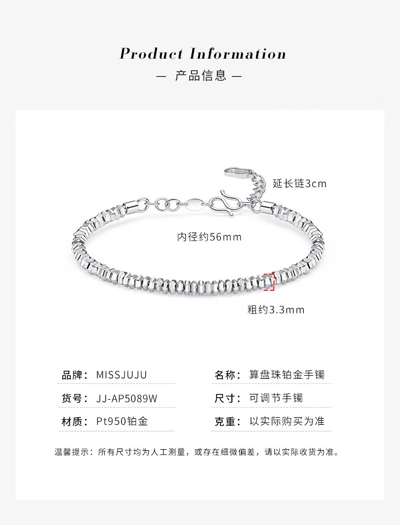 Miss JuJu pt950 platinum abacus bead bracelet for women, fashionable platinum transfer bead bracelet, adjustable, weight 12.1-12.3g