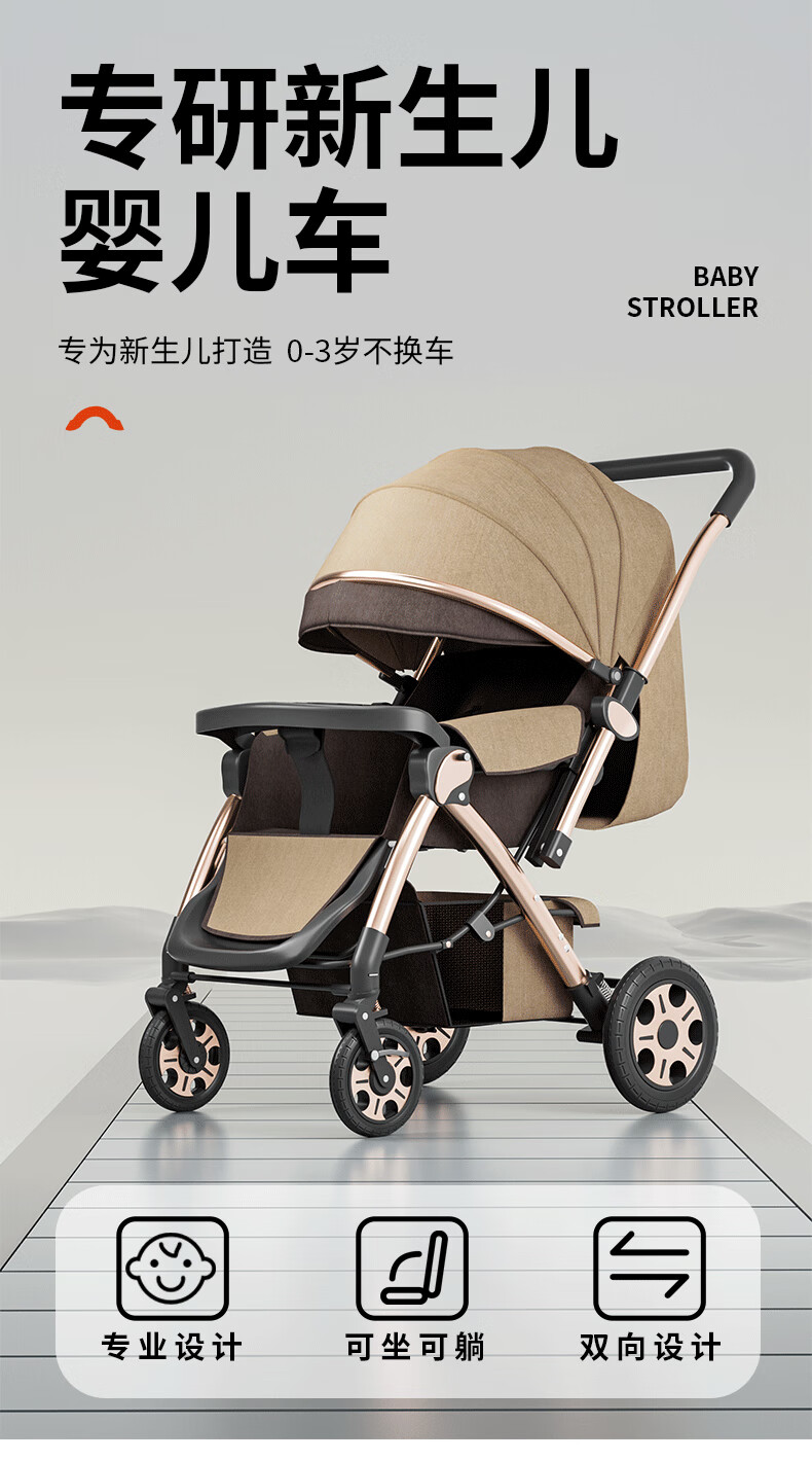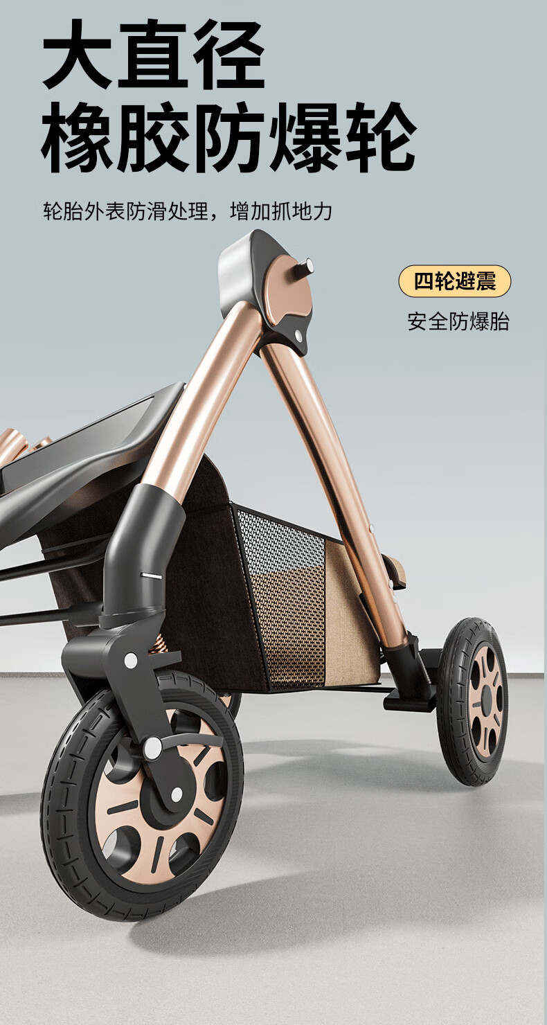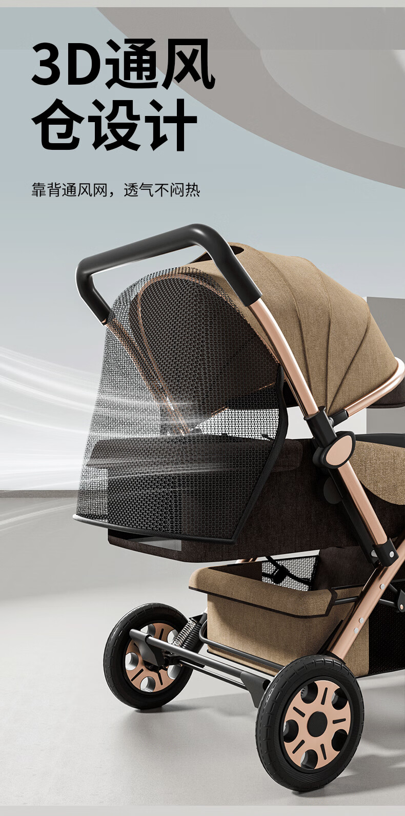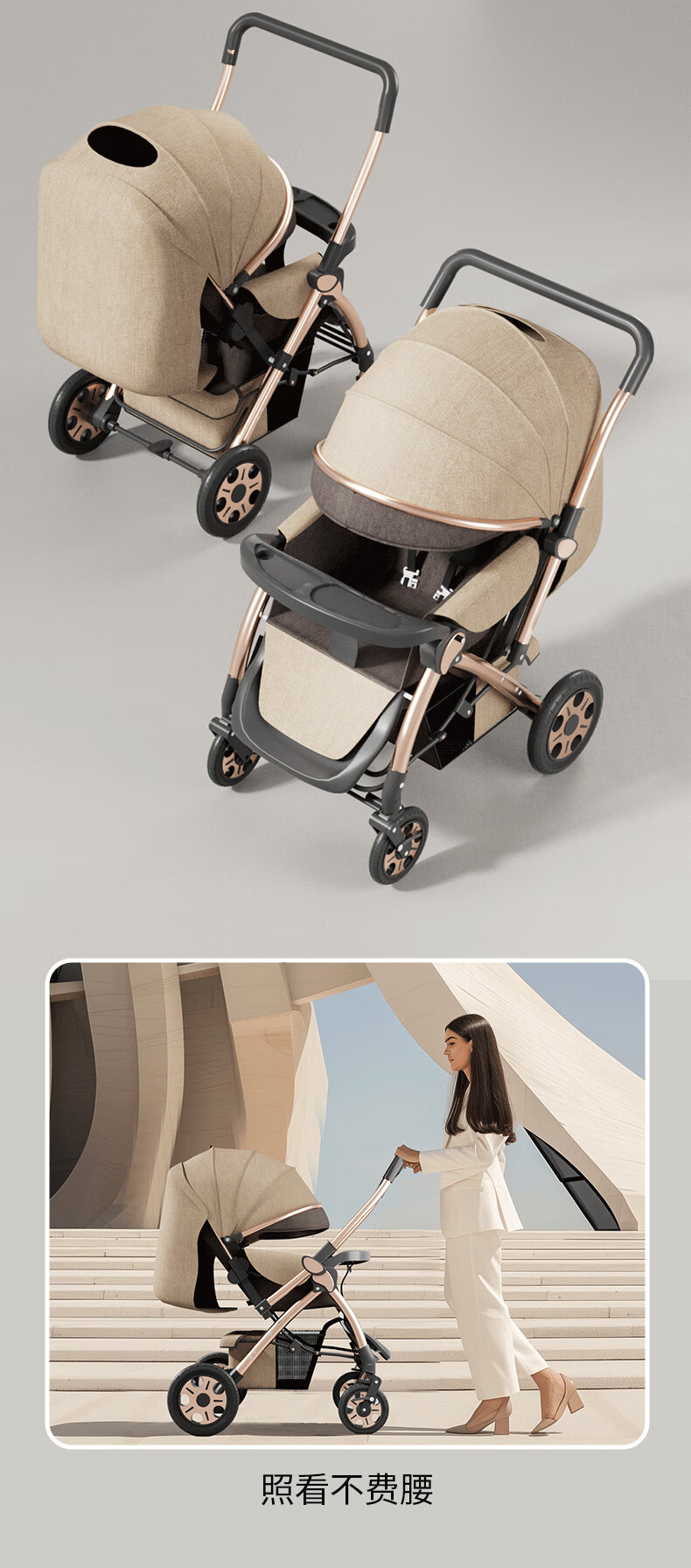 Jingyouyu German high-view two-way baby stroller bed dual-purpose multi-functional sit-down foldable baby stroller four-wheel version new khaki four-wheel rubber