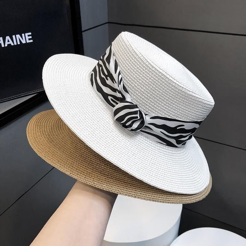 Tuzun Flat Top Hat Summer French Straw Hat Retro Zebra Sun New Hat Outdoor Vacation Sun Visor Hat 5cm brim light brown light brown black belt Recommended head circumference 56-58cm