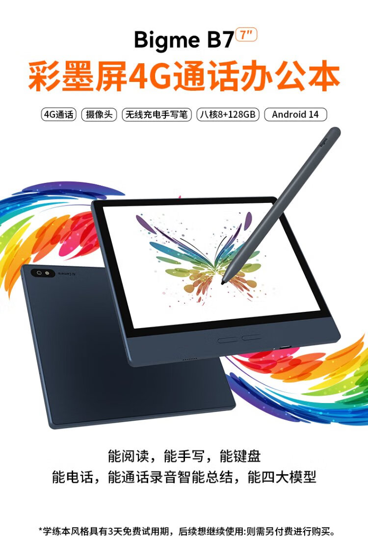 BIGME 7-inch B7 color ink screen e-book reader smart office notebook ink screen electronic paper book e-reader tablet supports 4G calls B7 color ink screen smart office notebook 8+128GB