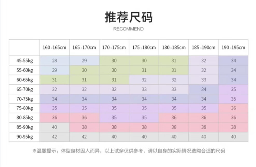 USA(inch) 28-30 30-32 32-34 34-38 38-42