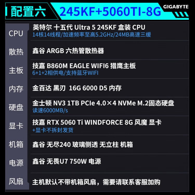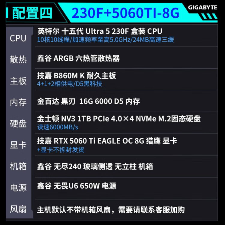 Gigabyte U5 230F/245KF+5060Ti Sea View Room DDR5 Host E-Sports DIY Black Myth Wukong Game Desktop Assembly Computer Configuration Two U5-230F+5060