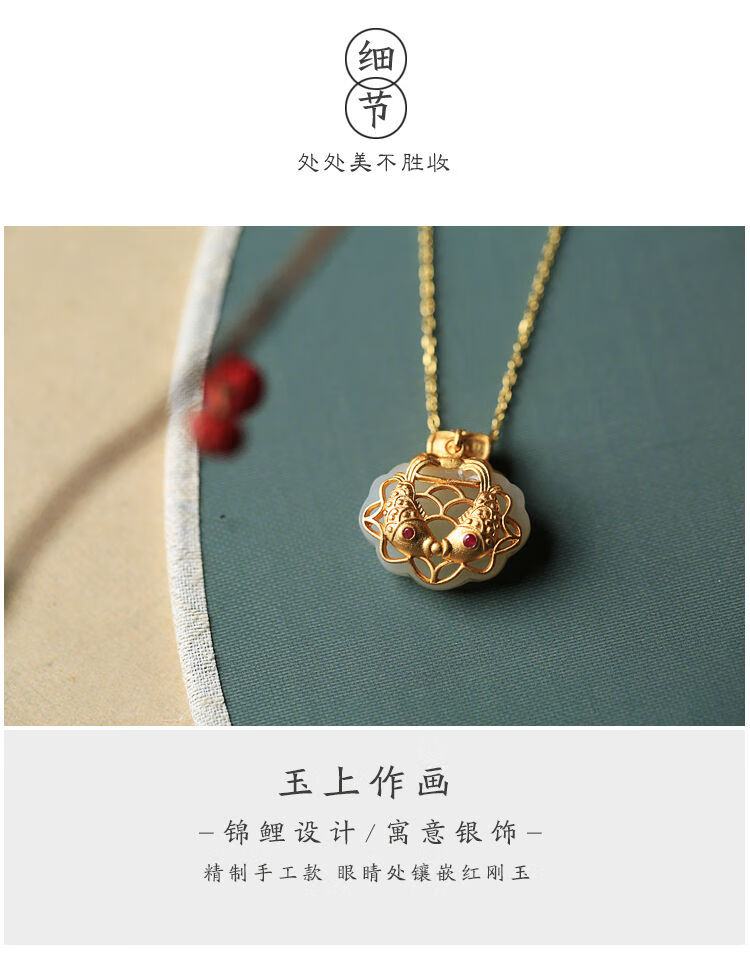 Micro-gifted jade koi sterling silver Hetian jade peace lock gold inlaid jade pendant female jade necklace Mother's Day gift for mom single pendant