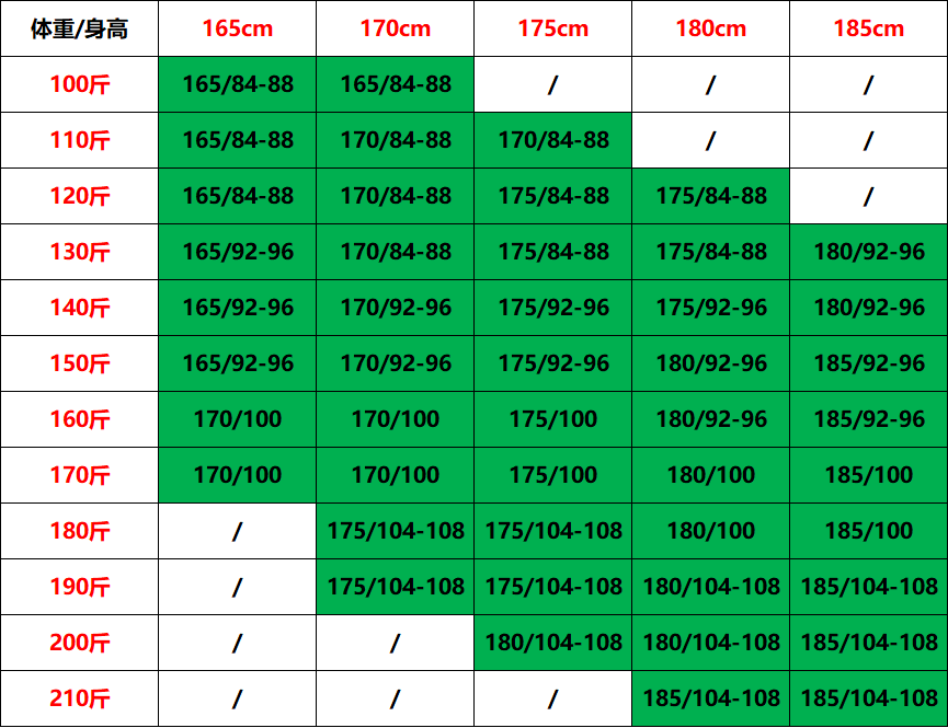 China (cm) 160-165/84-86 165-170 / 88-90 167-172 / 92-96 168-173 / 98-102 170-176 / 106-110