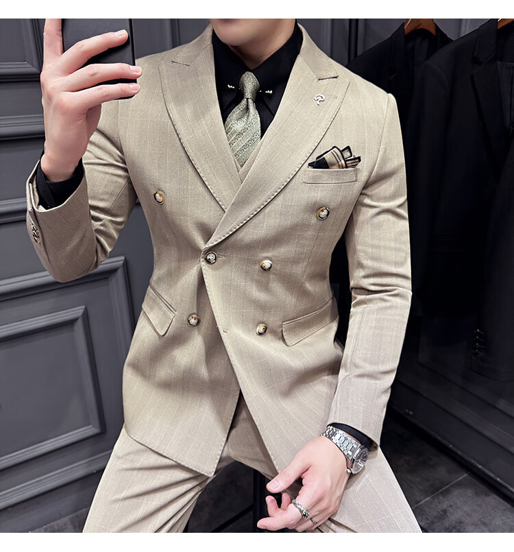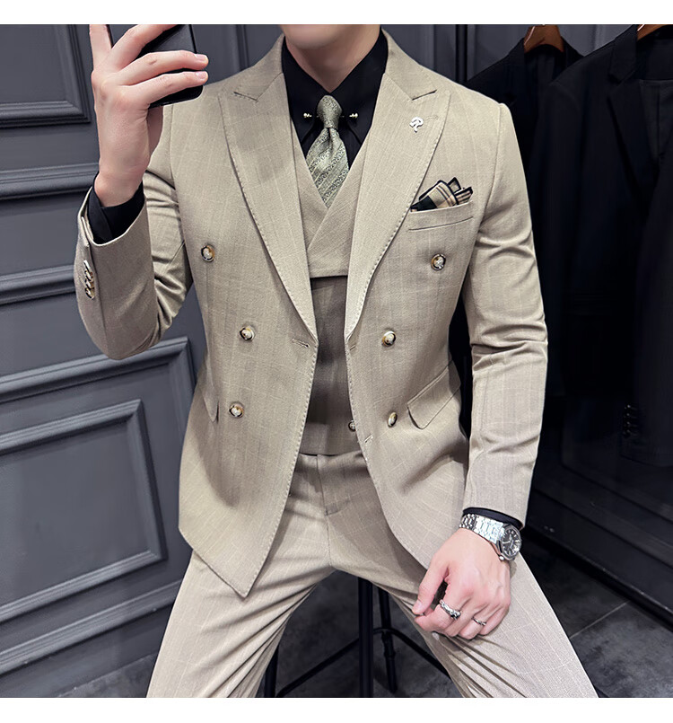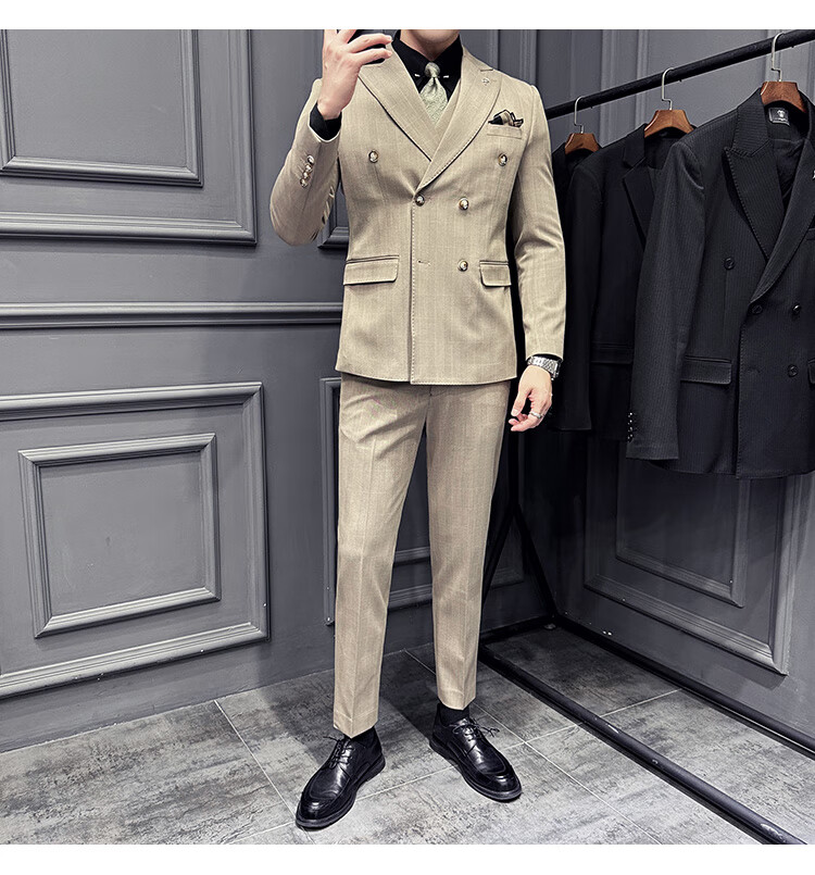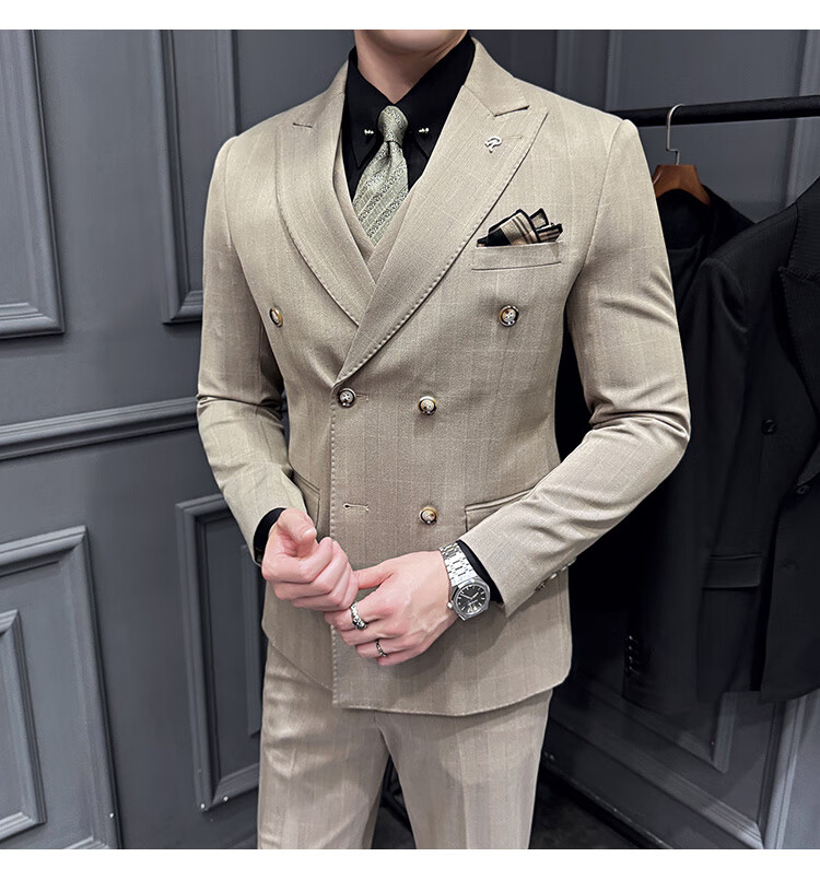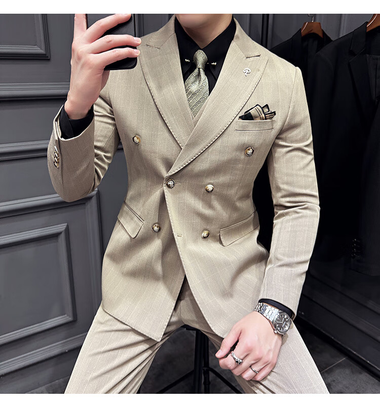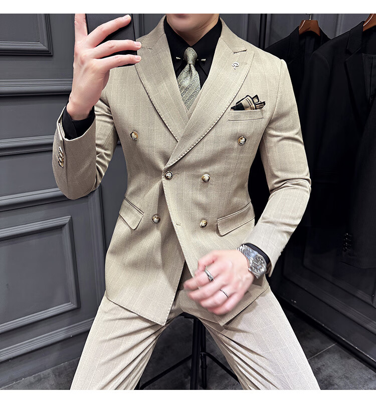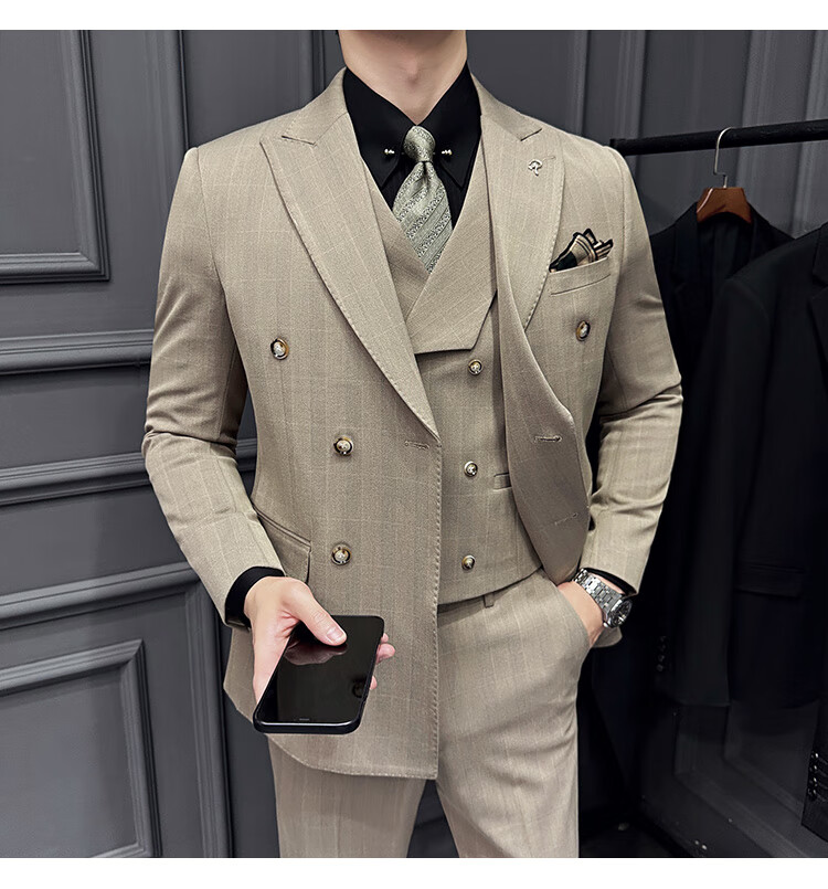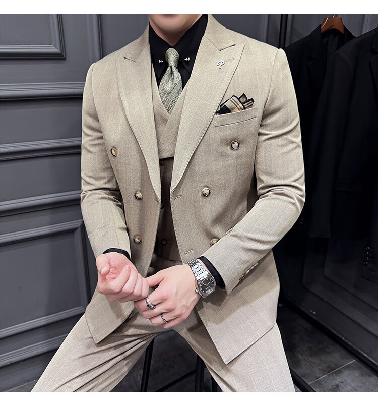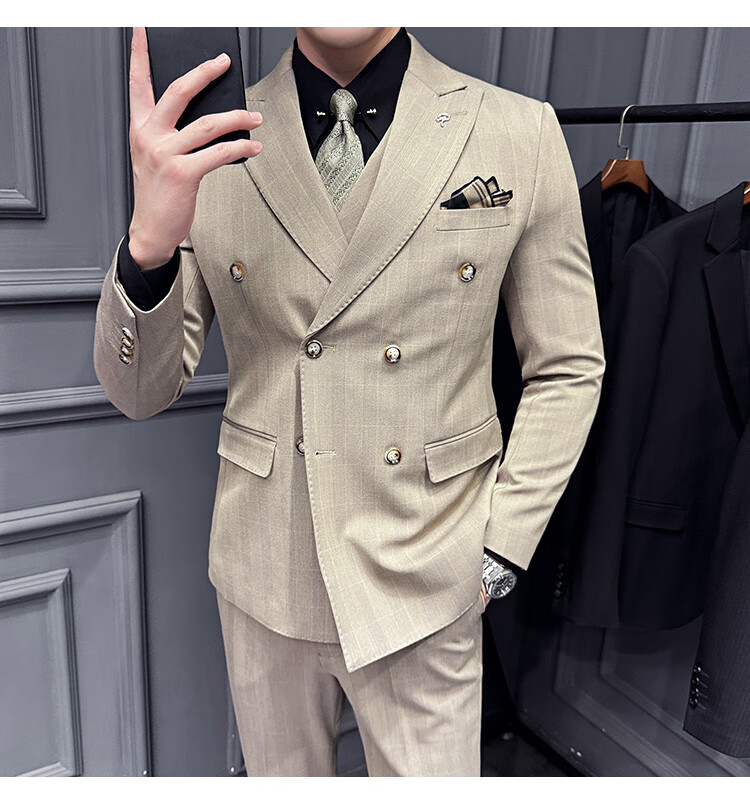 Jason's double-breasted plaid suit men's suit high-quality formal dress business casual groom's wedding suit three-piece khaki (suit + shirt + pants) 2XL