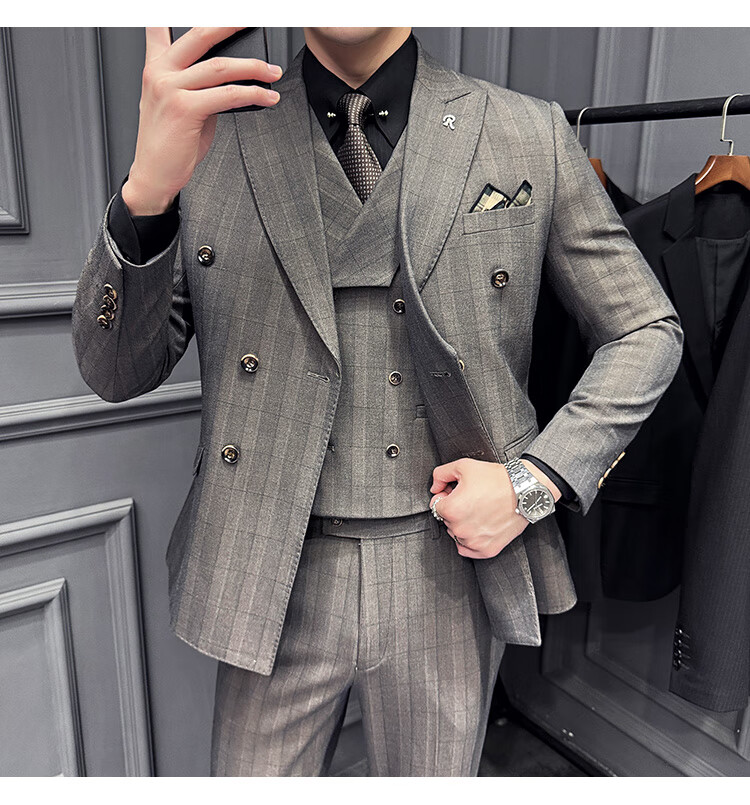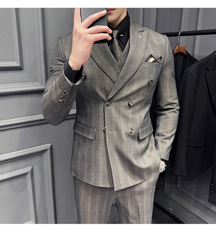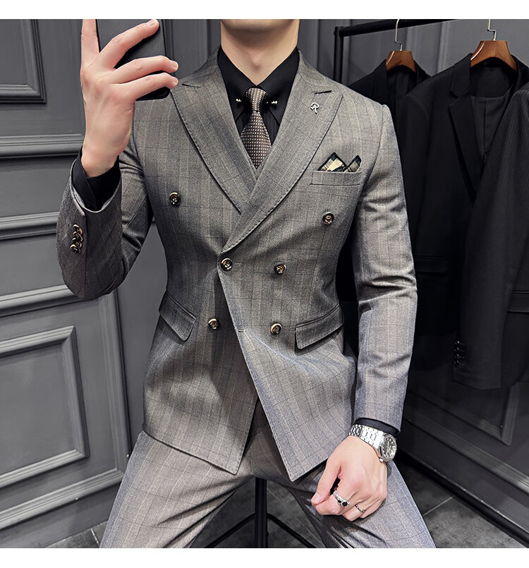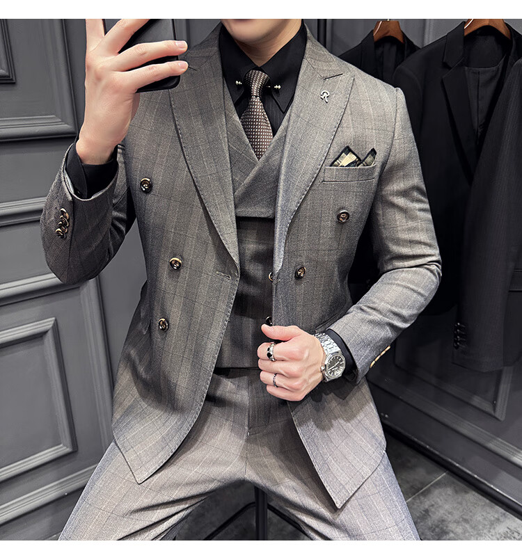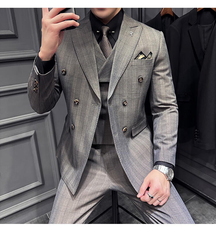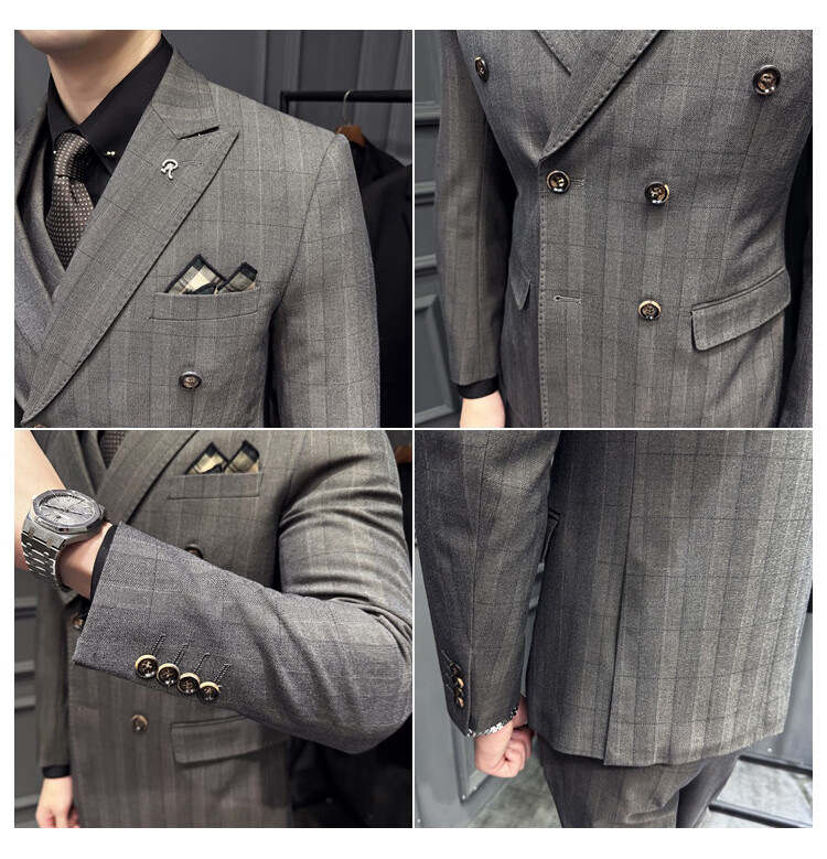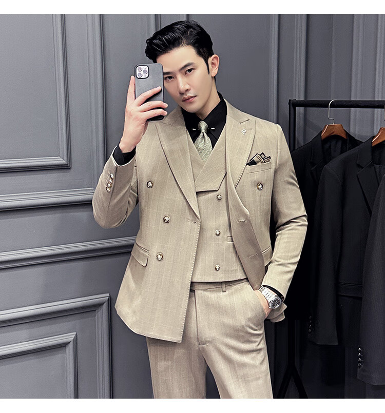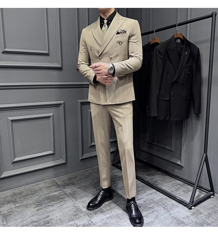 Jason's double-breasted plaid suit men's suit high-quality formal dress business casual groom's wedding suit three-piece khaki (suit + shirt + pants) 2XL