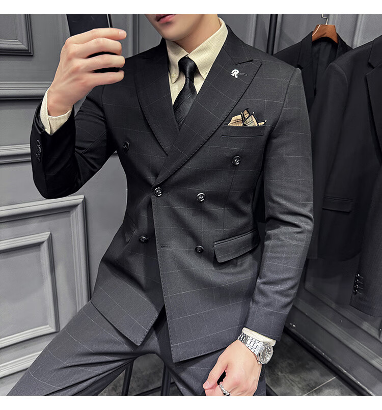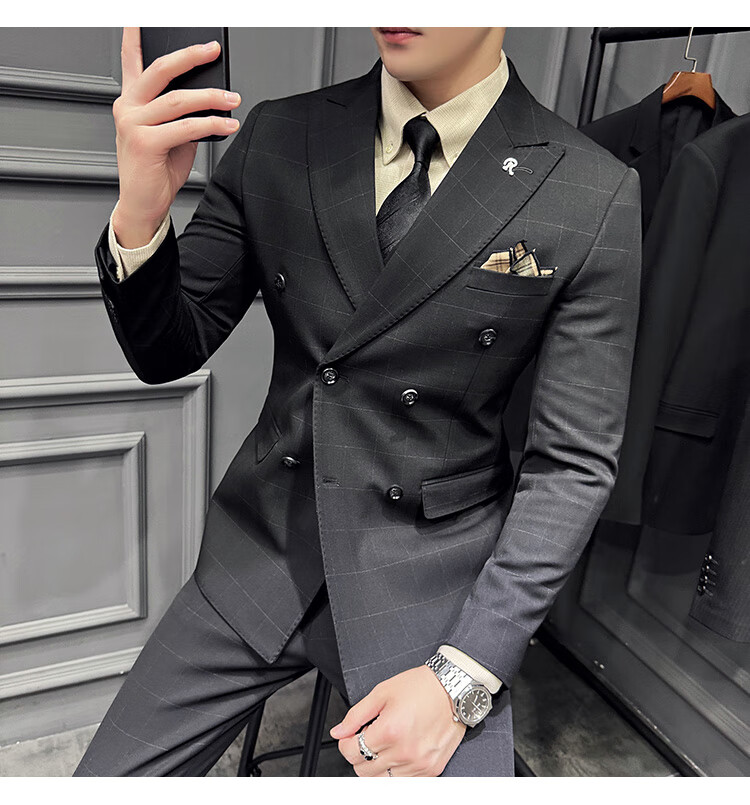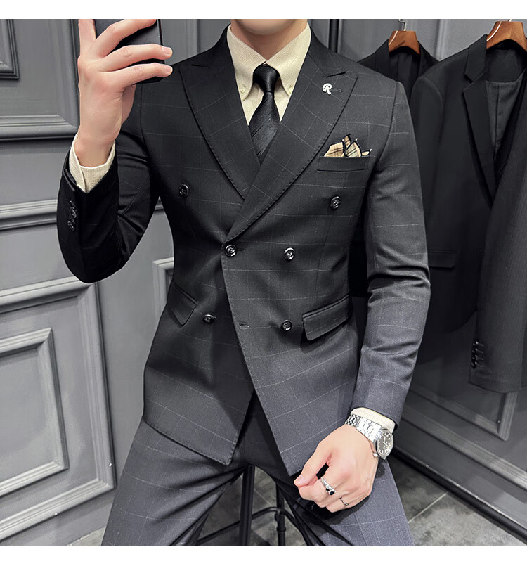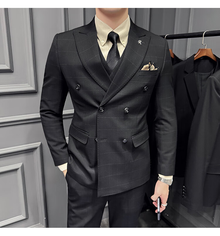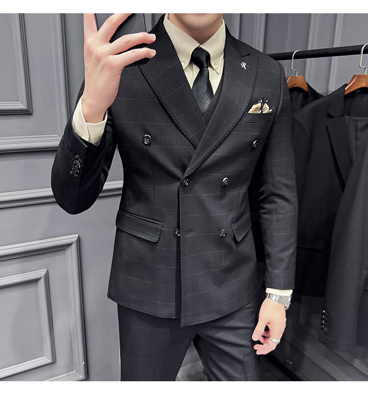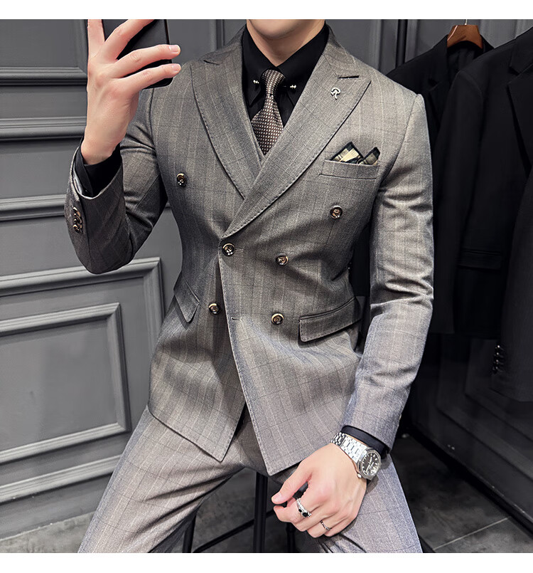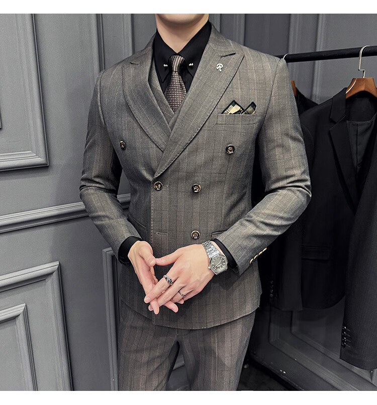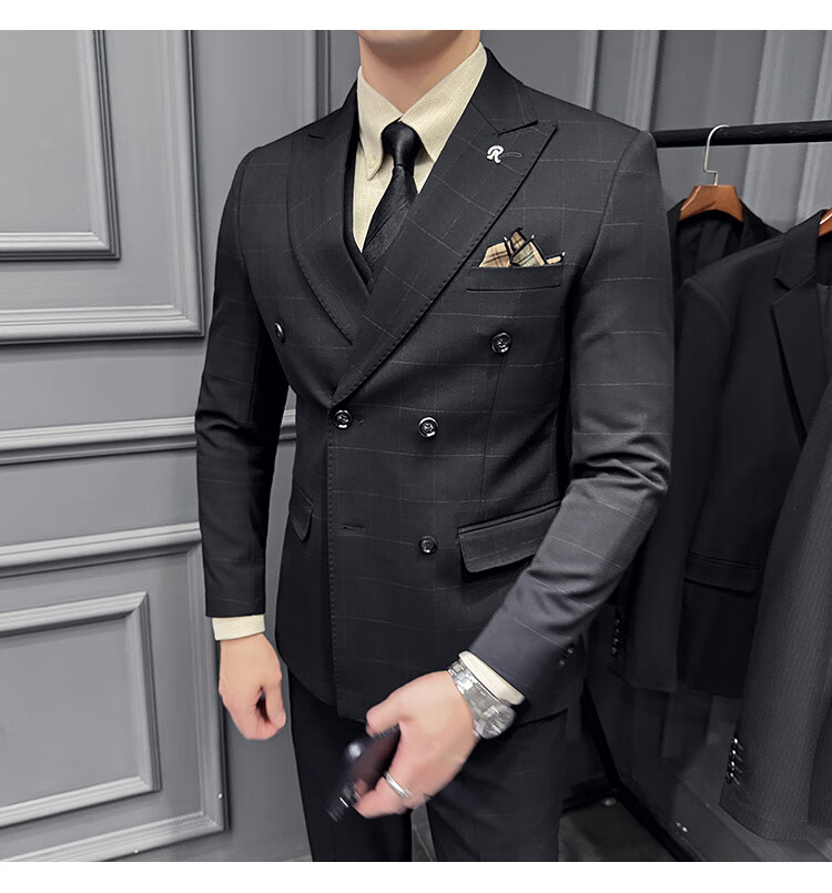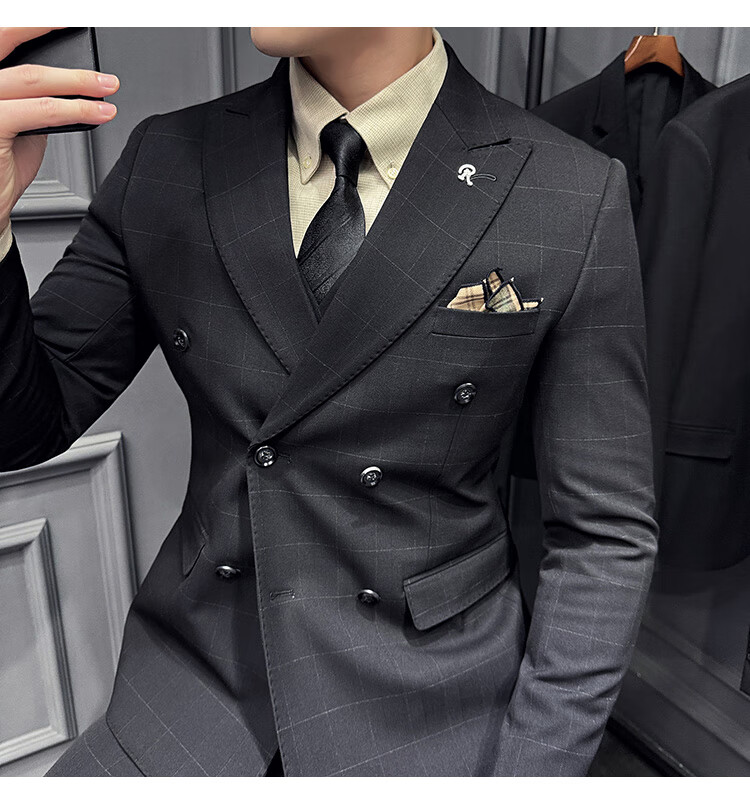 Jason's double-breasted plaid suit men's suit high-quality formal dress business casual groom's wedding suit three-piece khaki (suit + shirt + pants) 2XL