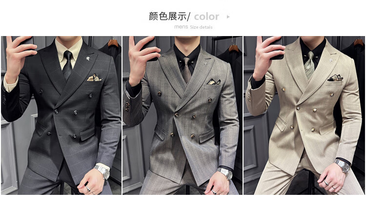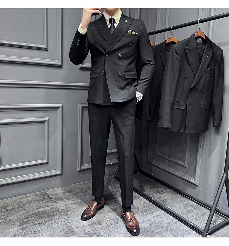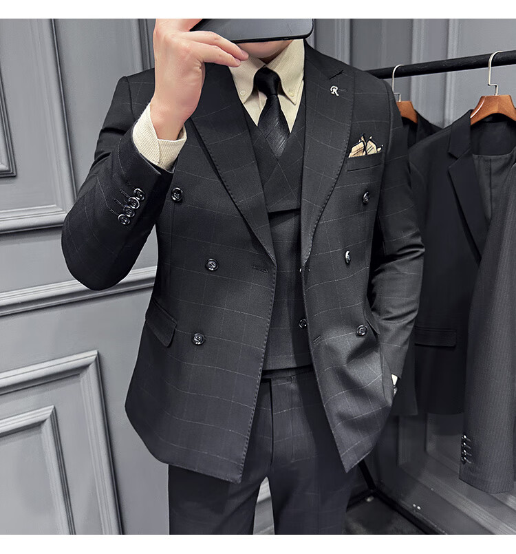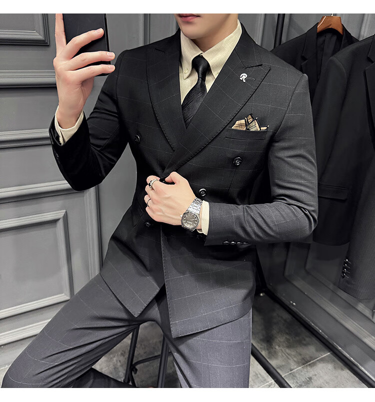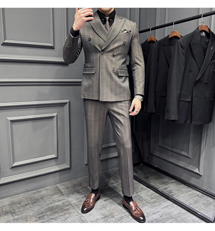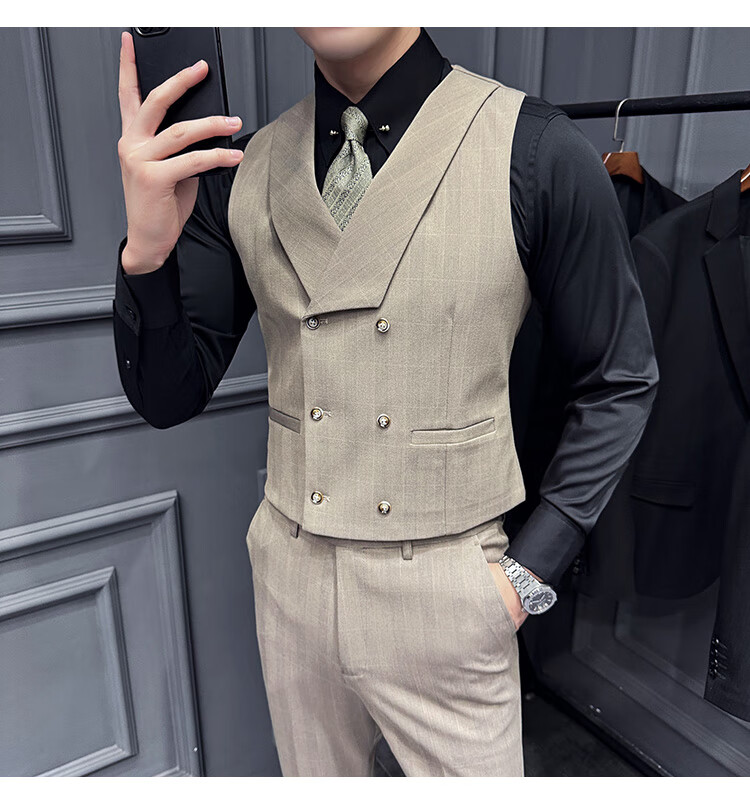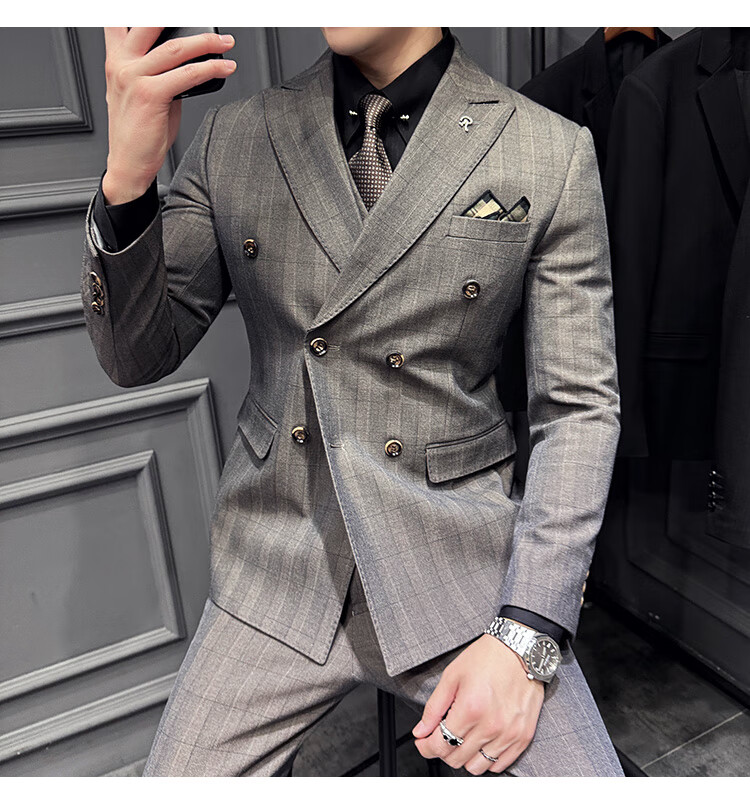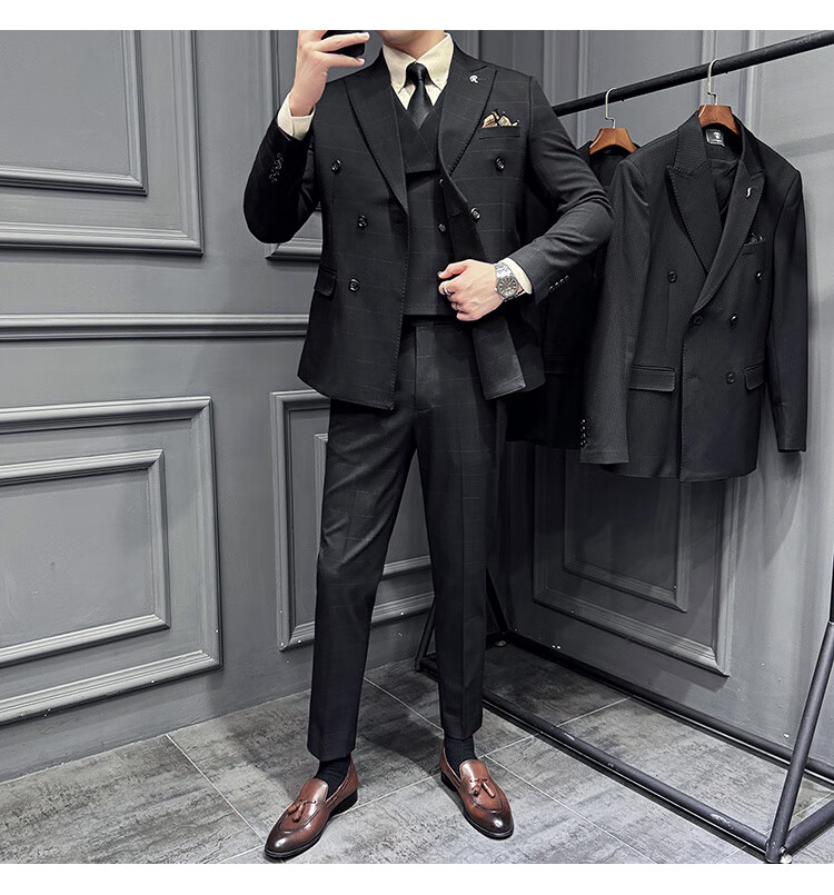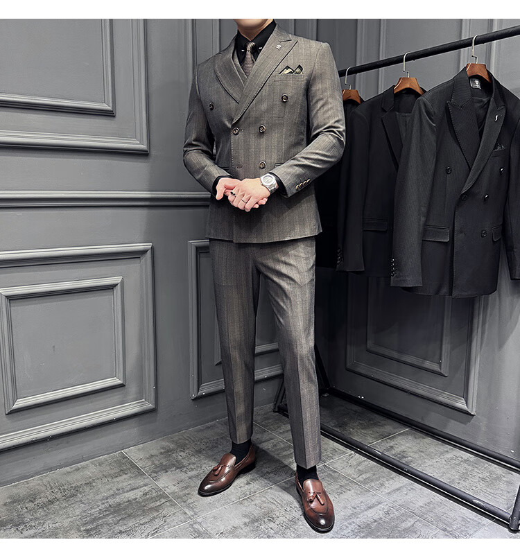 Jason's double-breasted plaid suit men's suit high-quality formal dress business casual groom's wedding suit three-piece khaki (suit + shirt + pants) 2XL