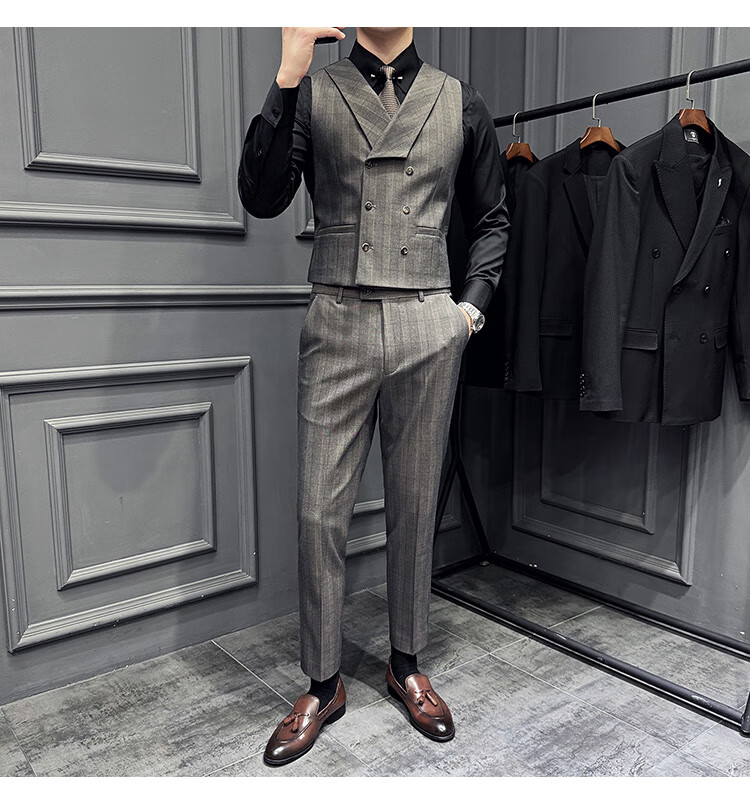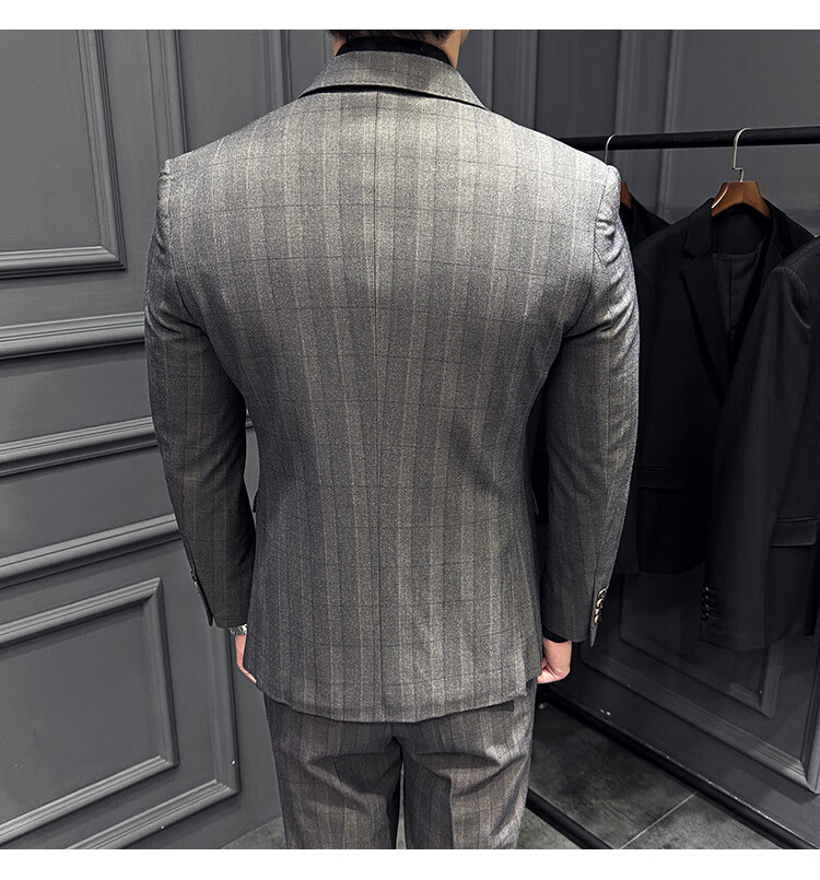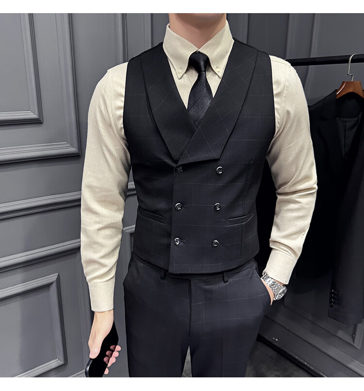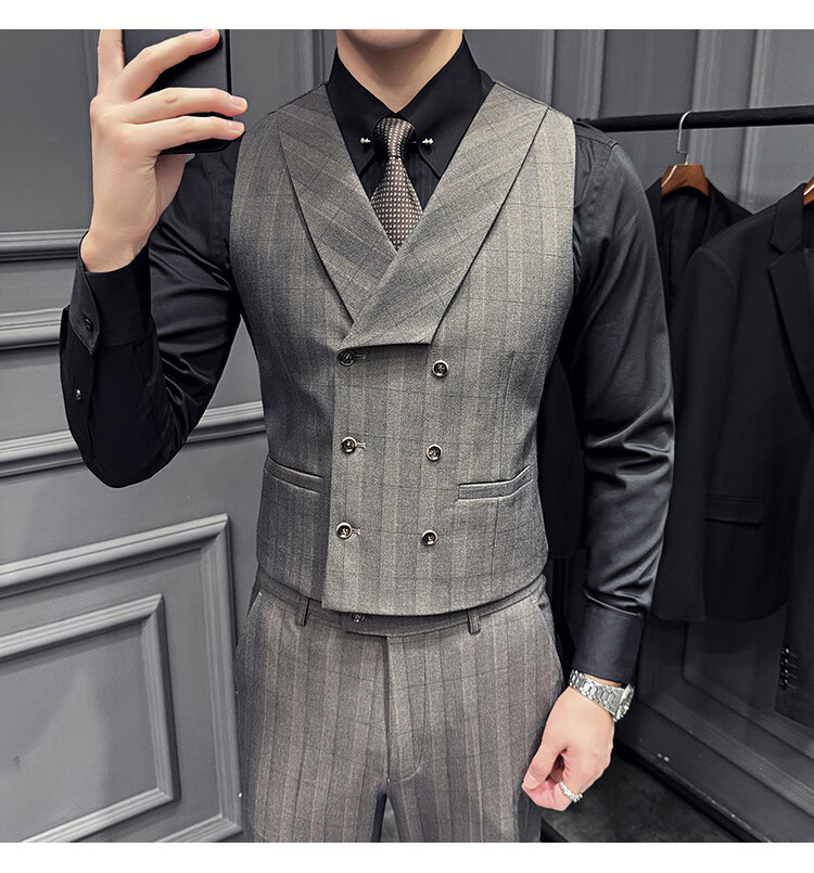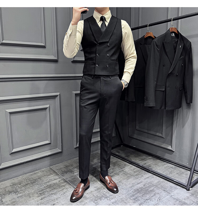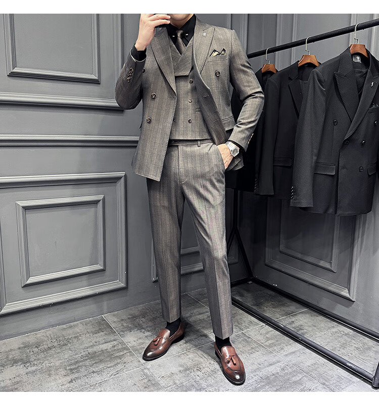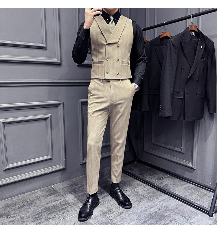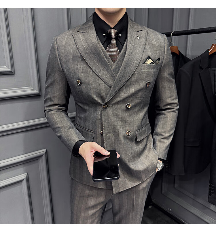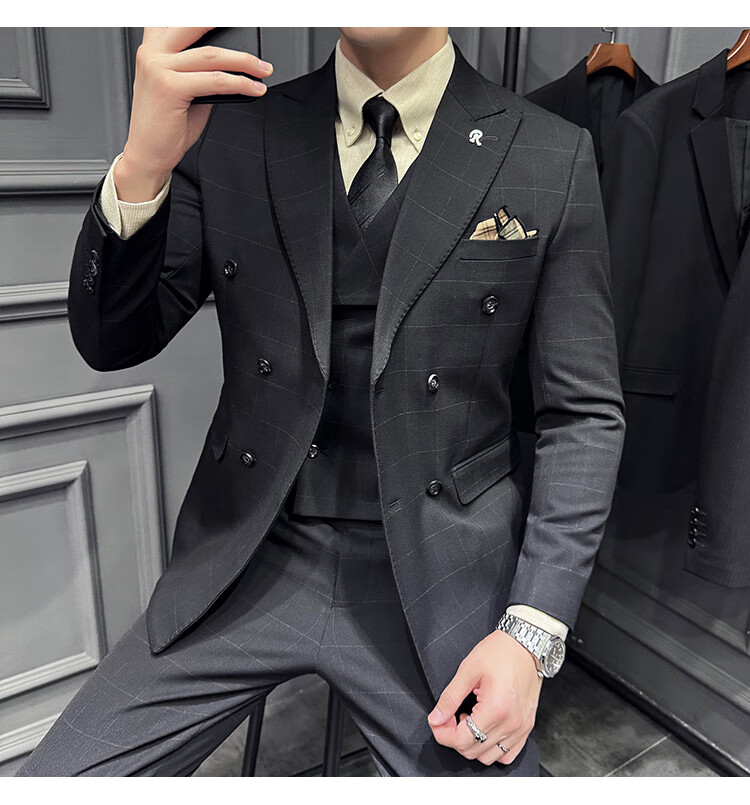Jason's double-breasted plaid suit men's suit high-quality formal dress business casual groom's wedding suit three-piece khaki (suit + shirt + pants) 2XL