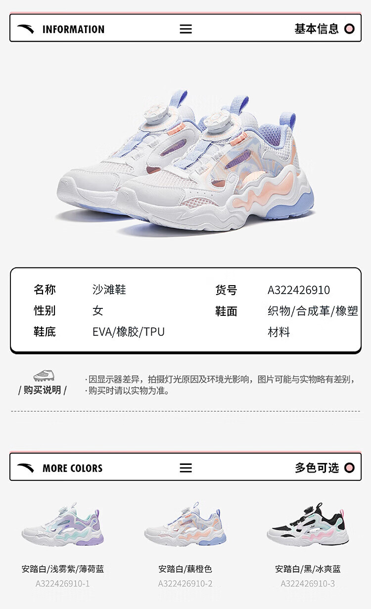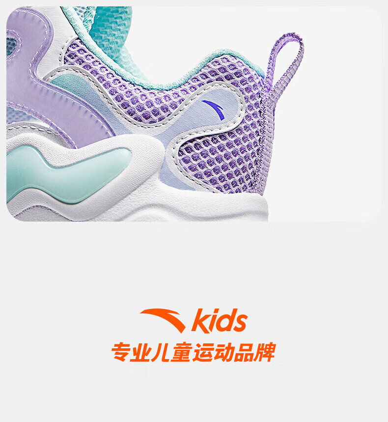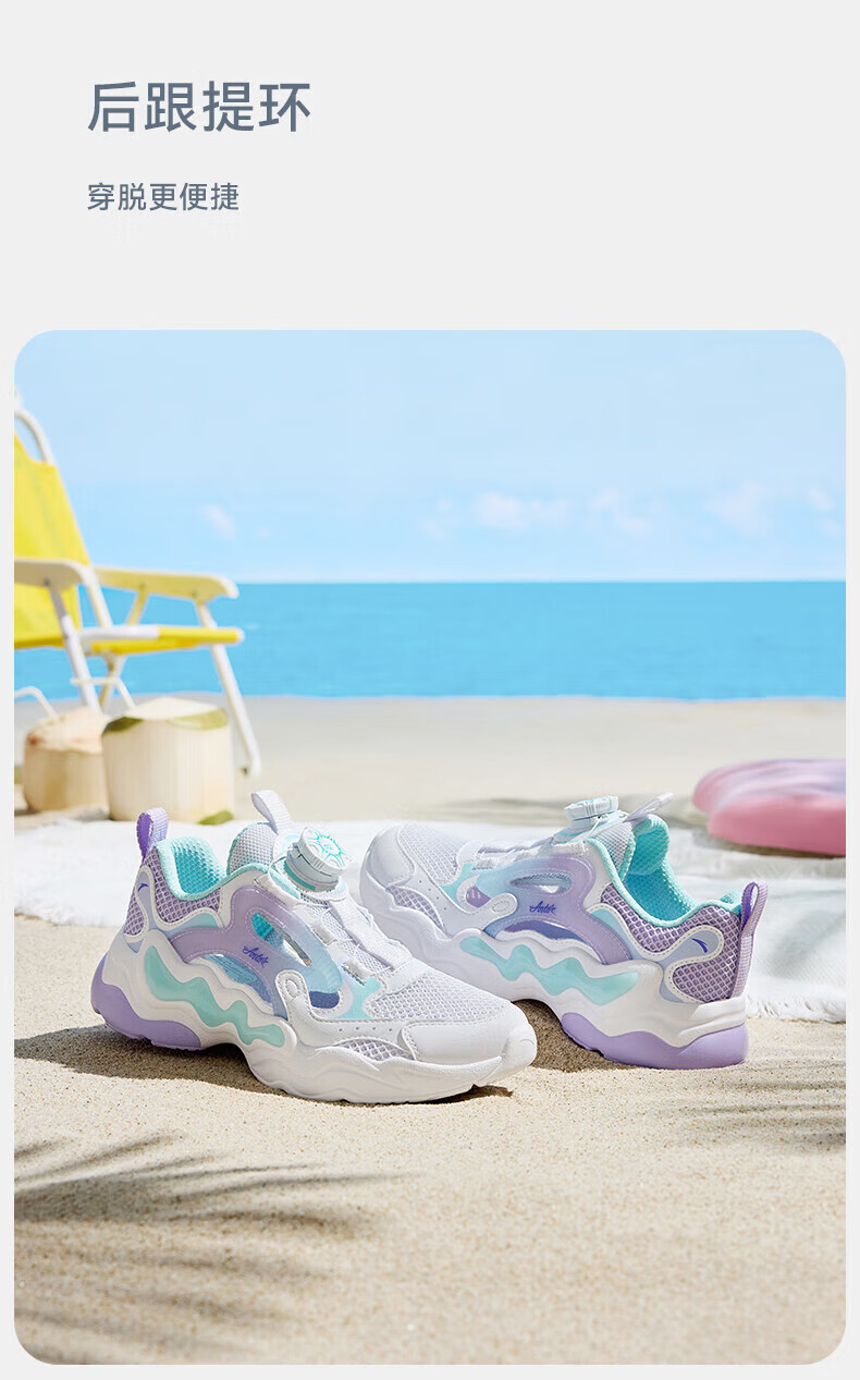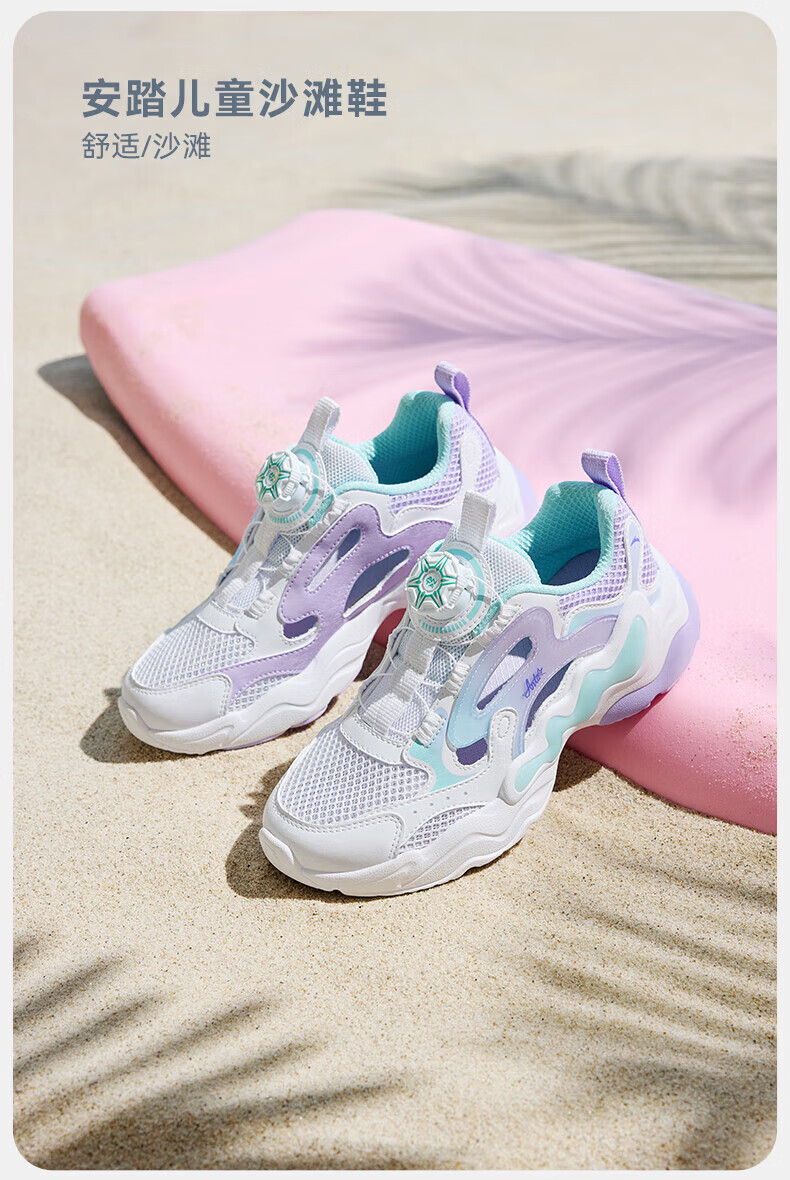 ANTA Children's Sandals, Girls' Shoes, 2025 Summer New Knob Buckle Breathable Frame Shoes, Baotou Beach Shoes Anta White/Light Mist Purple/Mint Blue-1 37