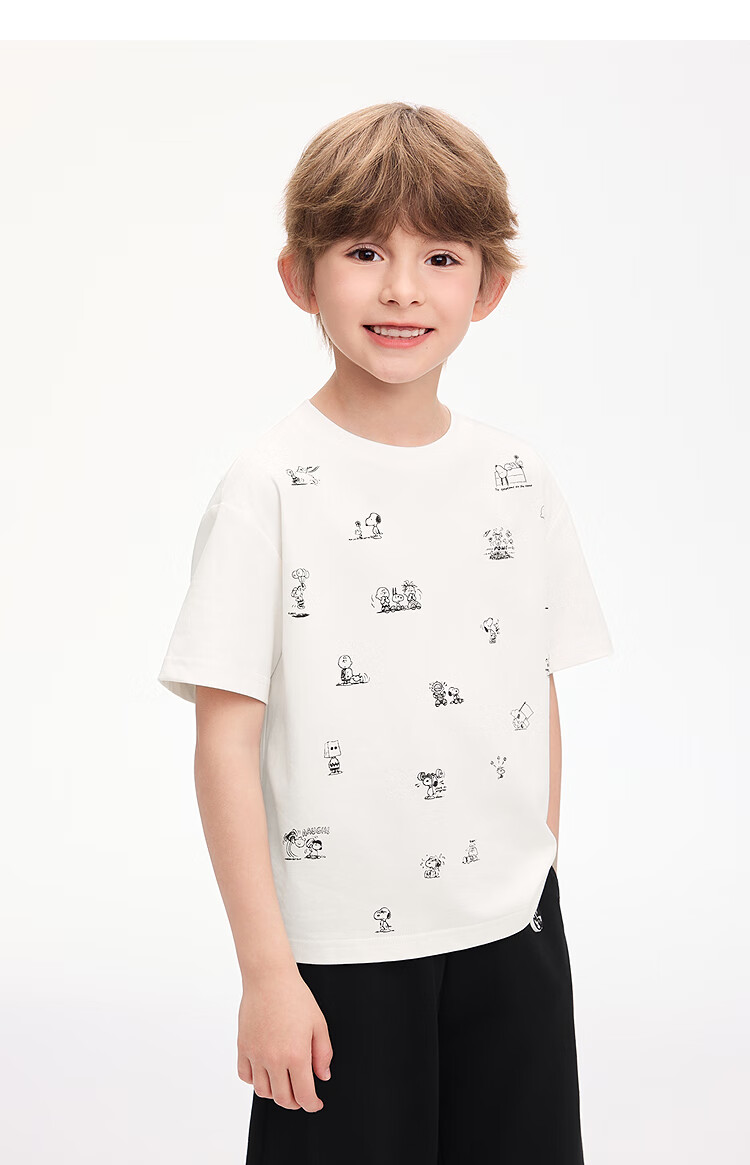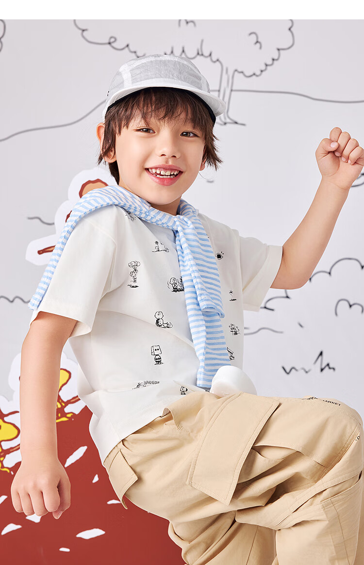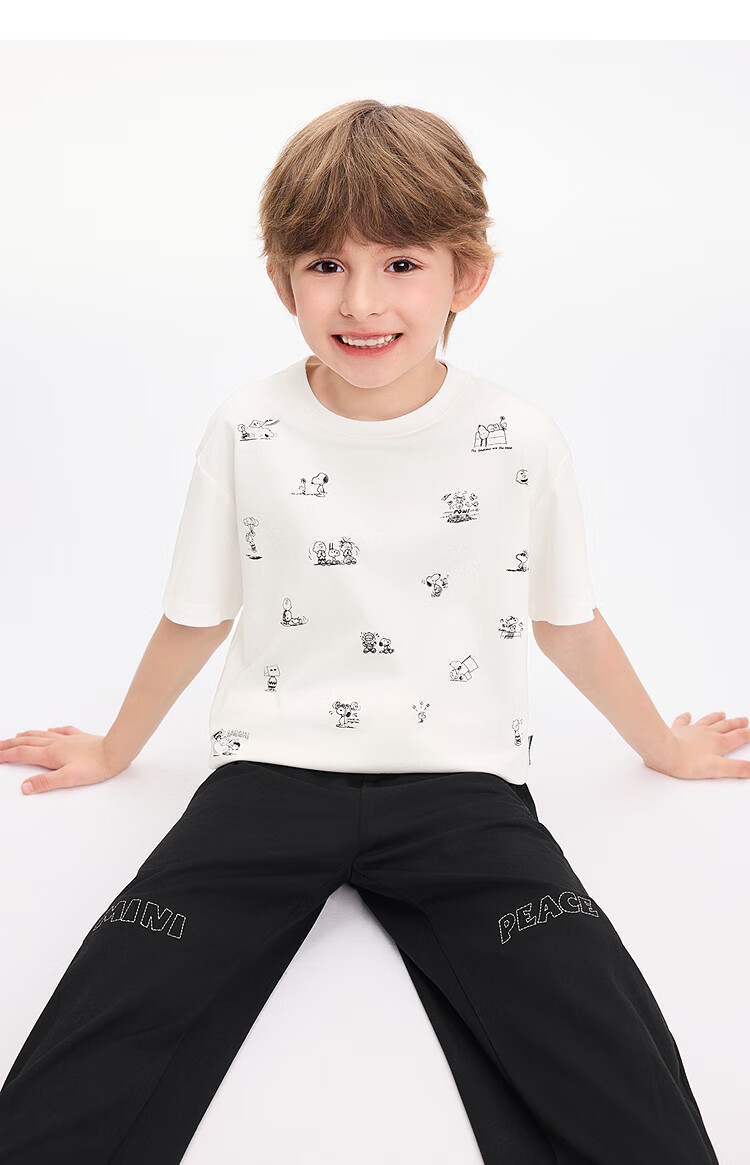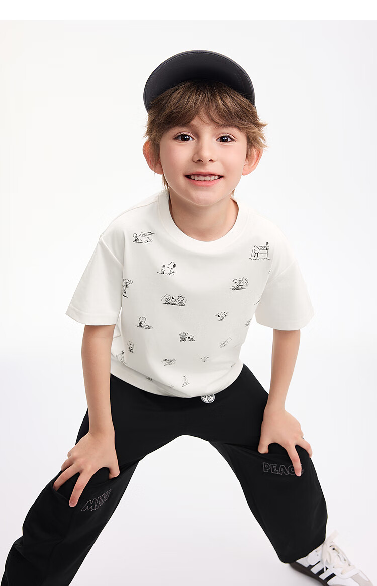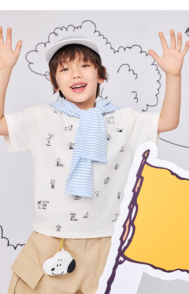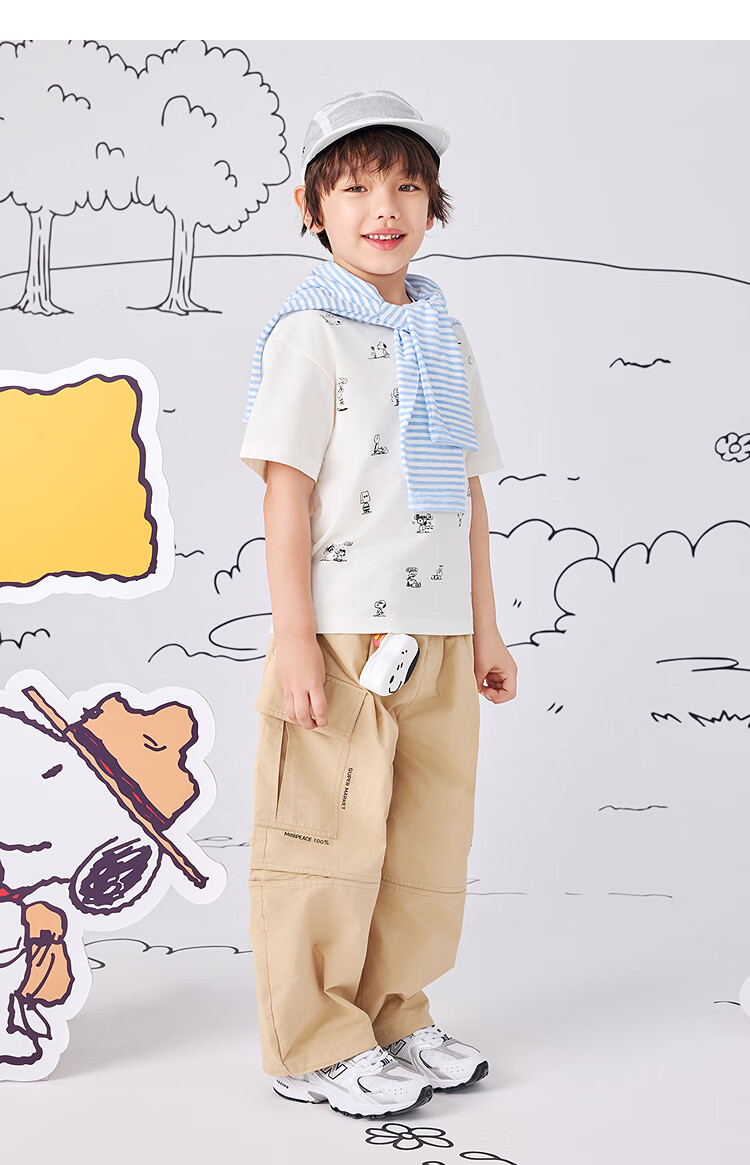MiniPeace cooling and antibacterial, same style as the counter, Snoopy joint series boys' short-sleeved T-shirt, beige 110