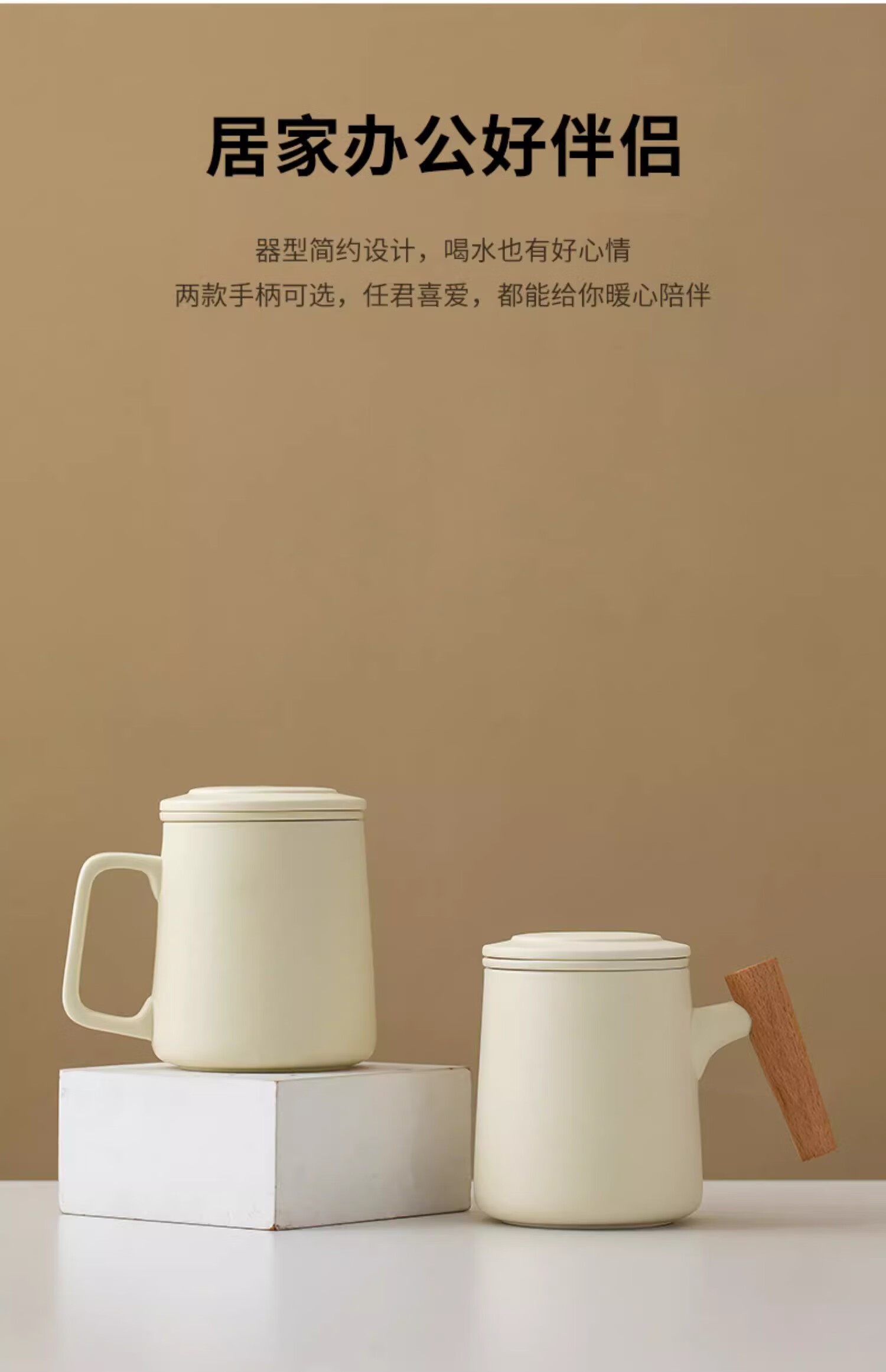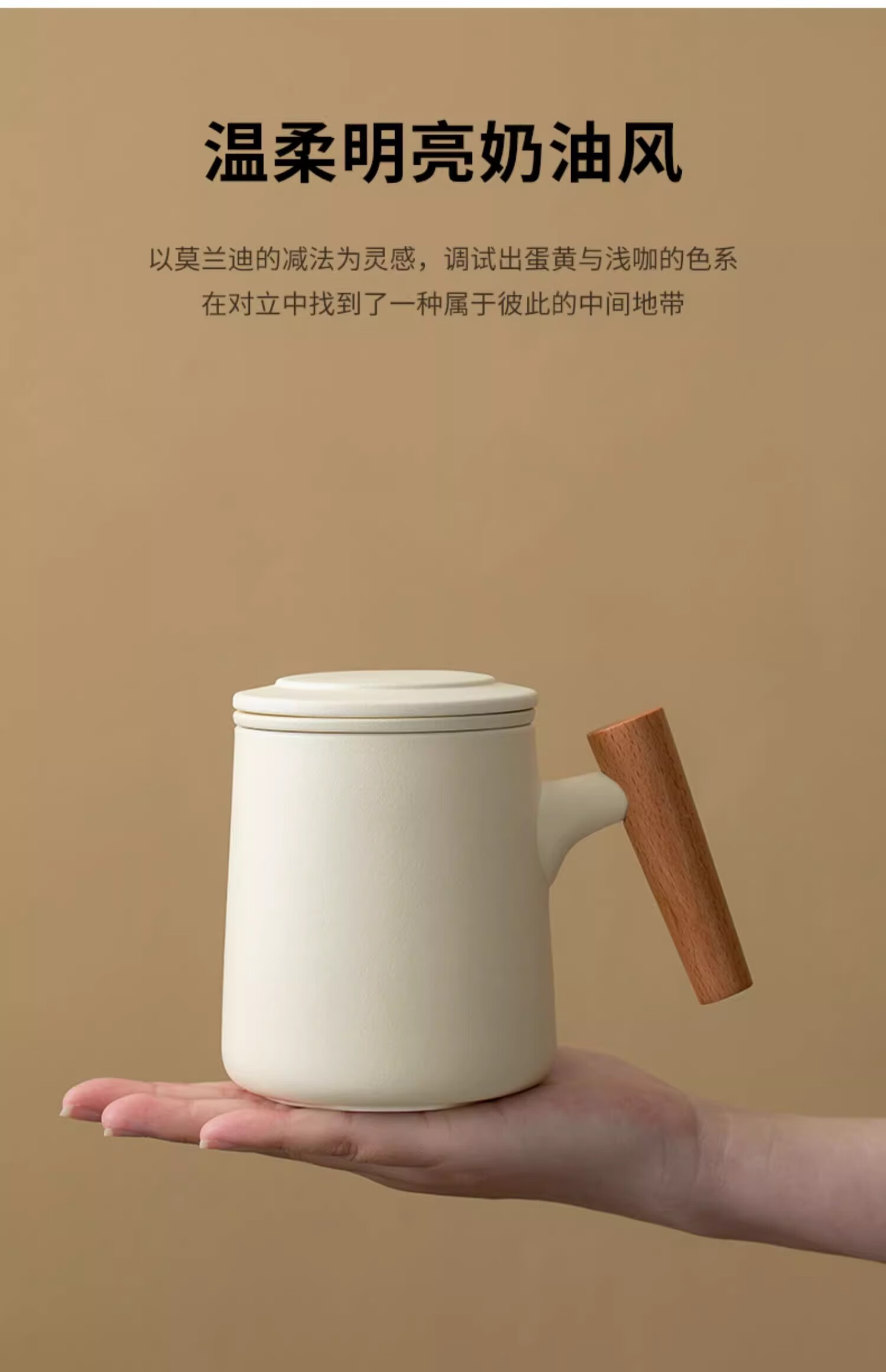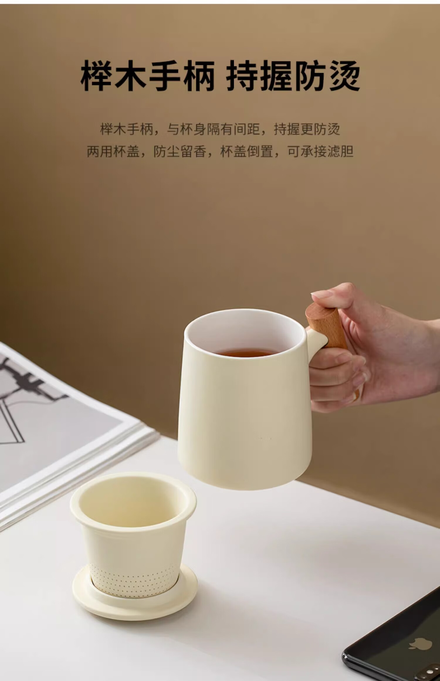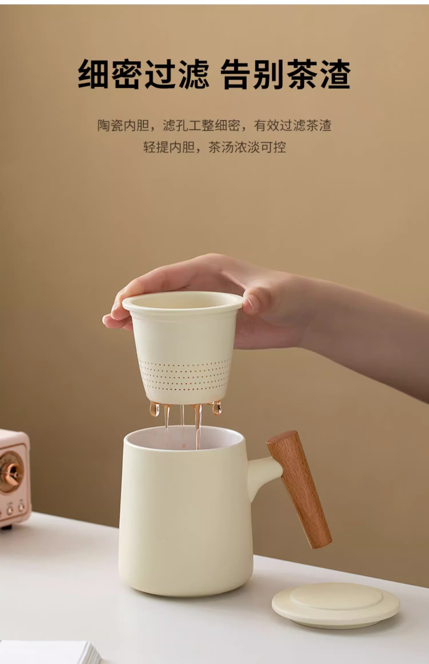 Simple ceramic tea cup, tea water separation cup, personal home office filtered water cup with lid, mug cup, customized wooden handle office cup, beige glaze