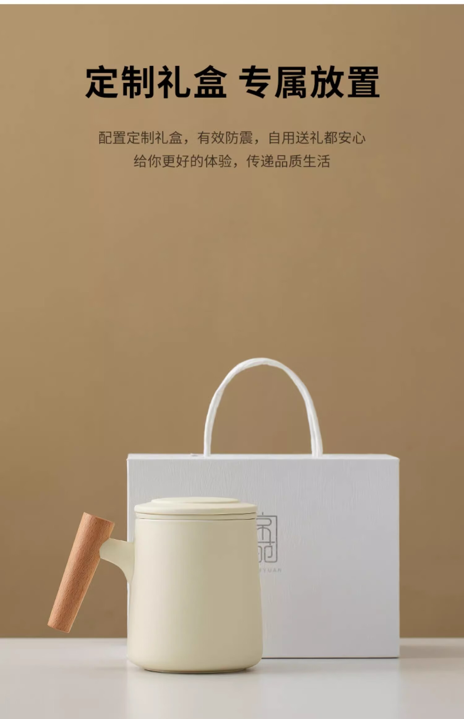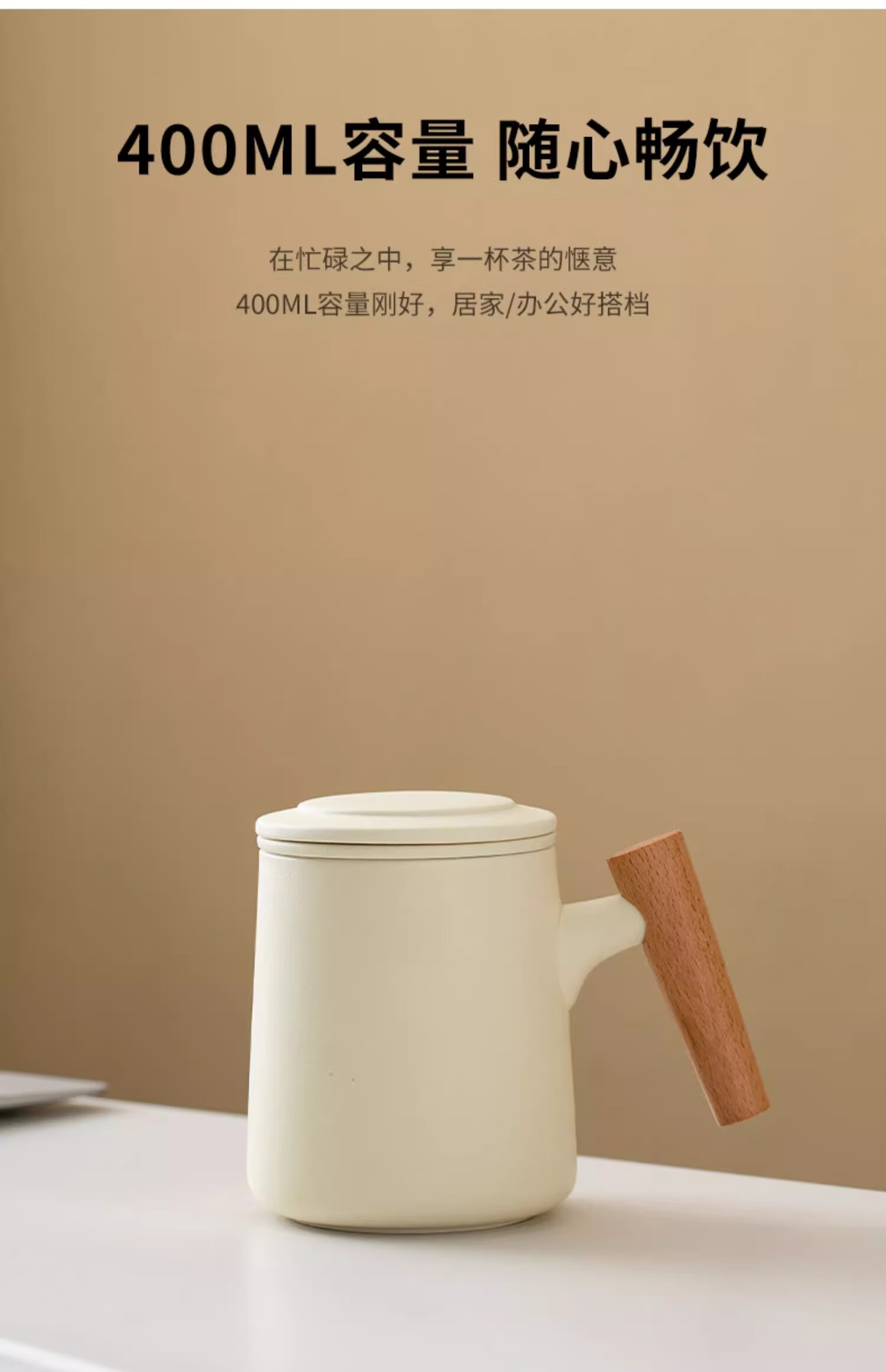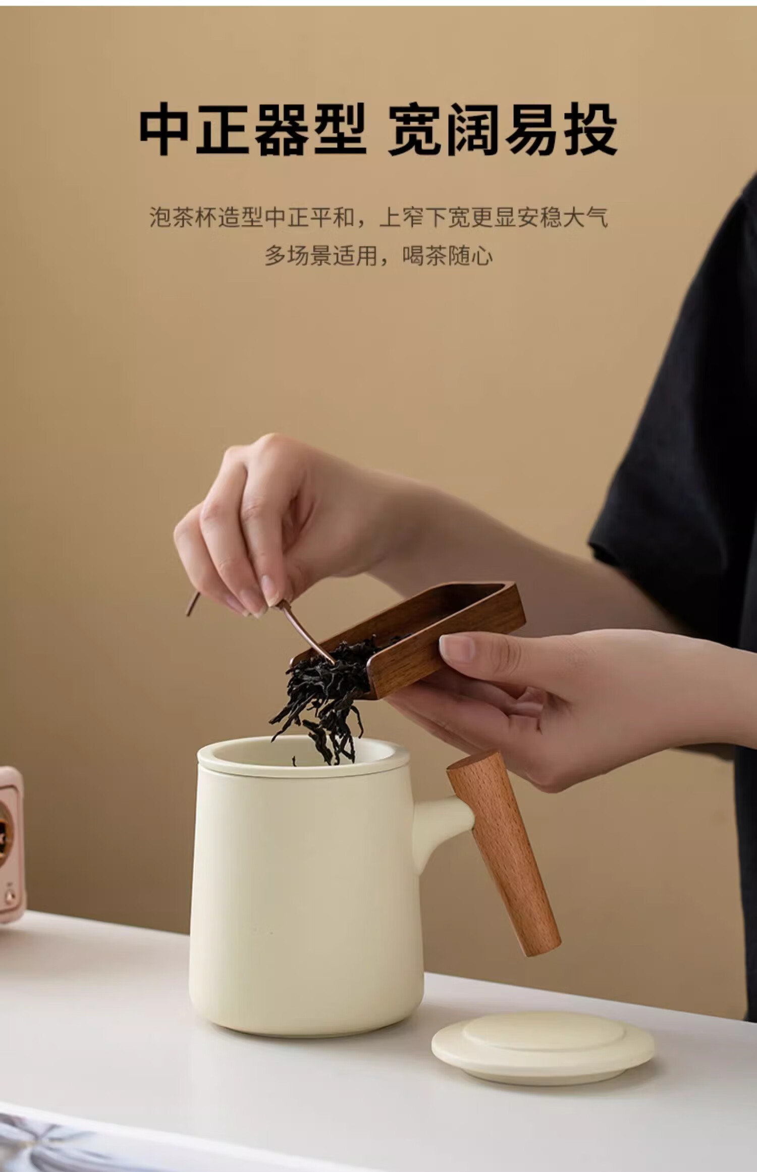 Simple ceramic tea cup, tea water separation cup, personal home office filtered water cup with lid, mug cup, customized wooden handle office cup, beige glaze
