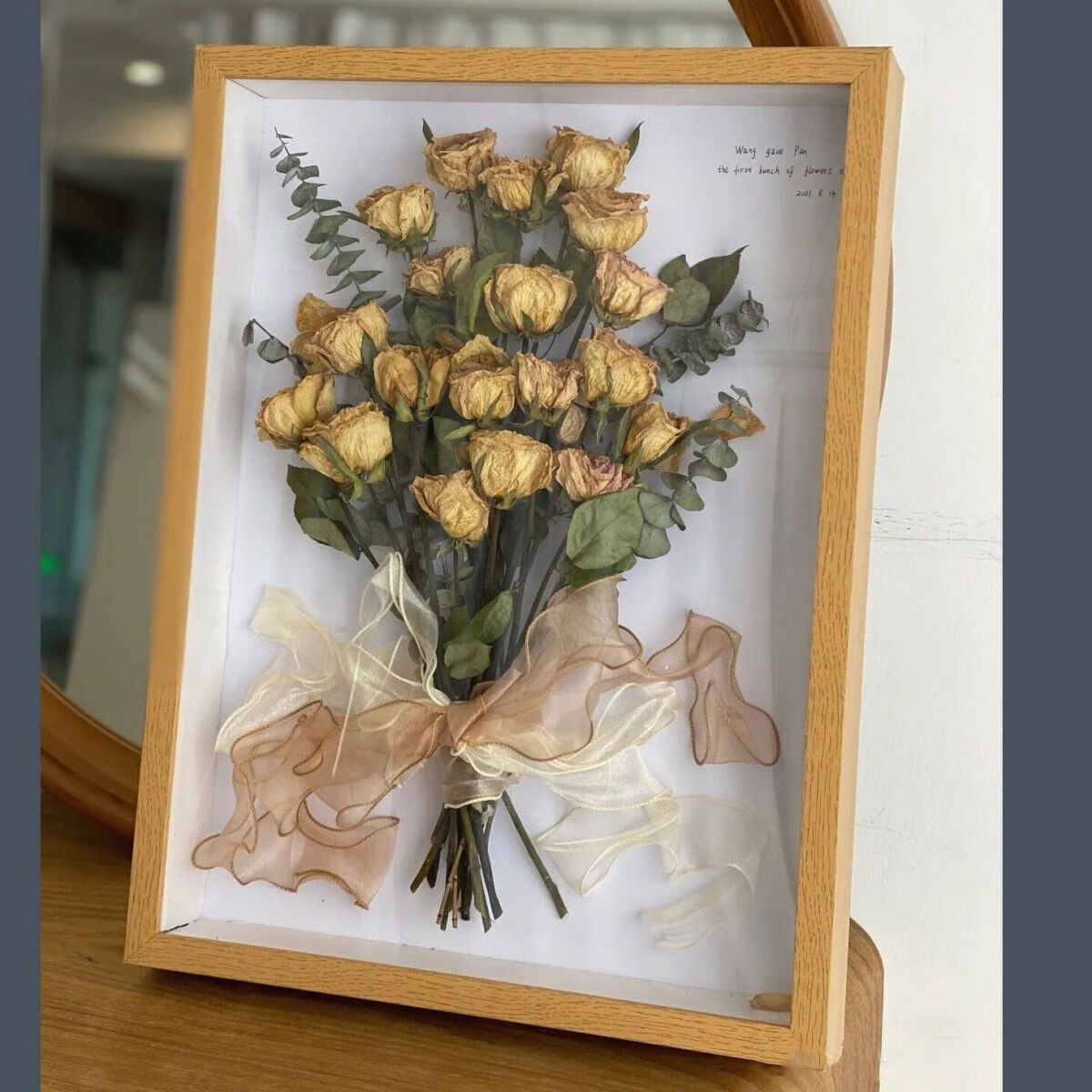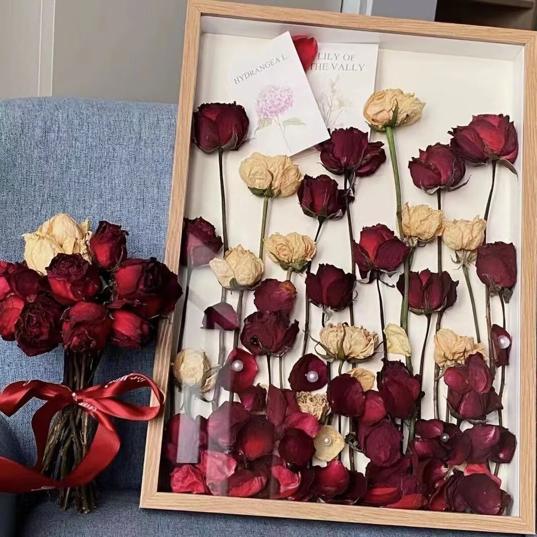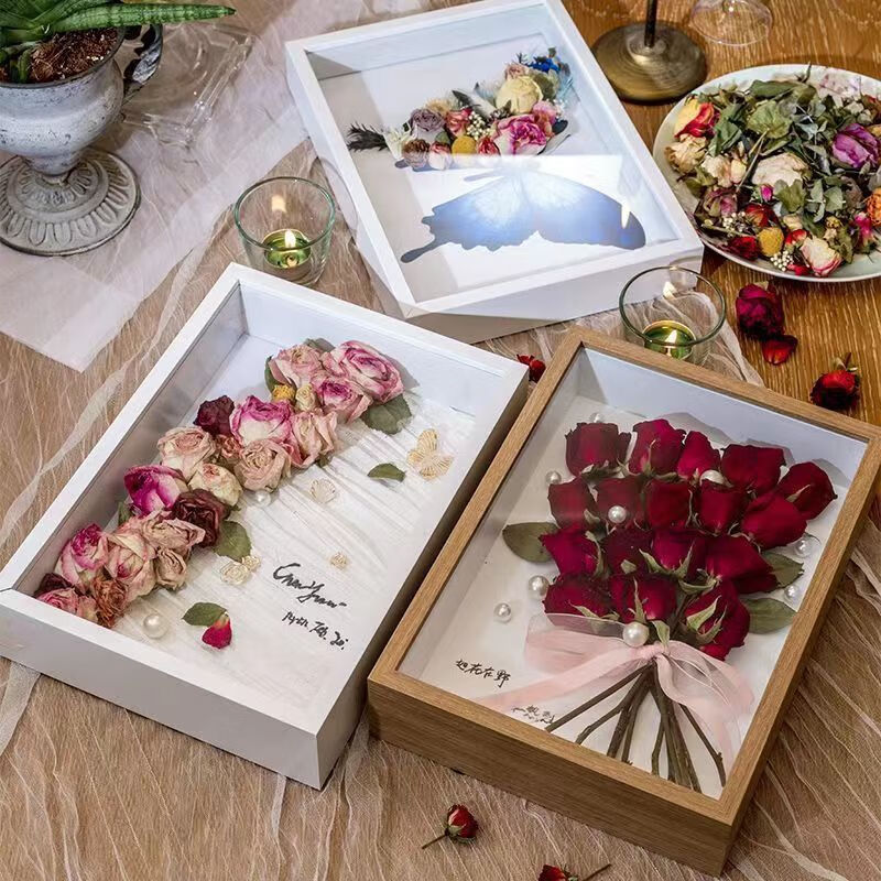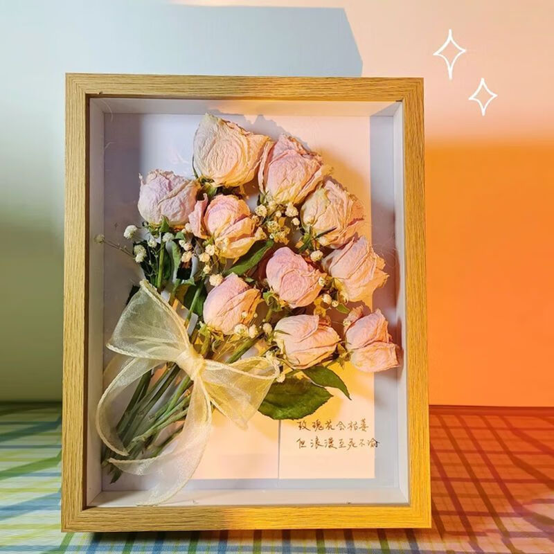 Chinese Valentine's Day gift hollow three-dimensional photo frame dried flowers preservation handmade creative diy picture frame eternal rose specimen table solid wood color + ribbon + glue + bottom paper + lanterns 10 inches suitable for 5-10 flowers