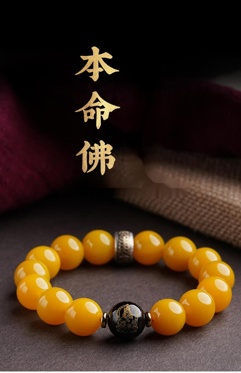 Fat Donglai's same style beeswax bracelet chicken fat yellow natal Buddha bracelet Russian material amber beads for men and women beeswax bracelet 10mm zodiac pig dog Amitabha