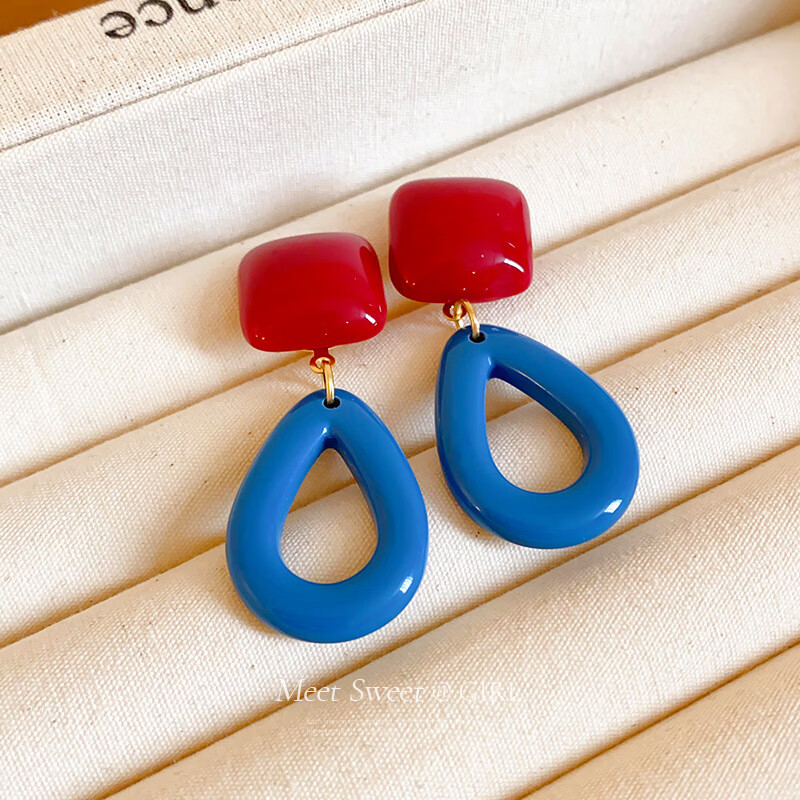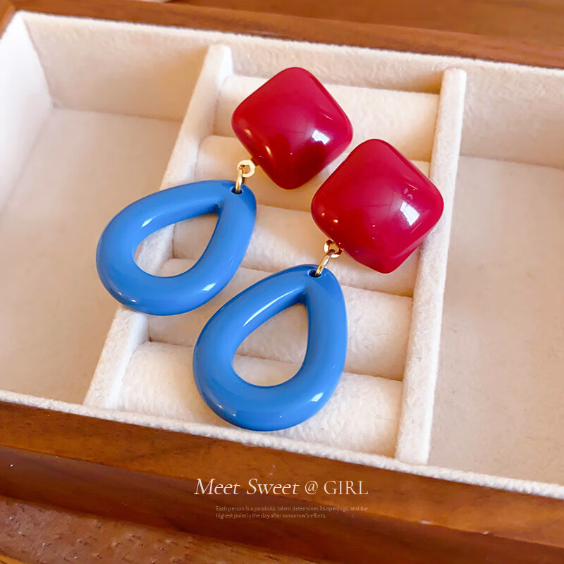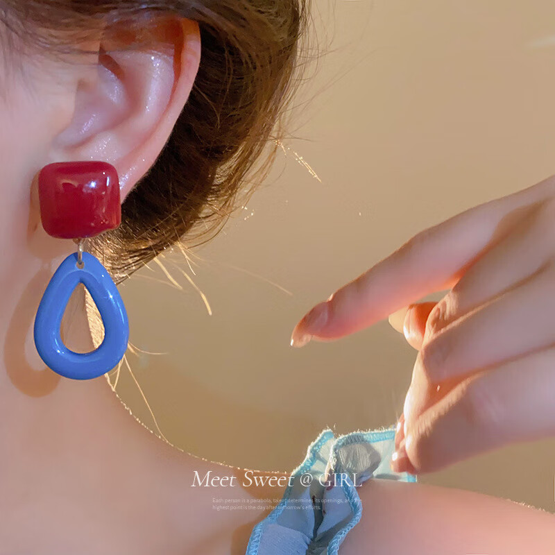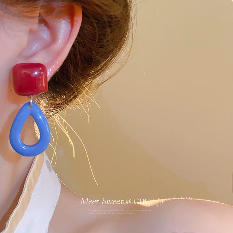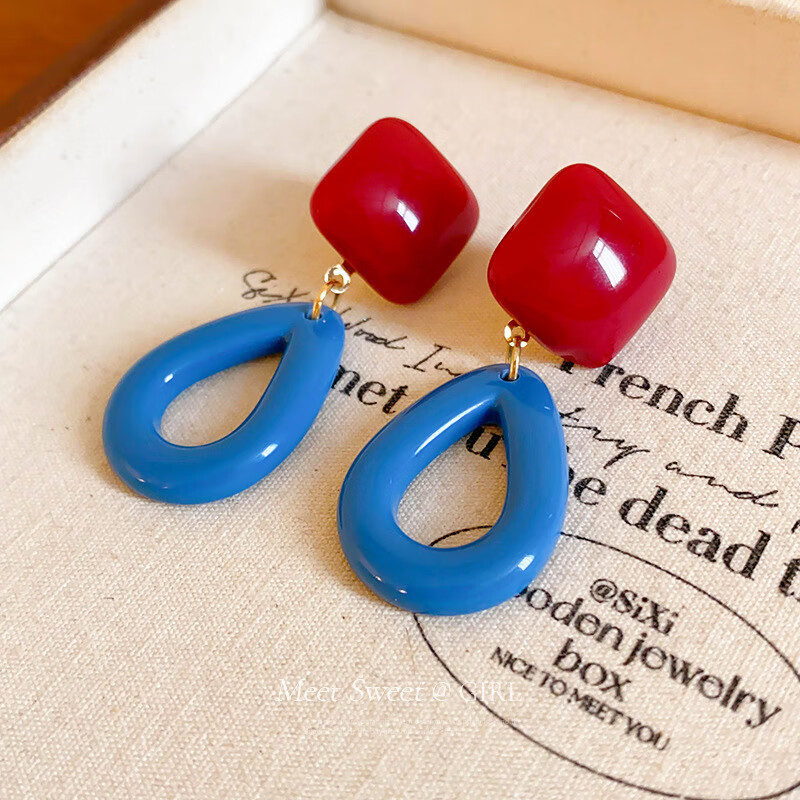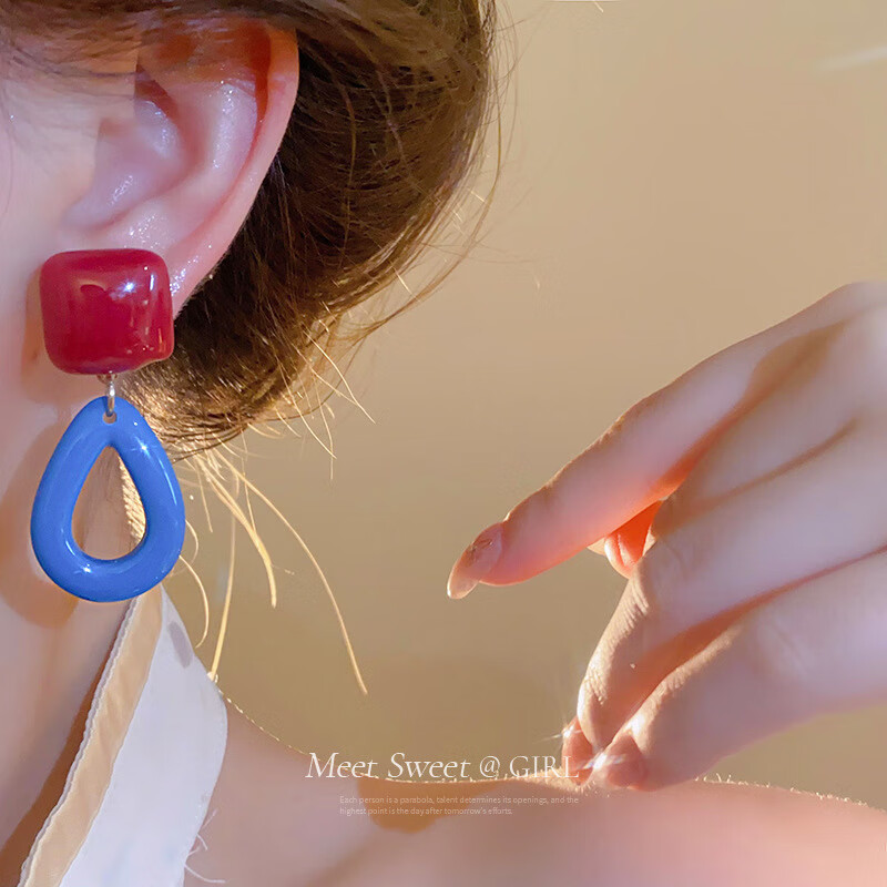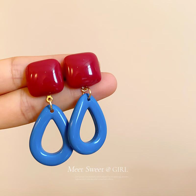 Non-pierced ear clips, water drop square resin retro fashion earrings, versatile niche temperament earrings, light luxury and high-end sense, ear clips - red - blue