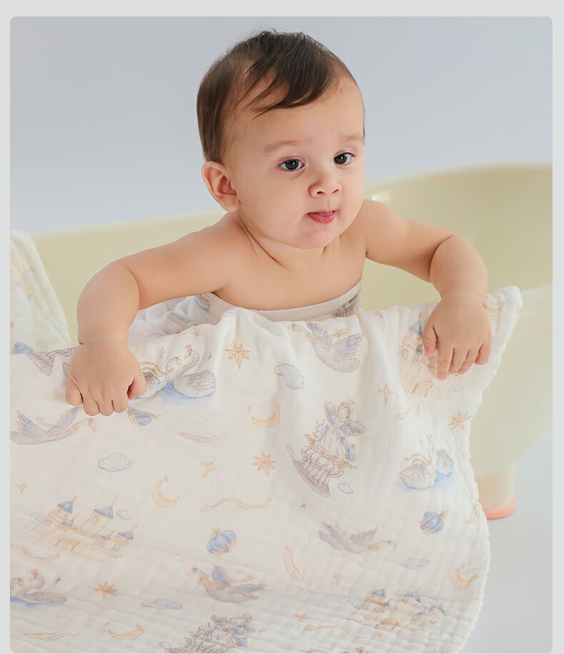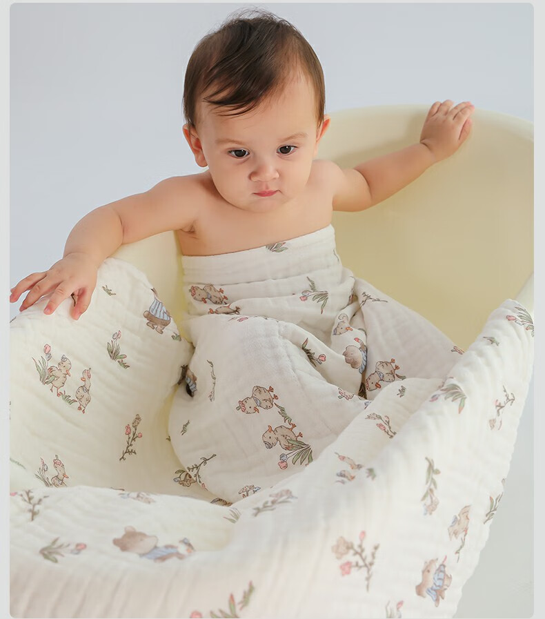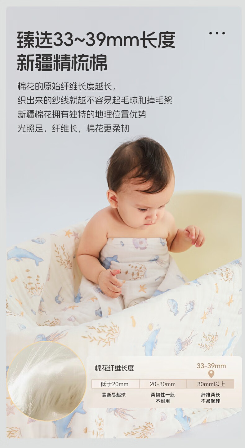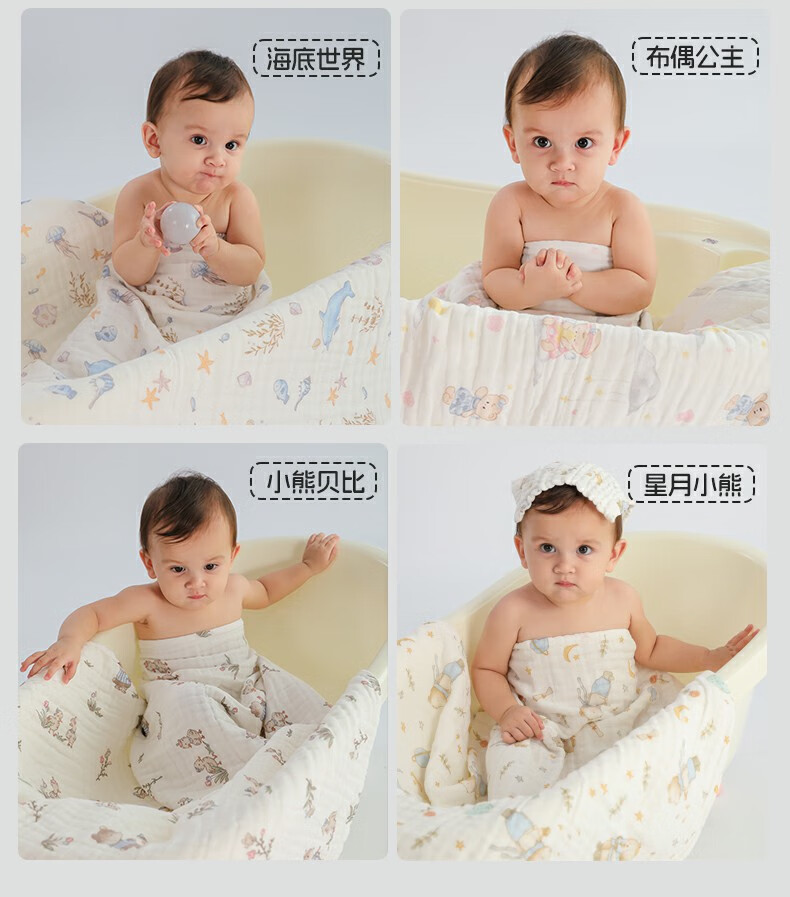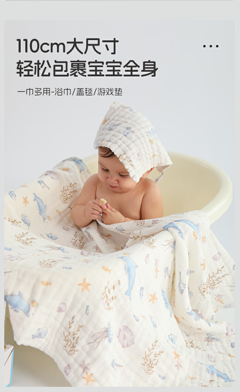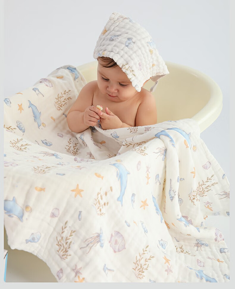Half-woven peach baby bath towel, Class A pure cotton gauze bath towel, soft absorbent newborn blanket, newborn baby bath blanket, Underwater World, 6 layers of gauze 110*110cm, Xinjiang combed cotton