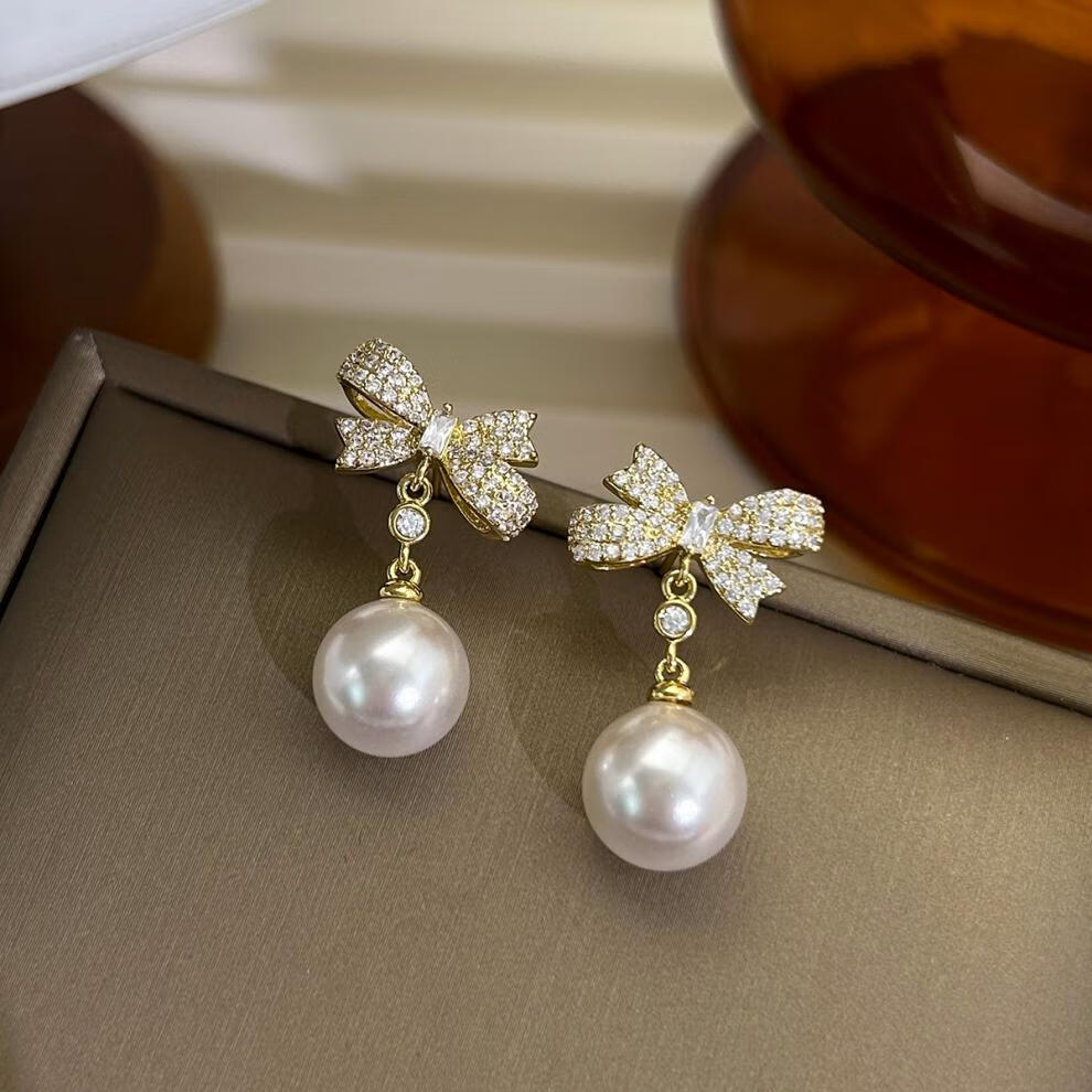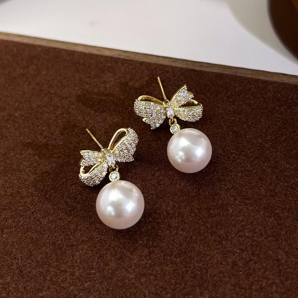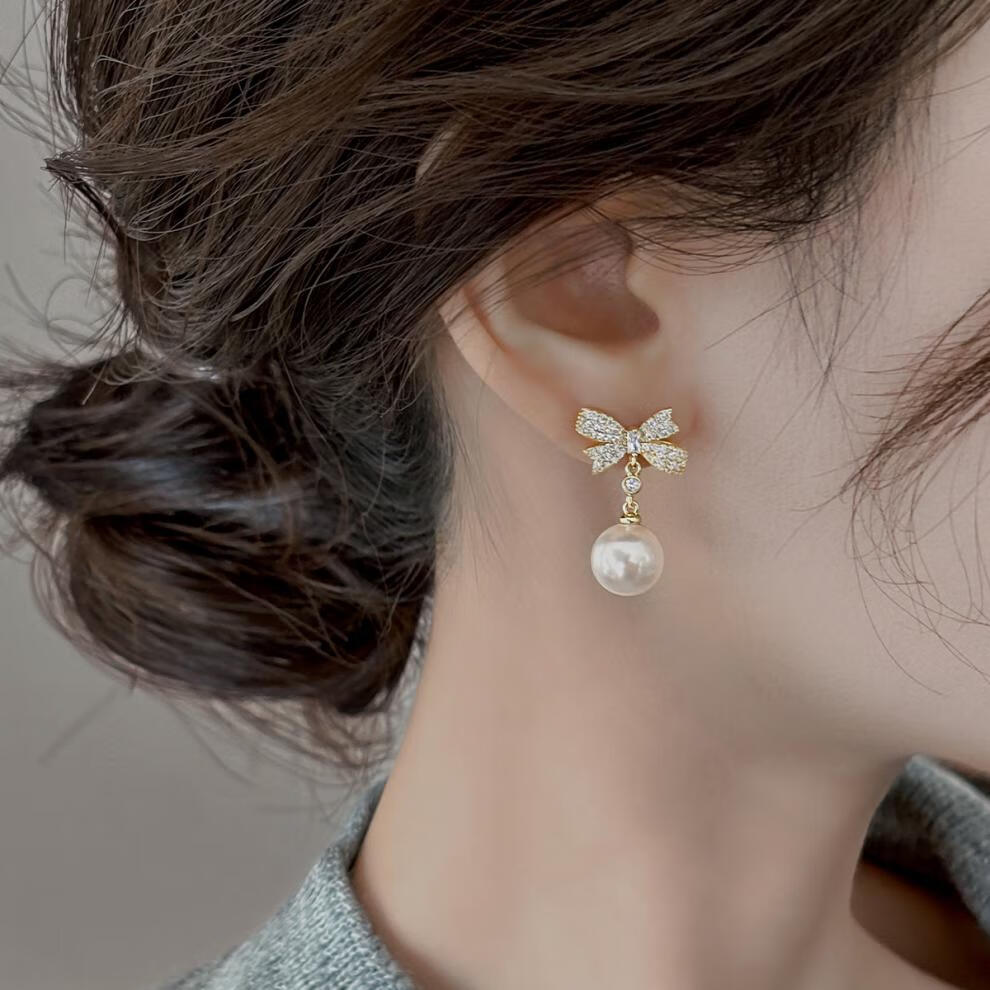 Auspicious God-given Sparkling Diamond Bow Pearl Earrings 2025 New Ear Clip Feel Sterling Silver Earrings Niche Design Earrings Bow Pearl Earrings for Women