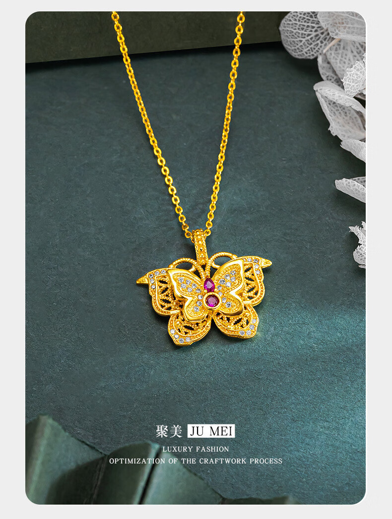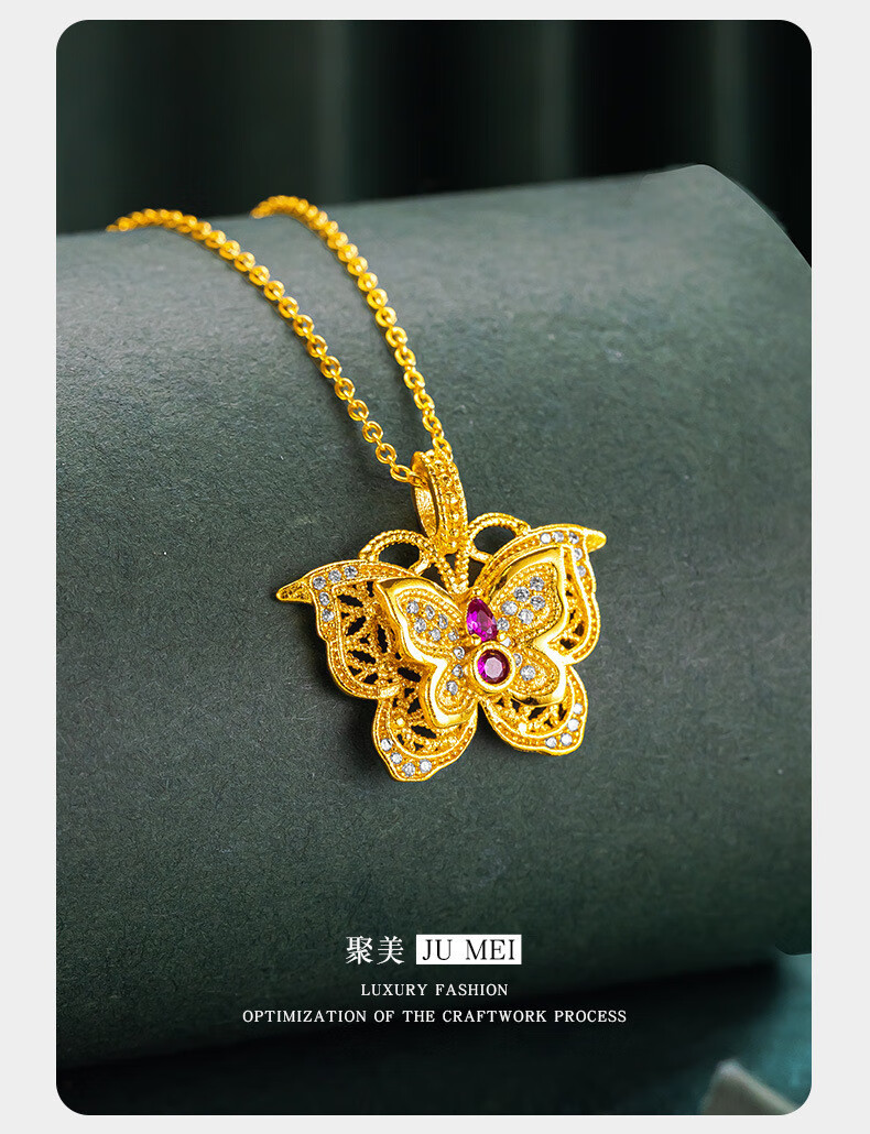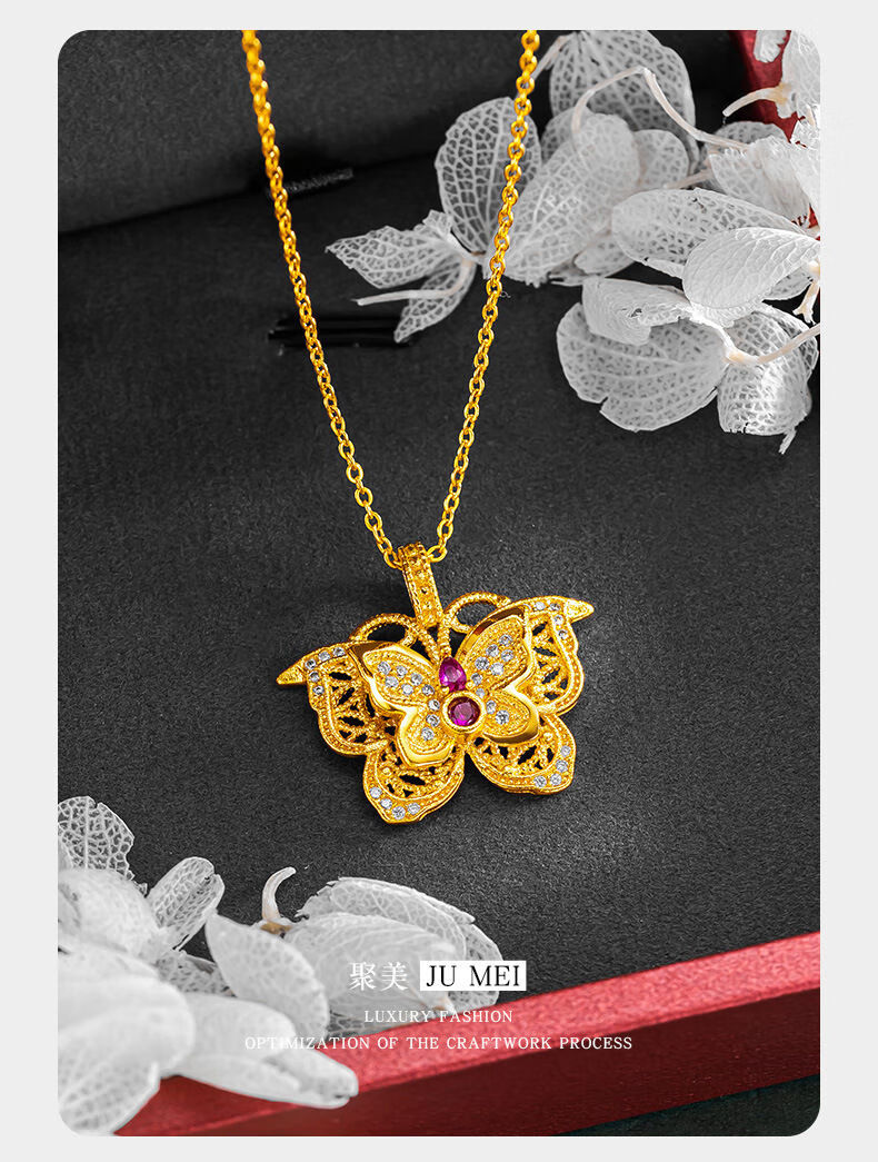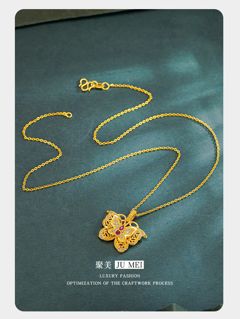 YIBIY Filigree Hollow Ruby Butterfly Pendant Vietnamese Sand Gold Butterfly Necklace Gold Butterfly Pendant Clavicle Chain Women's Accessories Ruby Butterfly Pendant + O Necklace