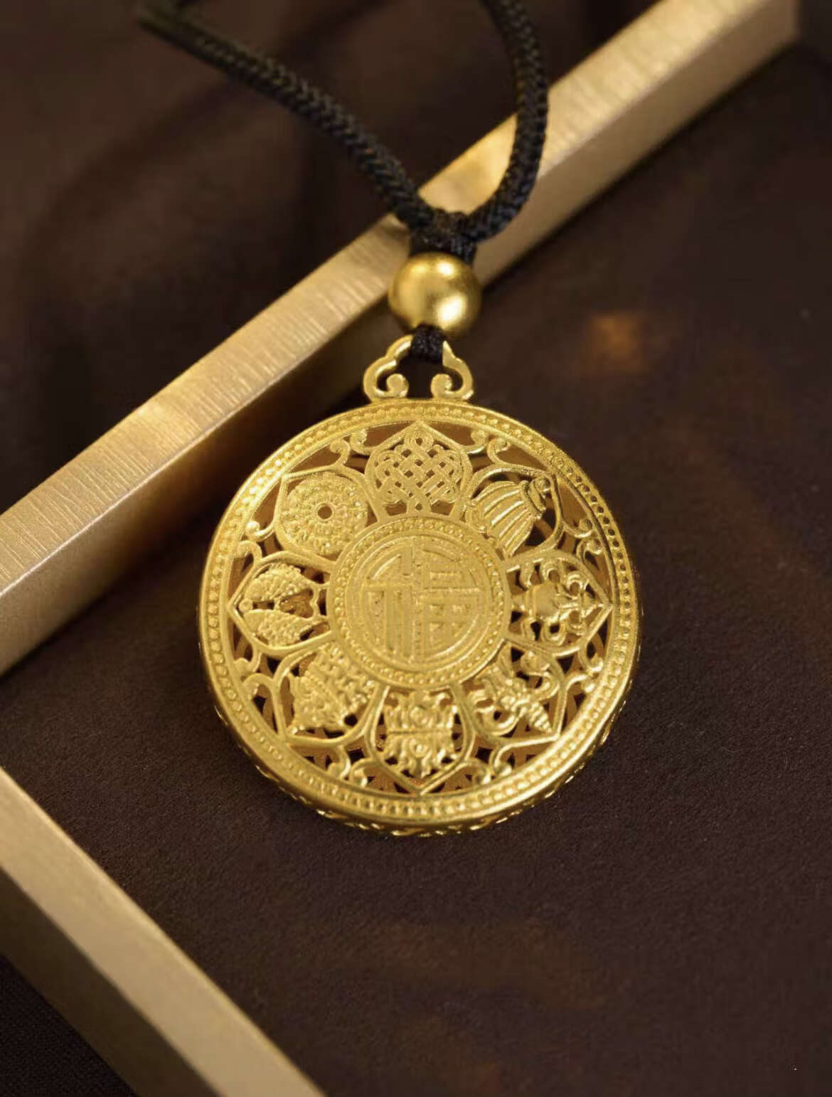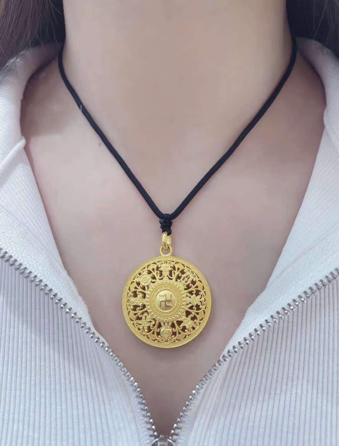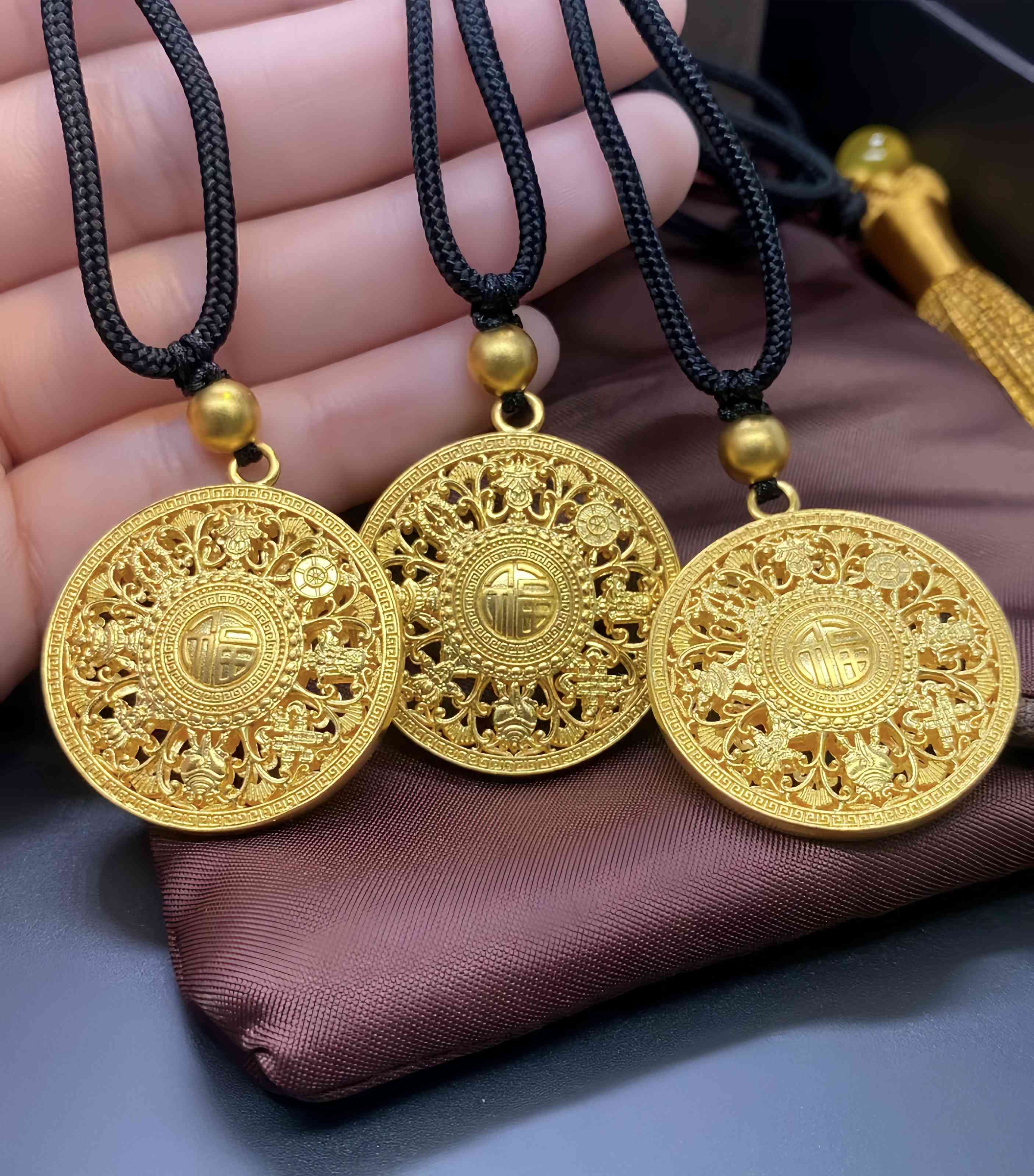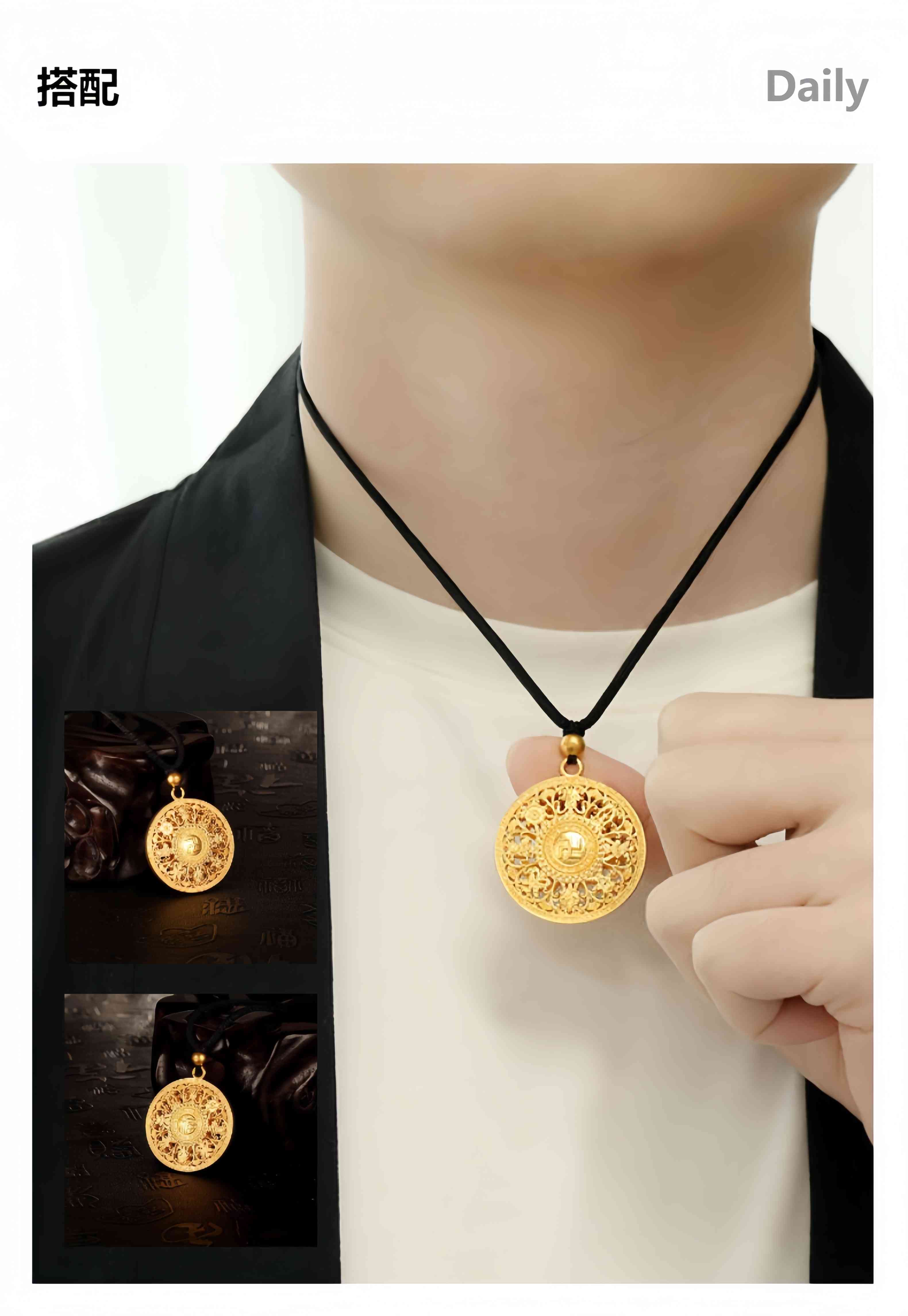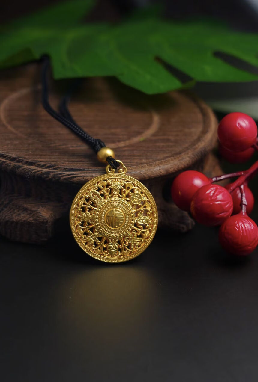 QIWN gold-plated eight-treasure compass pendant for women, good fortune buckle, fortune lotus hollow disc necklace pendant, 3.5cm swastika compass, gold-plated about 1.2 grams