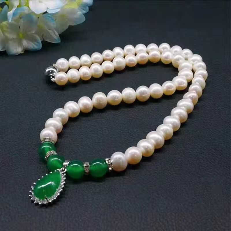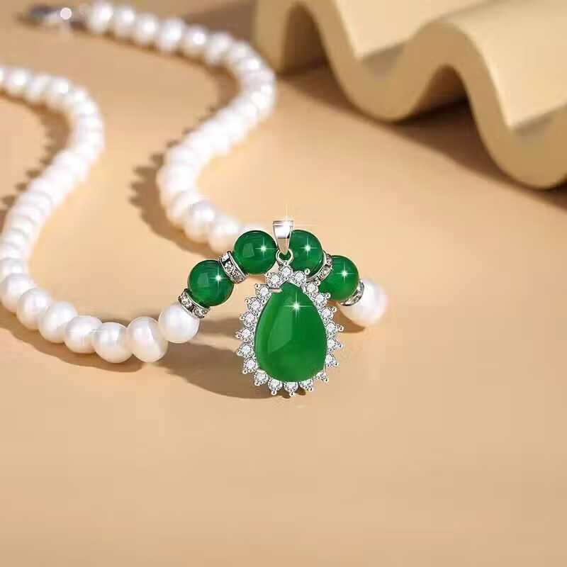 Fat Donglai's same style chalcedony pendant freshwater pearl necklace fashionable and elegant, lifelike rich pearl water drop silver set chain