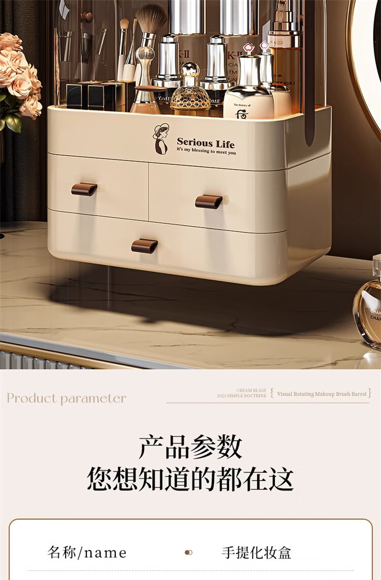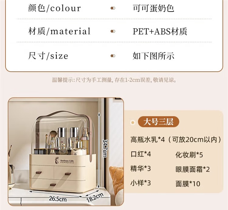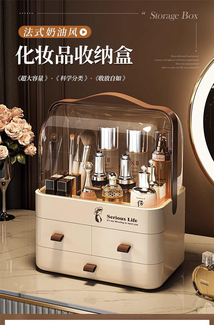 First concept of cosmetic storage box, skin care product dust-proof storage box with lid, drawer-type large-capacity dressing table storage rack, three layers, cream white
