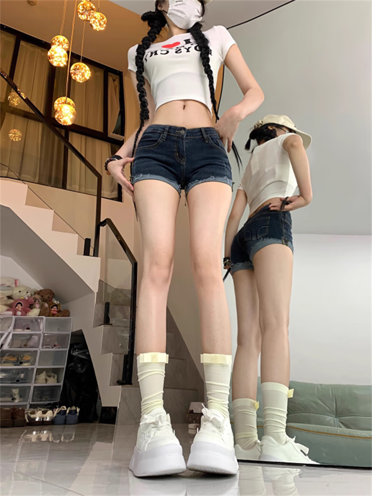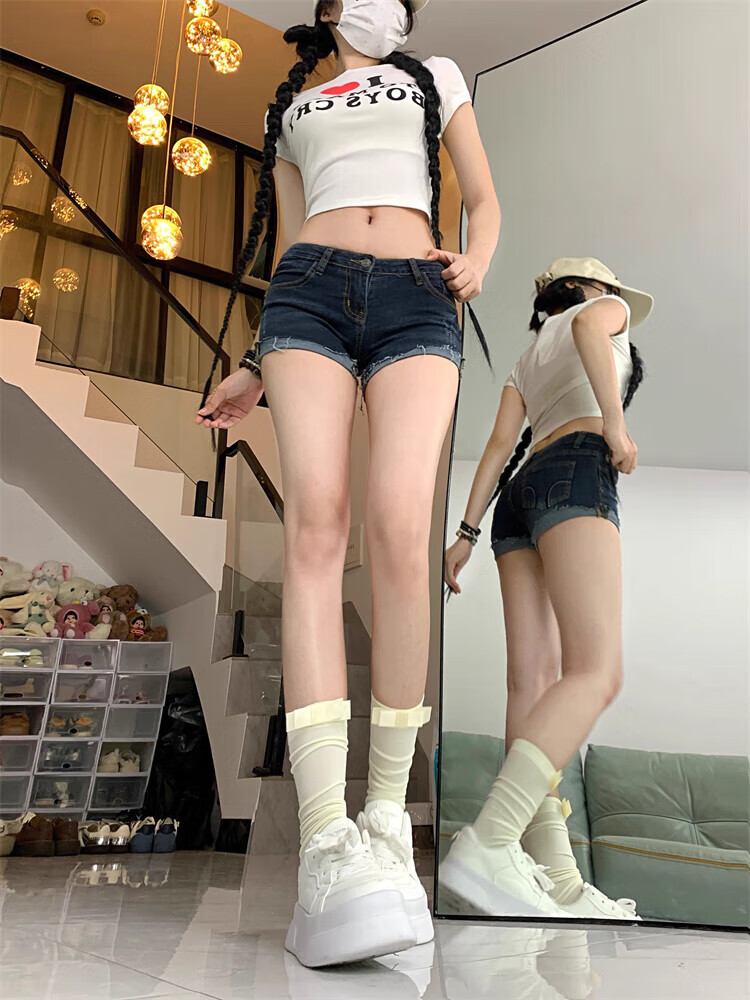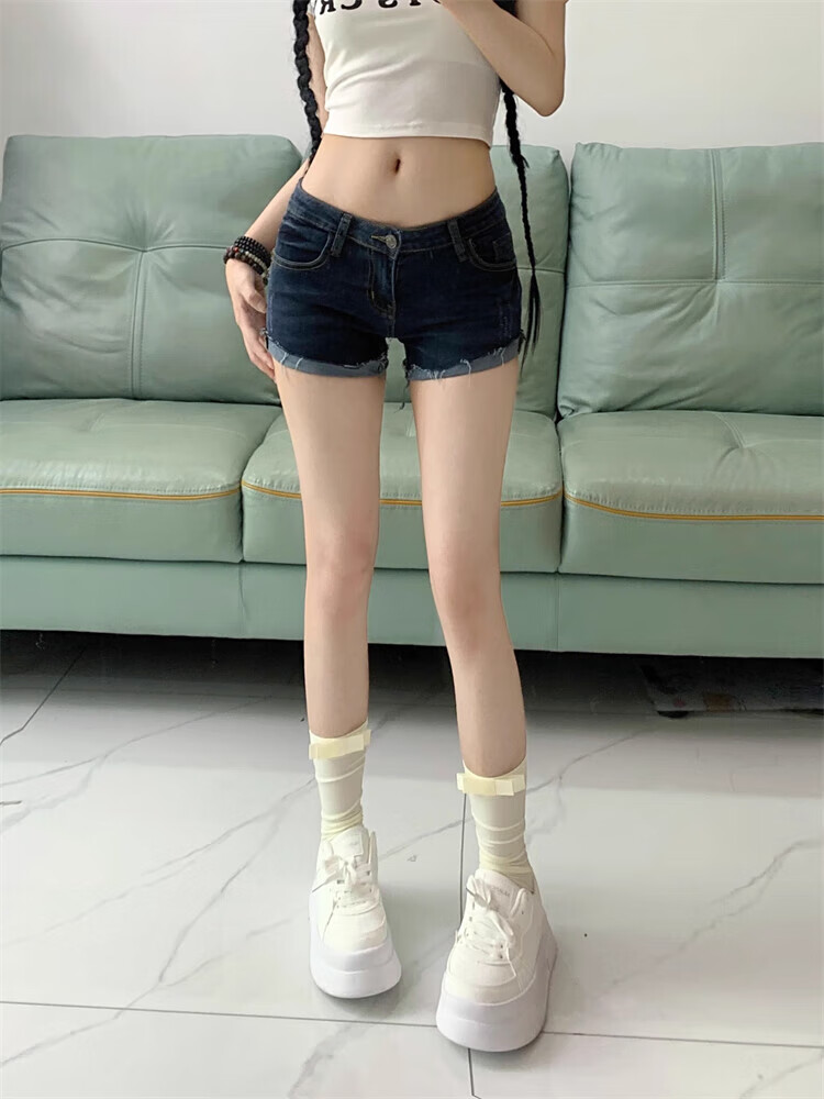 Bai Qixin Korean style retro denim shorts for women, low-waisted, exposed navel, elastic tight-fitting, slimming buttocks, rolled hems, fashionable and versatile hot pants for women, cuffed denim shorts (size is too small, please take the larger size) M (95-105Jin Jin is equal to 0.5kg)