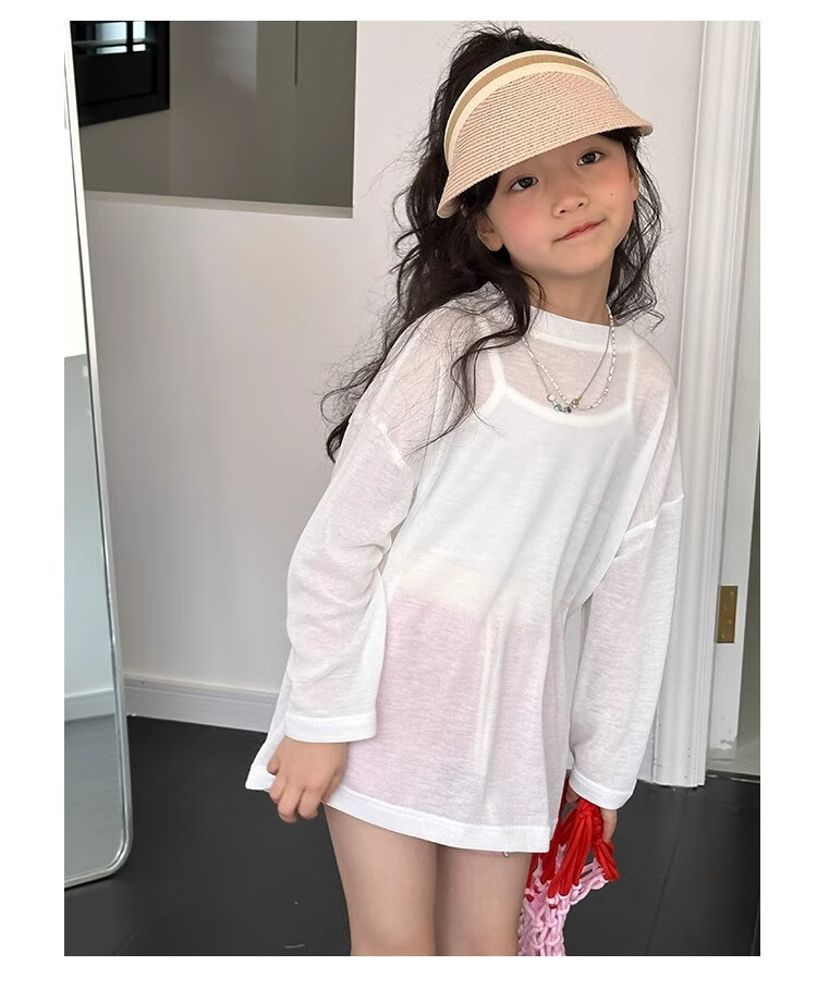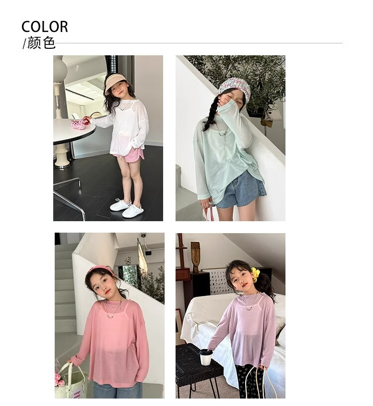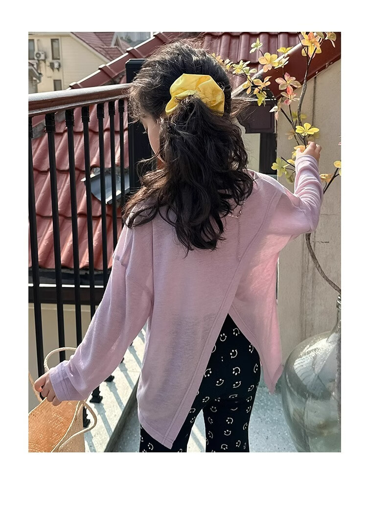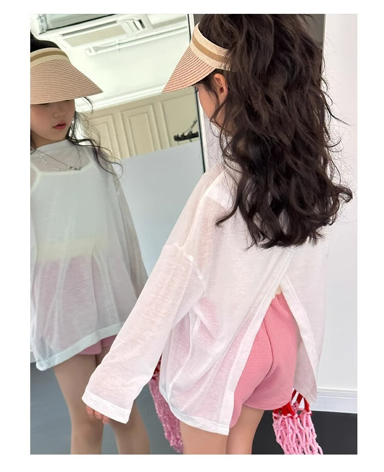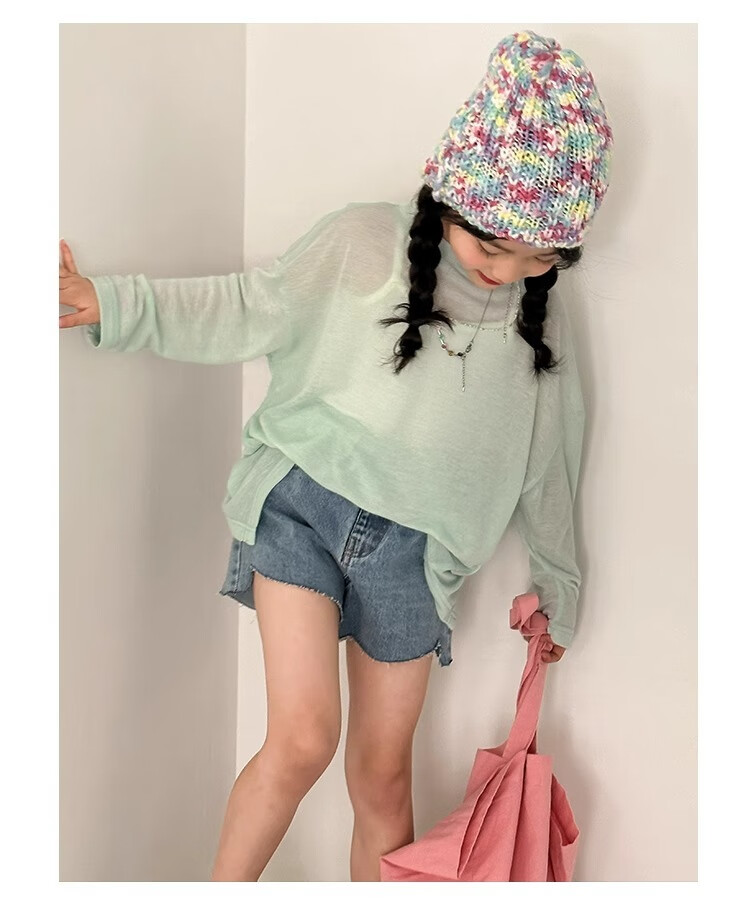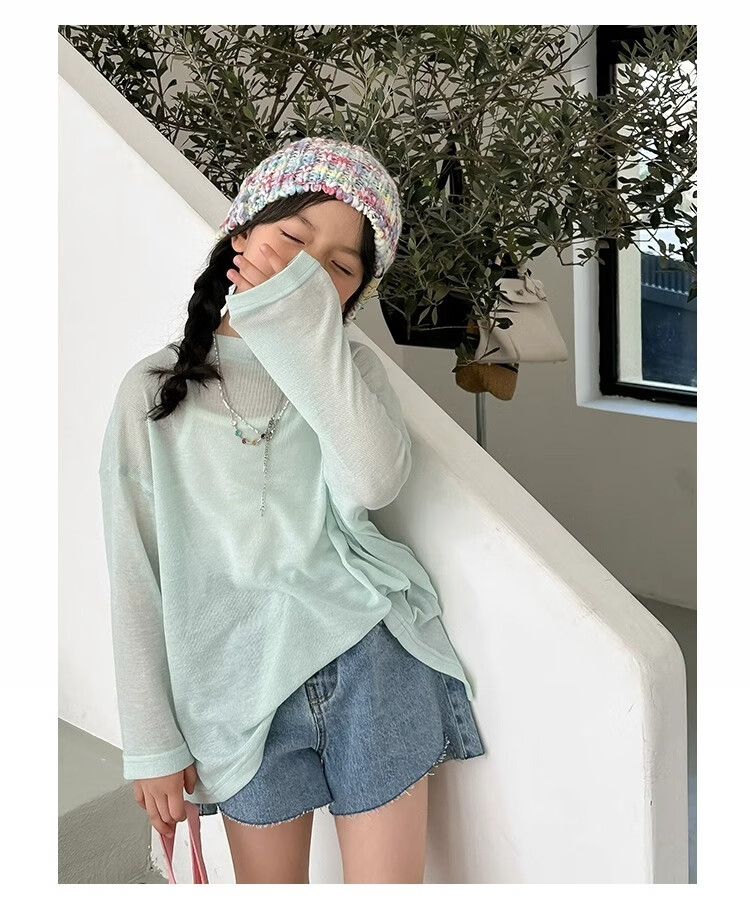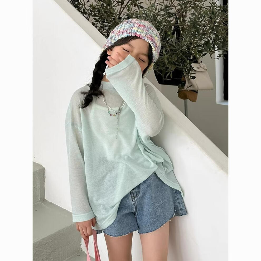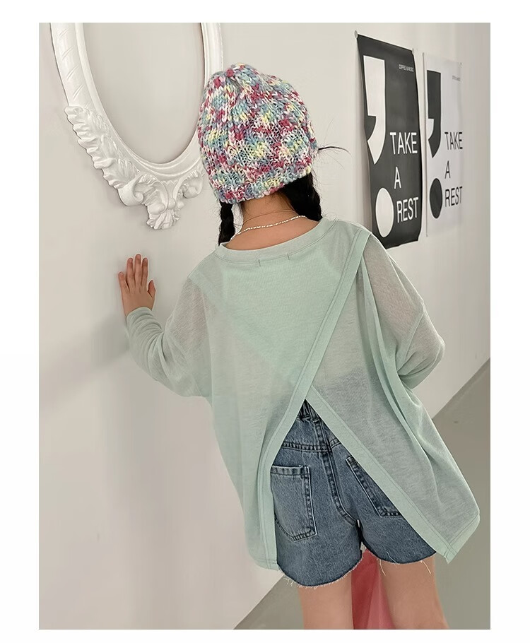 Bon Eve Girls Thin Sun Protection Clothing 2025 Summer New Style Back Slit Design Round Neck Loose Long Sleeve Beach Sun Protection T Lake Heart Green 130