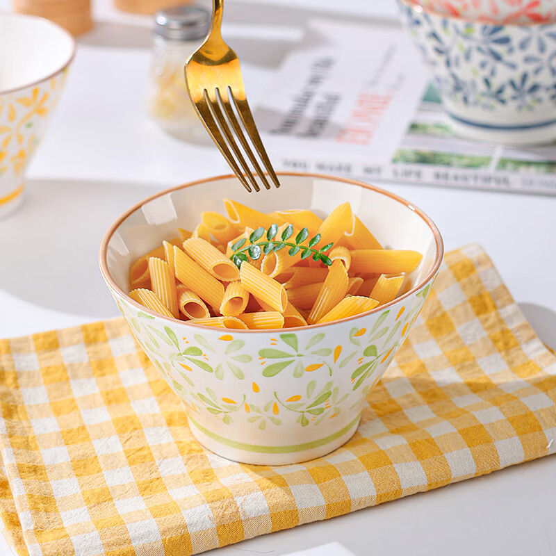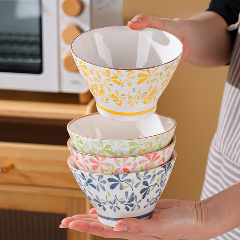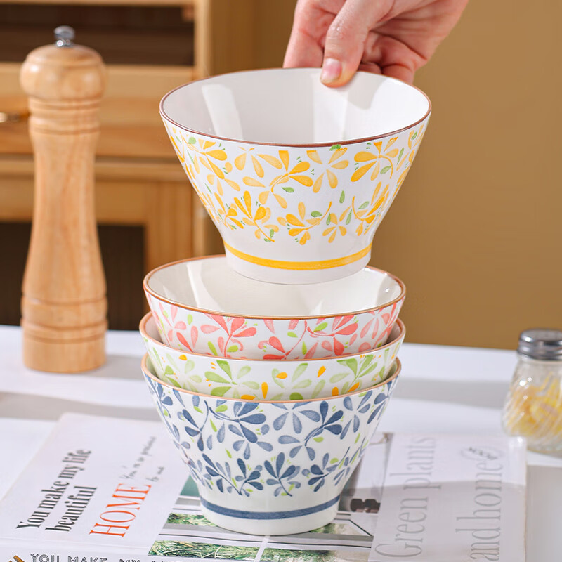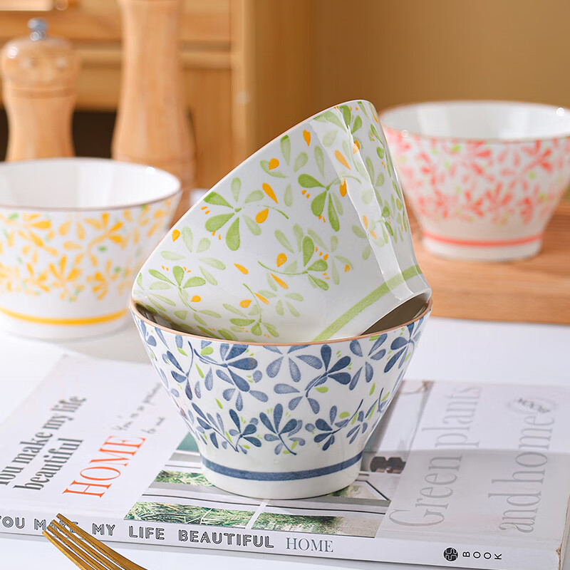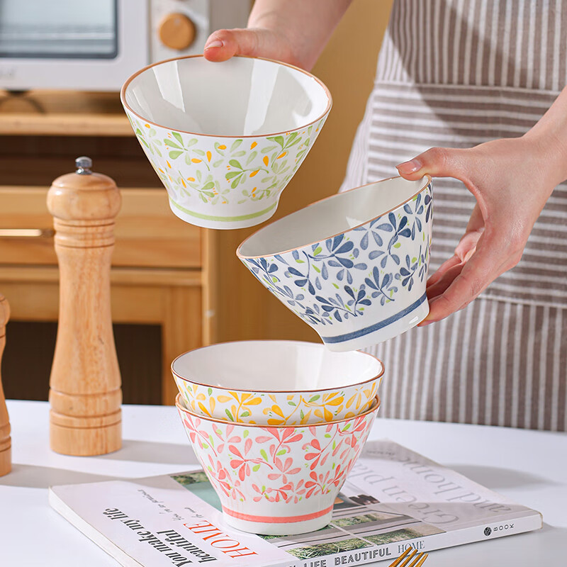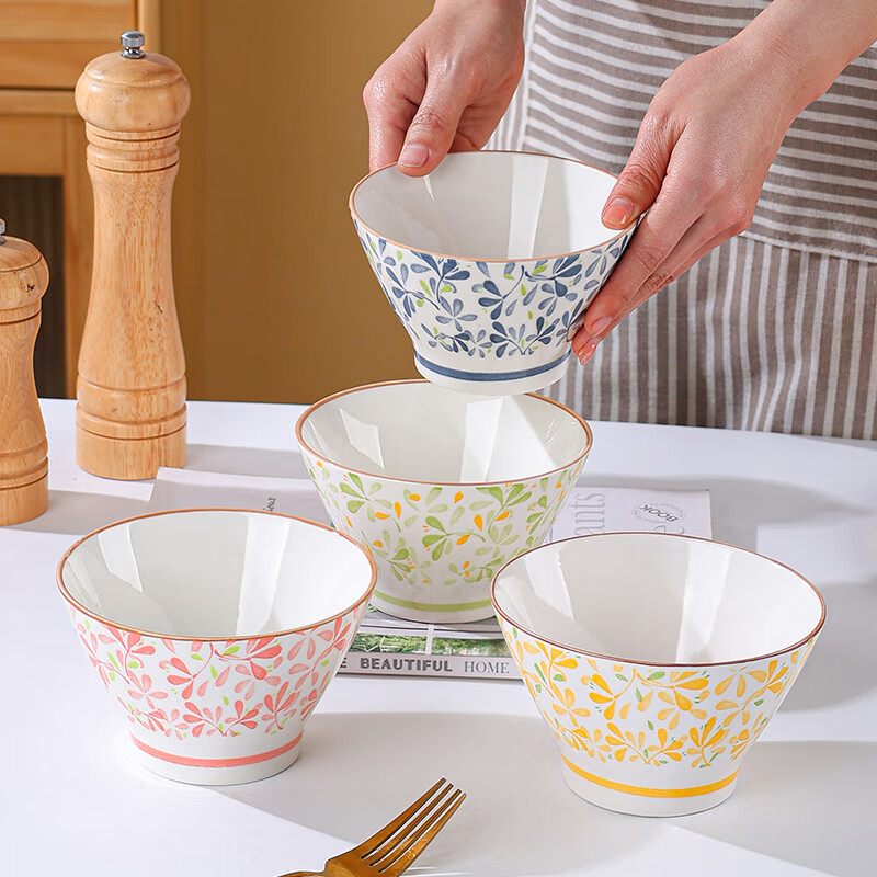 Four seasons prosperous bamboo hat bowl household ceramic eating underglaze color rice bowl set prosperous 4.5 inch bowl 4 pieces 4 colors