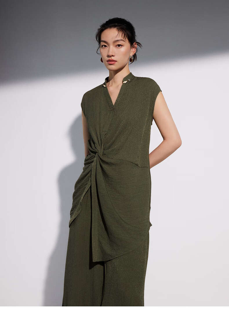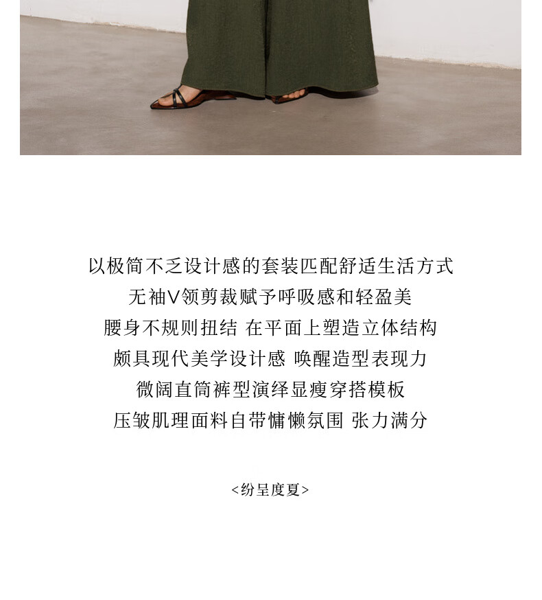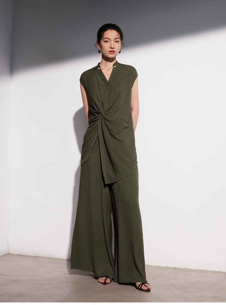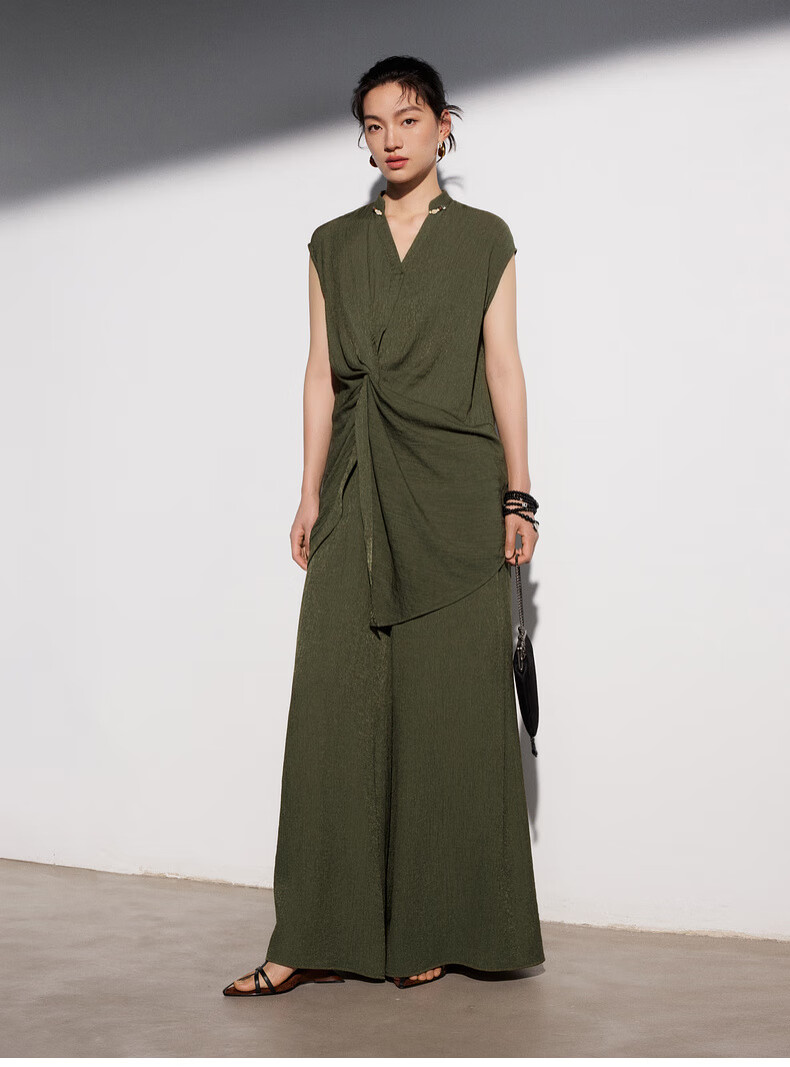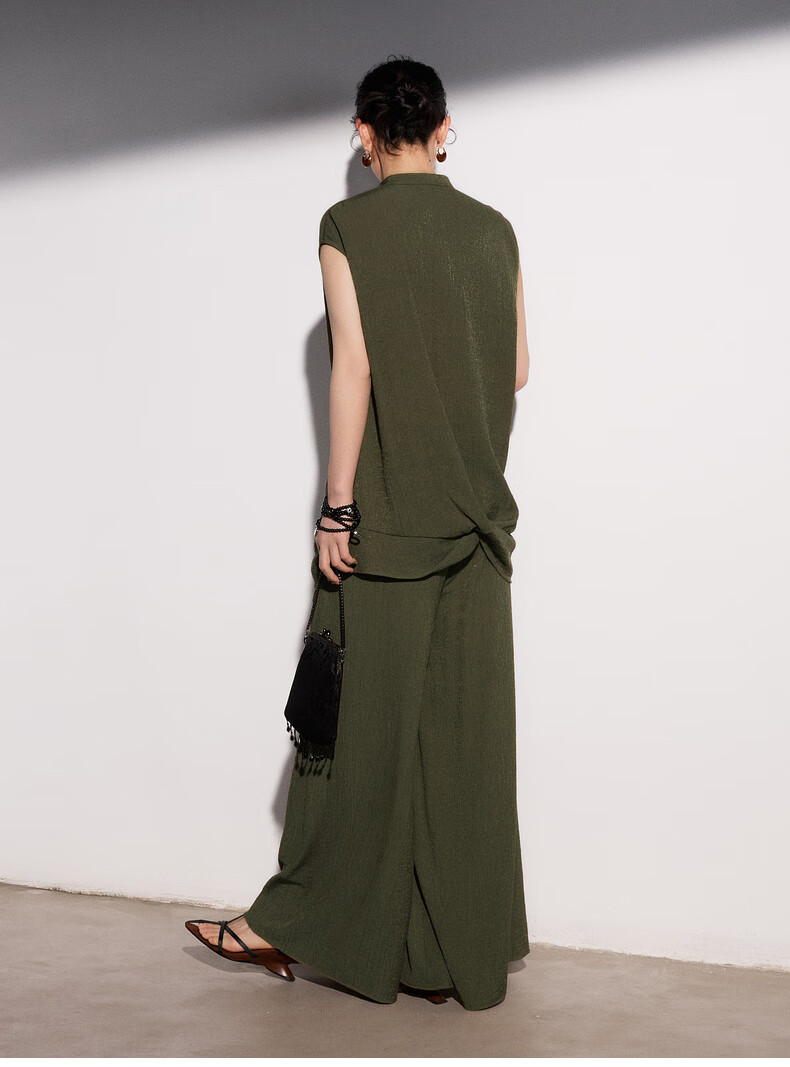 SUSHE Minimalism Textured Glossy V-neck Loose Sleeveless Top Straight Pants Suit Qing Hao-Top S