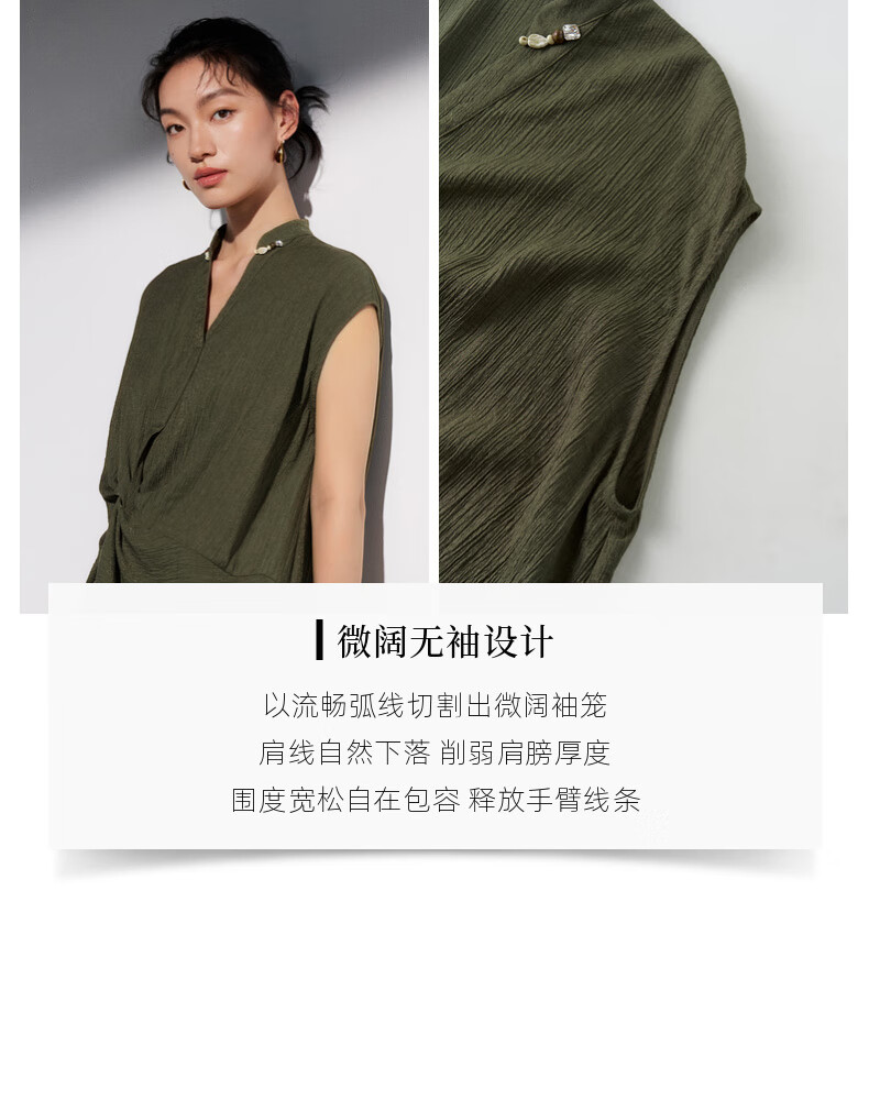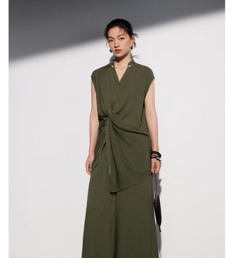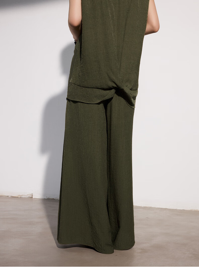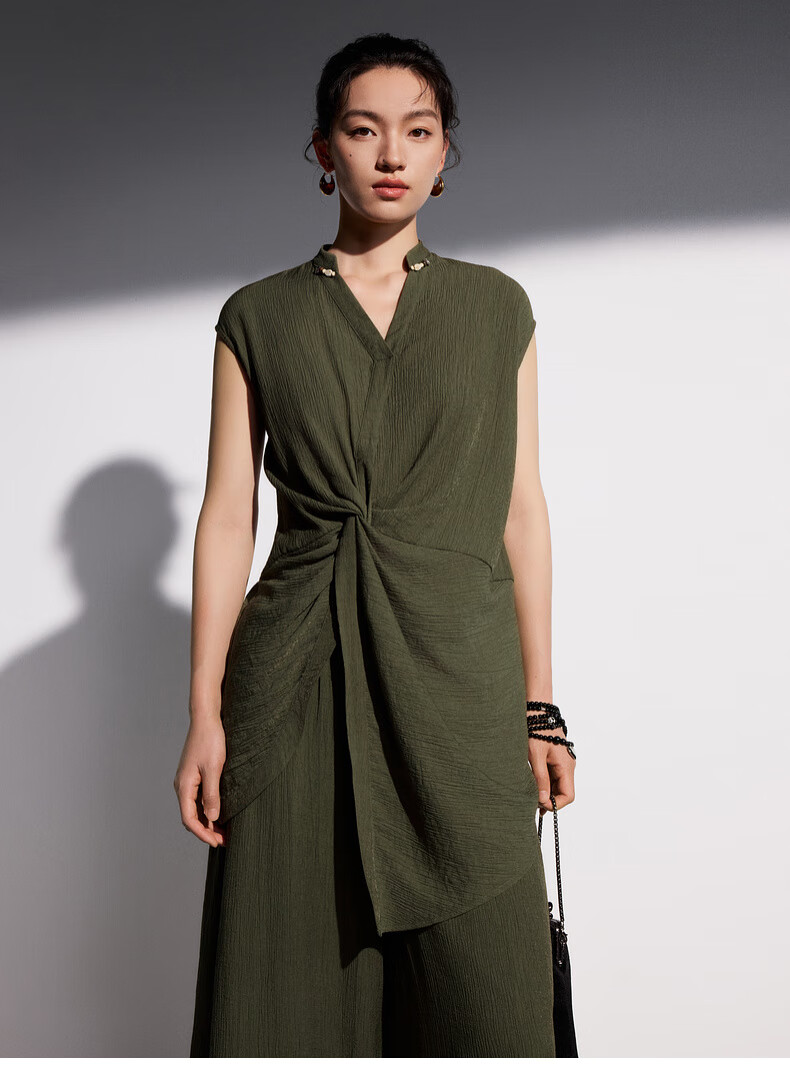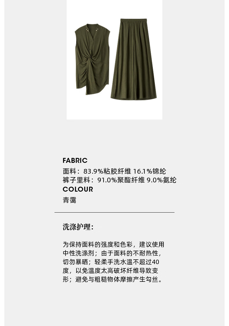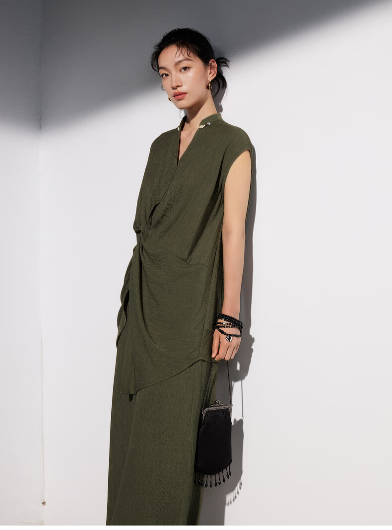 SUSHE Minimalism Textured Glossy V-neck Loose Sleeveless Top Straight Pants Suit Qing Hao-Top S