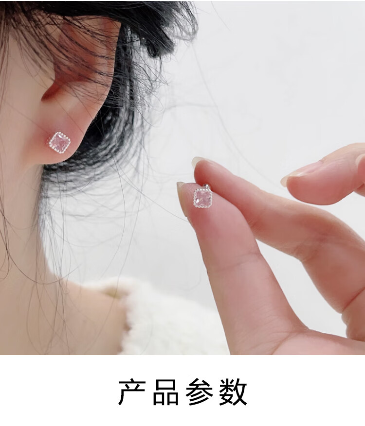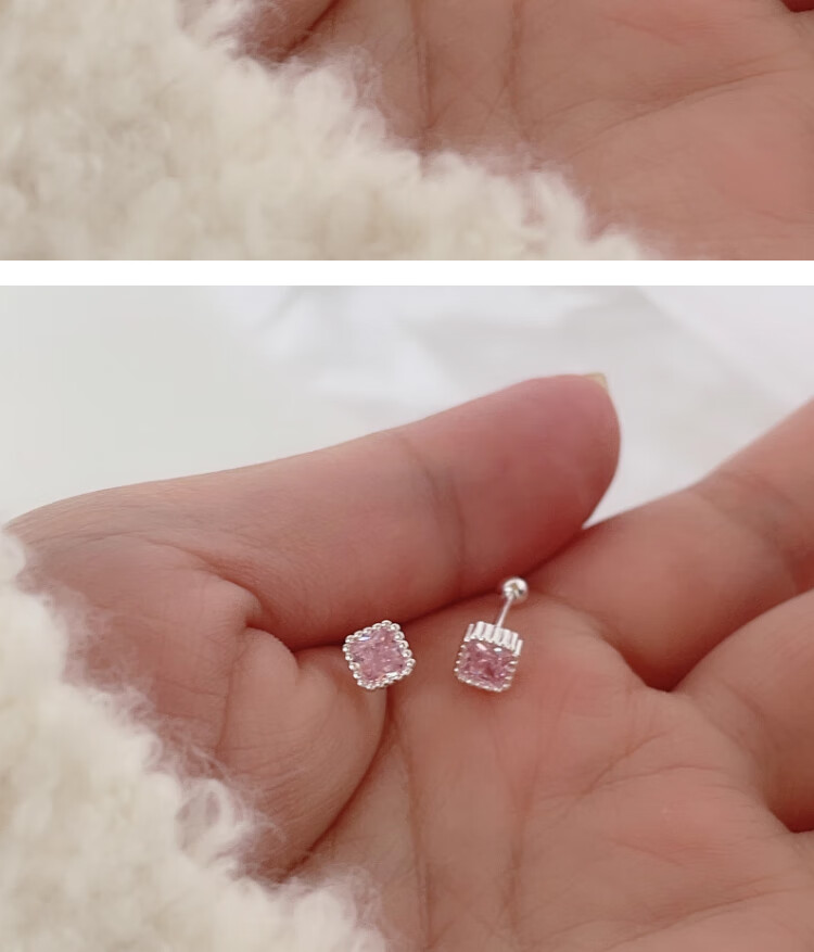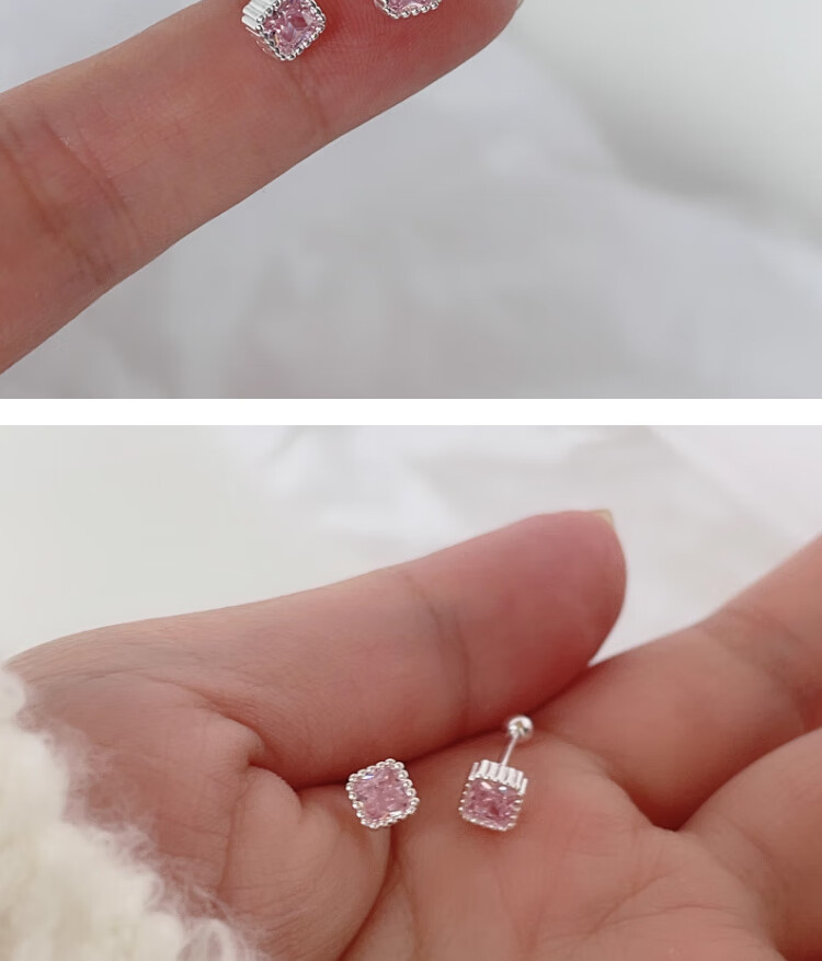 Xinshe s999 sterling silver pink small square diamond earrings for women, simple, compact, easy-to-take-off earrings for sleeping, pure silver, sweet and exquisite earrings, a pair of pink small square diamond earrings