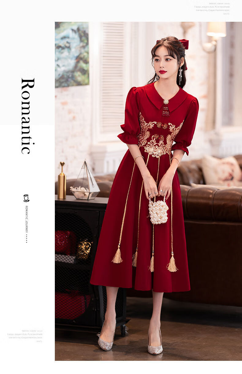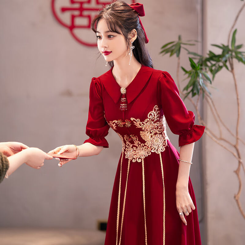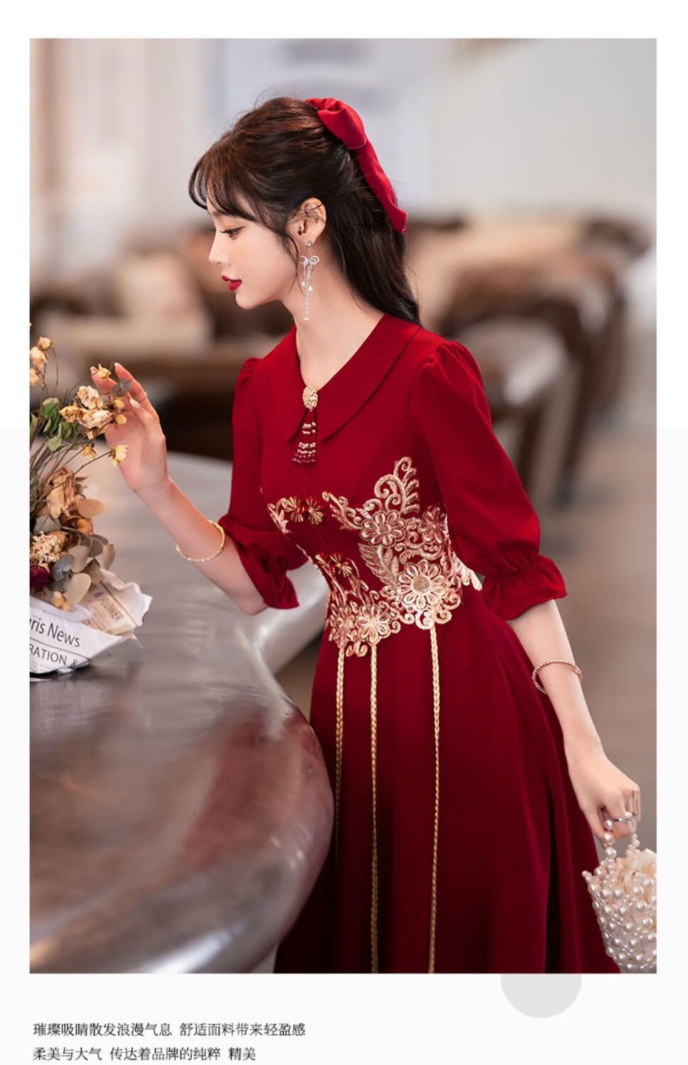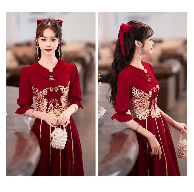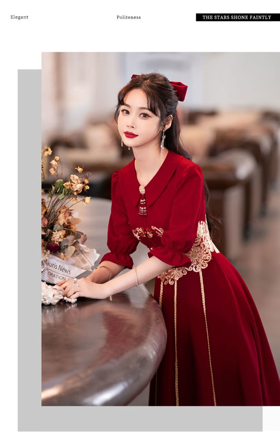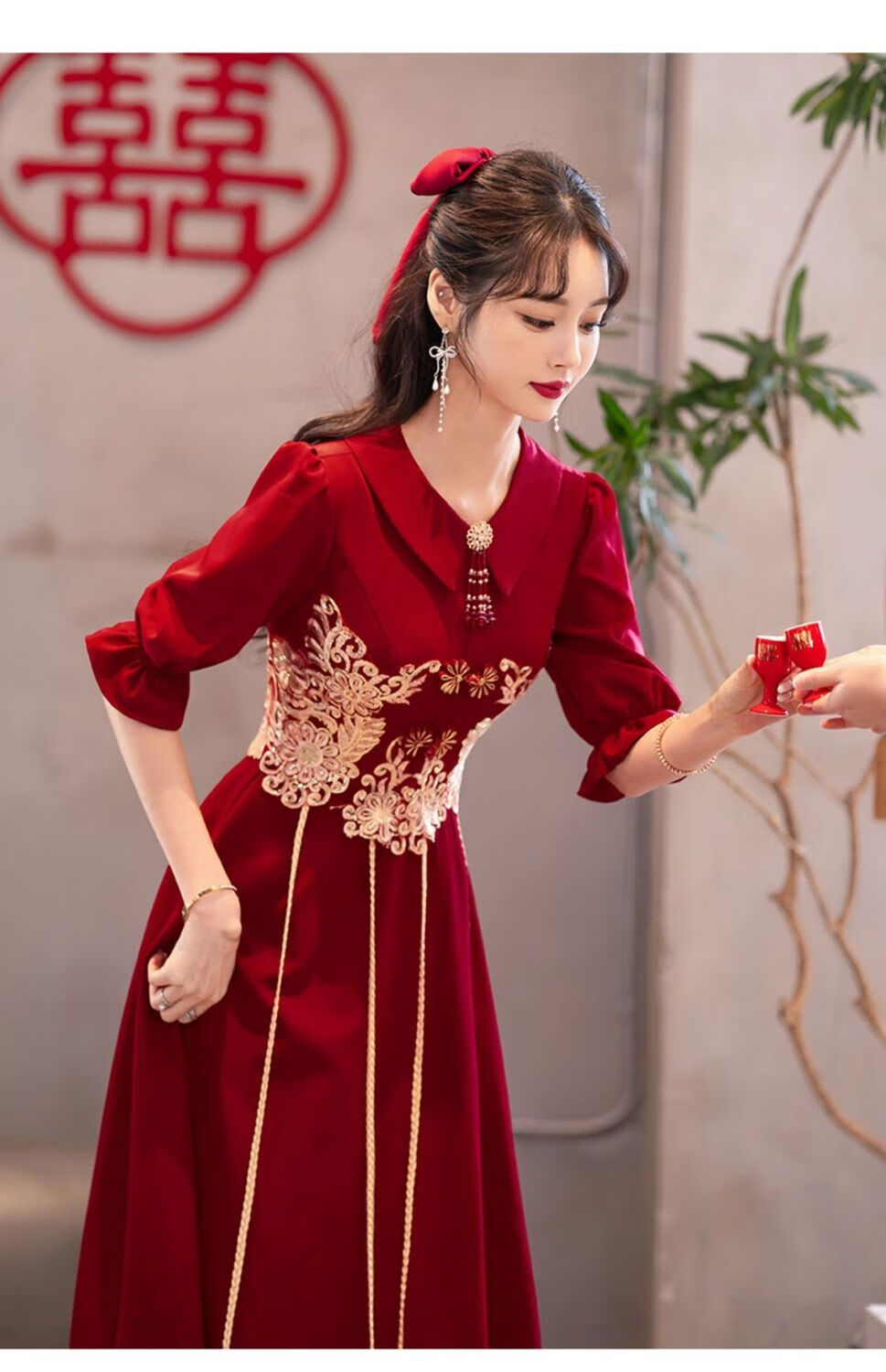 Tea girl's toasting dress bride's burgundy wedding engagement dress dress can be worn back to the house casual wear lapel spring and summer red M