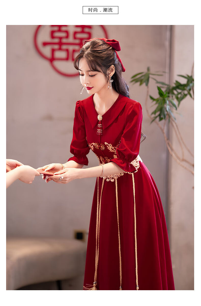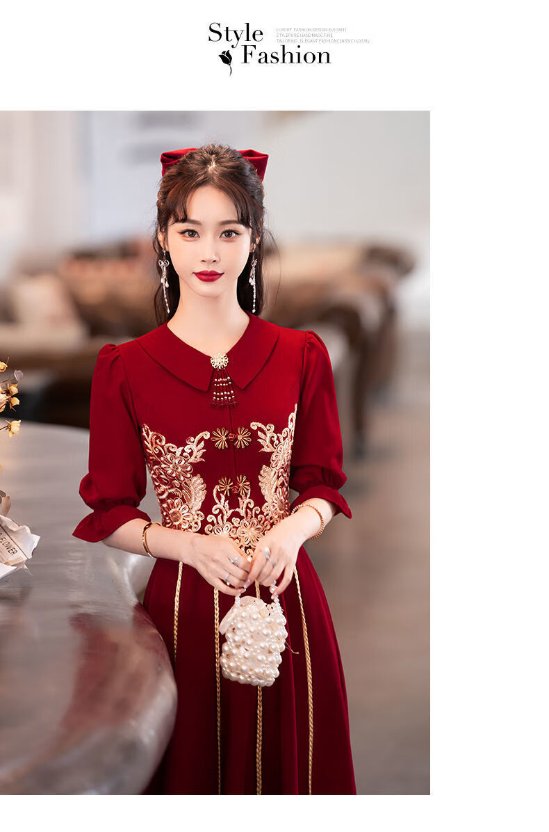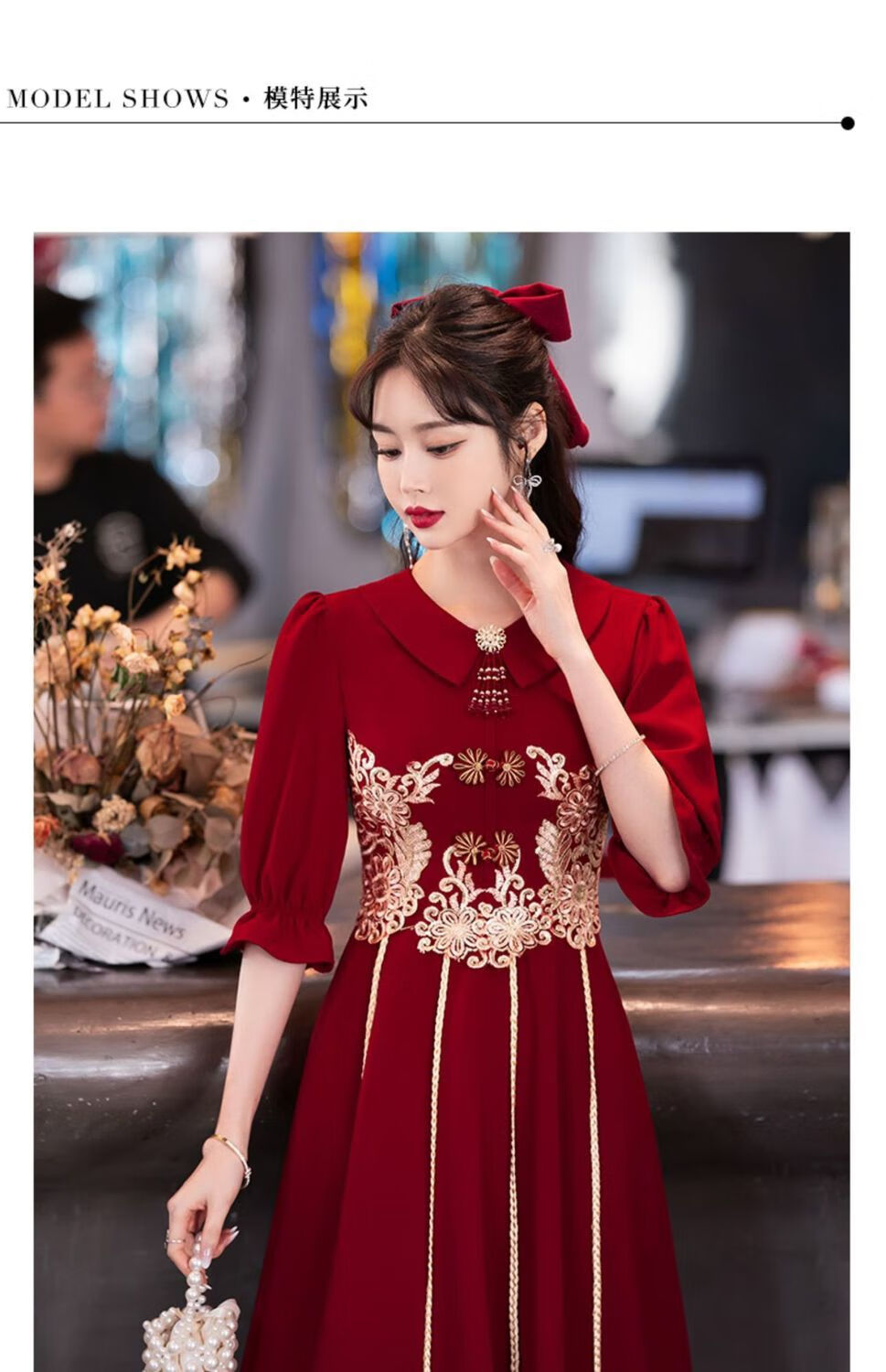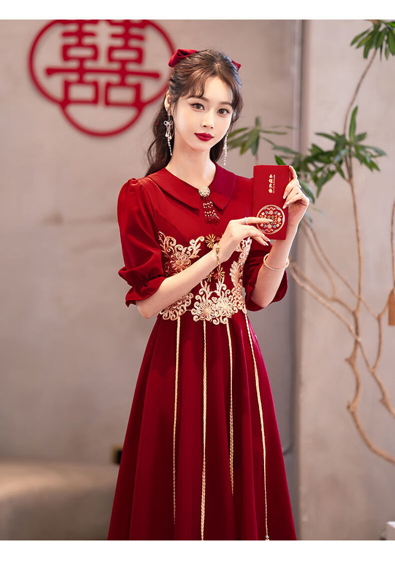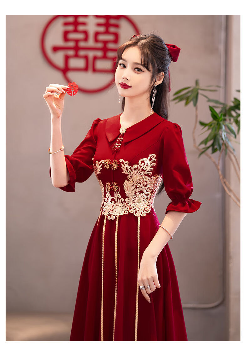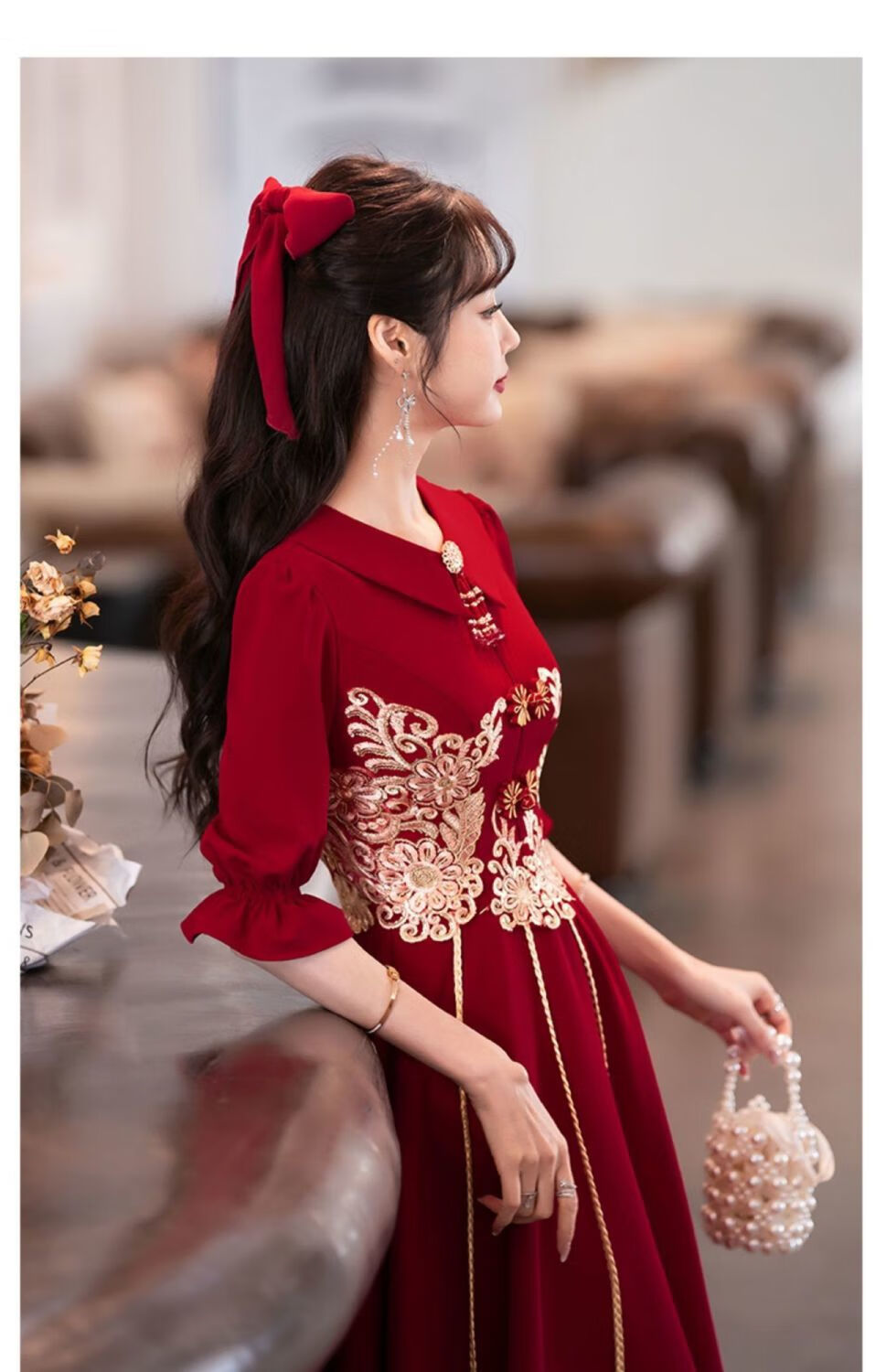Tea girl's toasting dress bride's burgundy wedding engagement dress dress can be worn back to the house casual wear lapel spring and summer red M