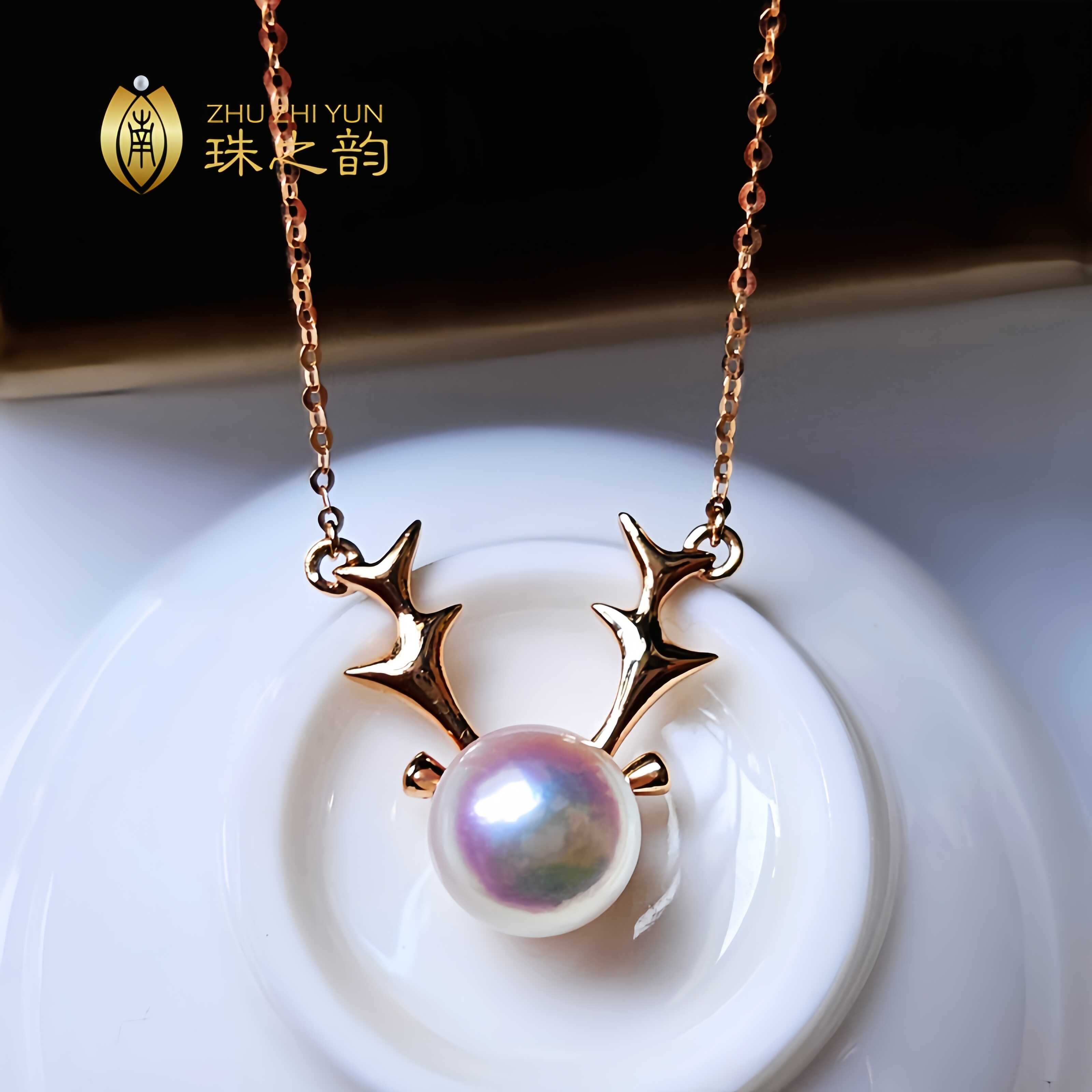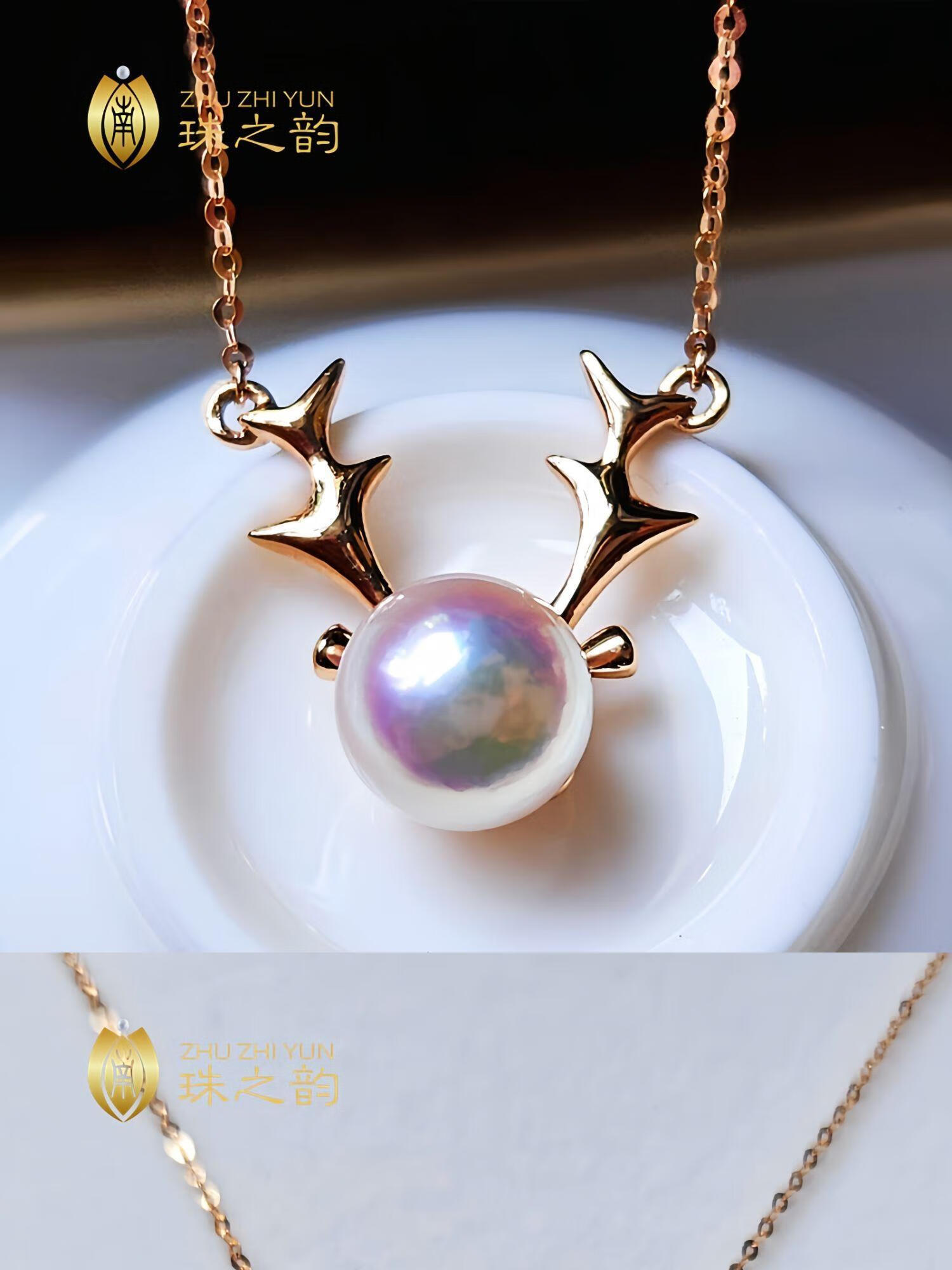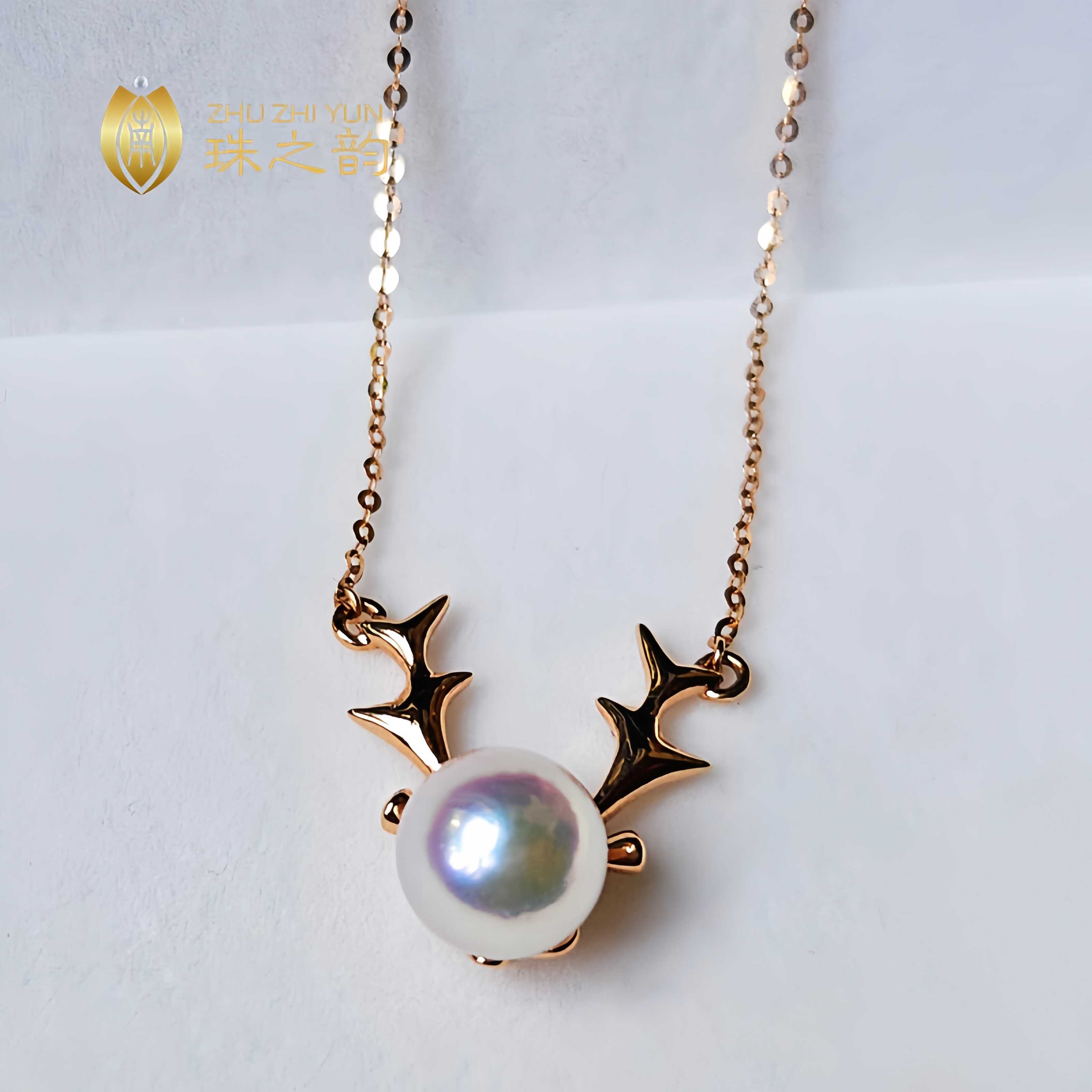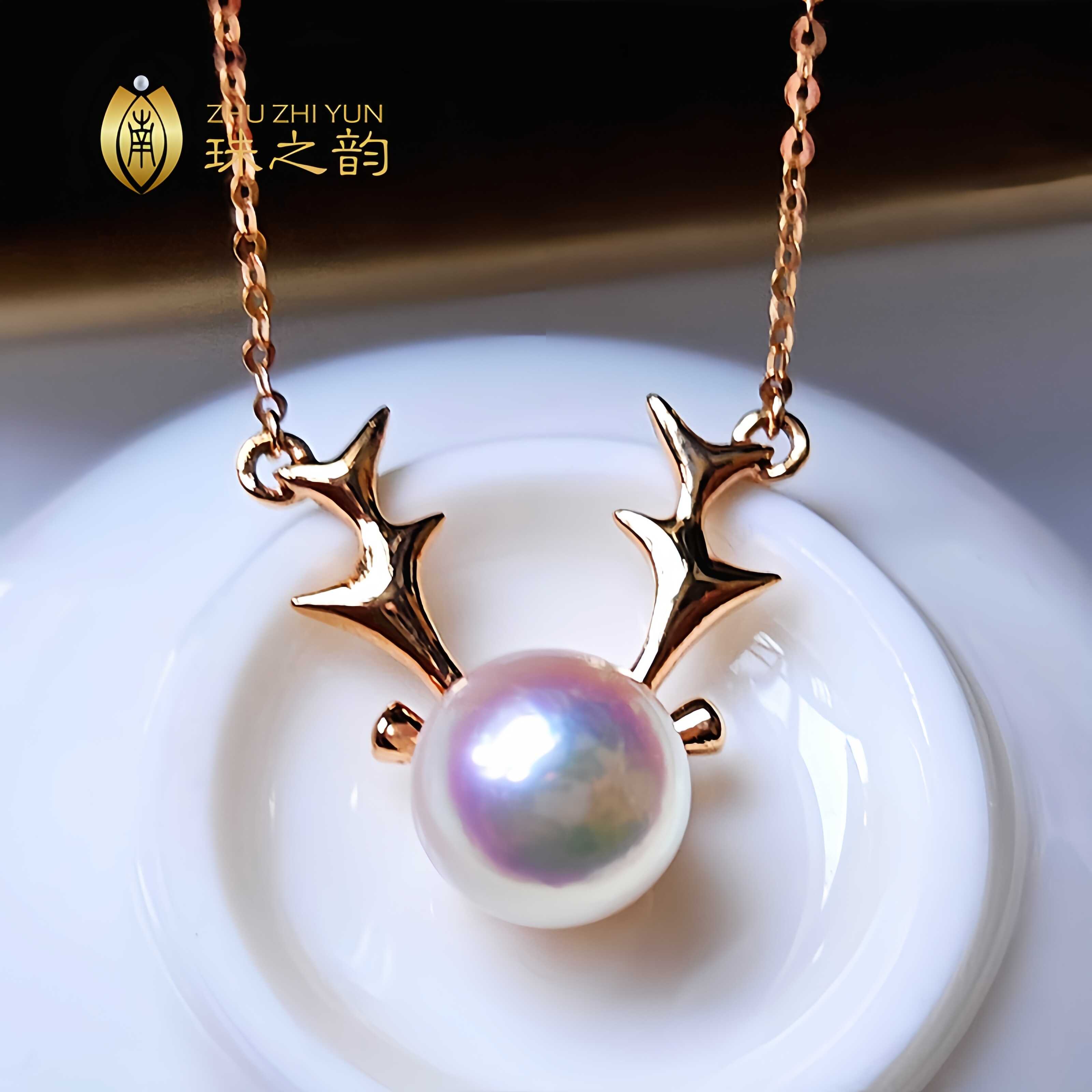 Only double aurora goddess Japanese akoya sea water pendant 18k rose gold antler necklace is round and fashionable 18k rose gold integrated chain + akoya flower beads 9.5-10mm
